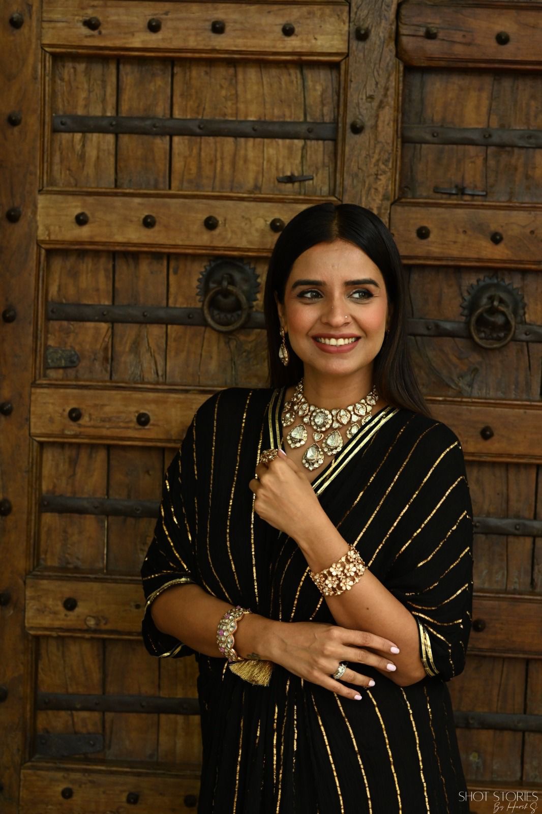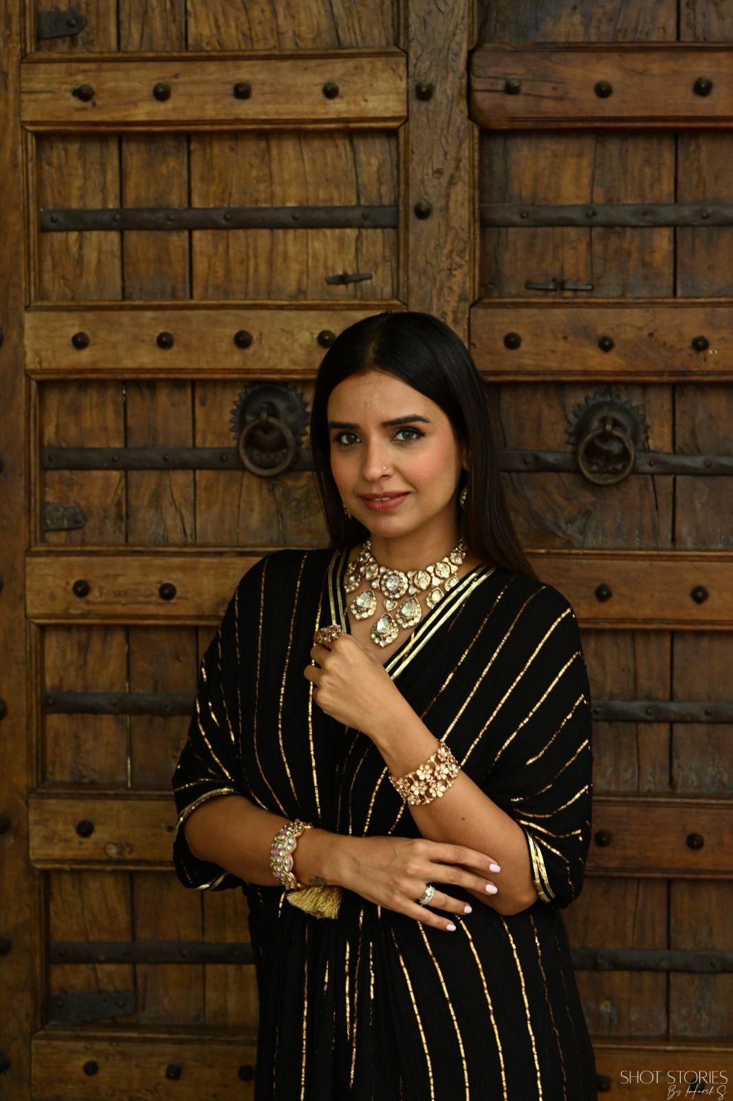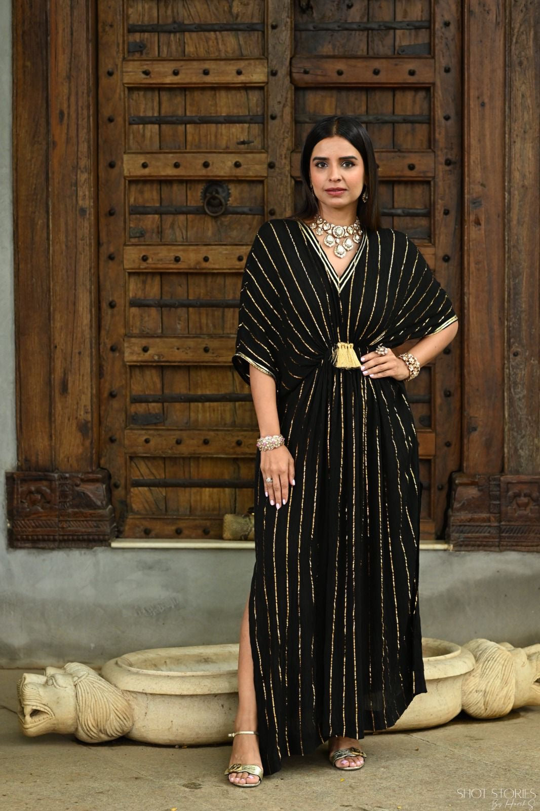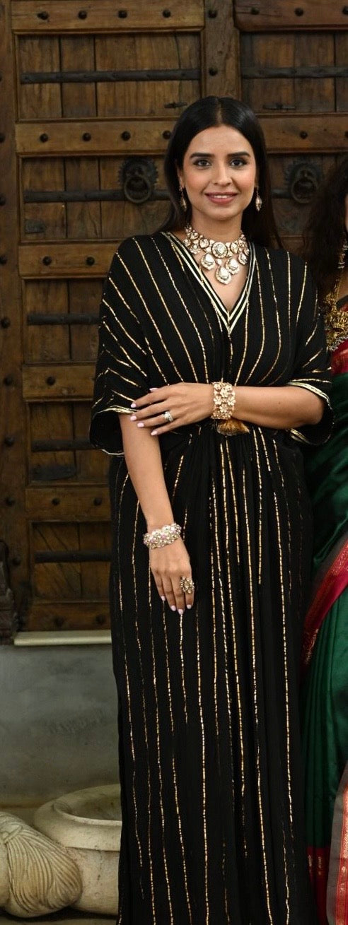 Le hold and behold! Our cult product arrives in a breathtaking Black! Style this ultra versatile kaftan with heavy polki choker for the festivities. Make a sure shot statement in this head turner