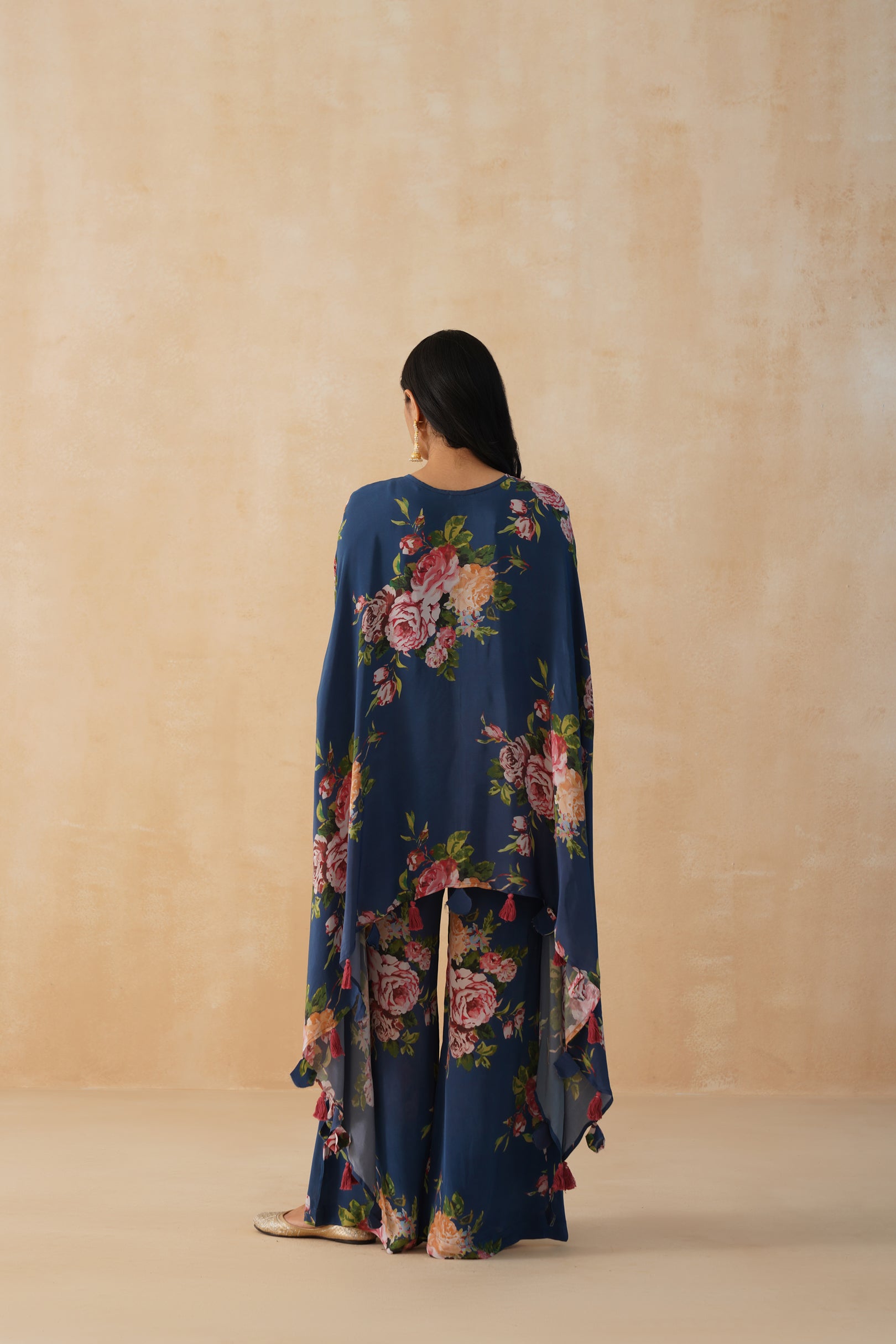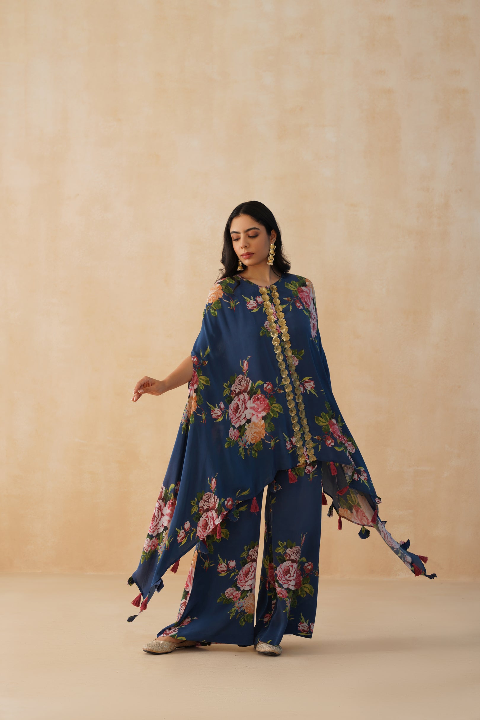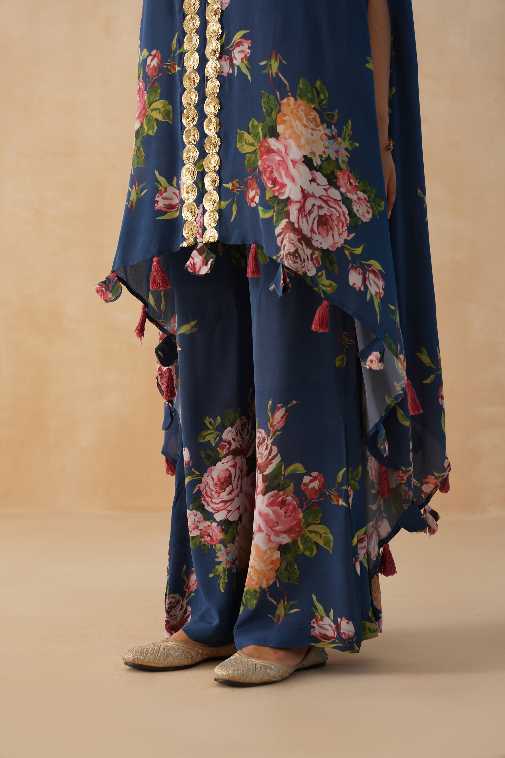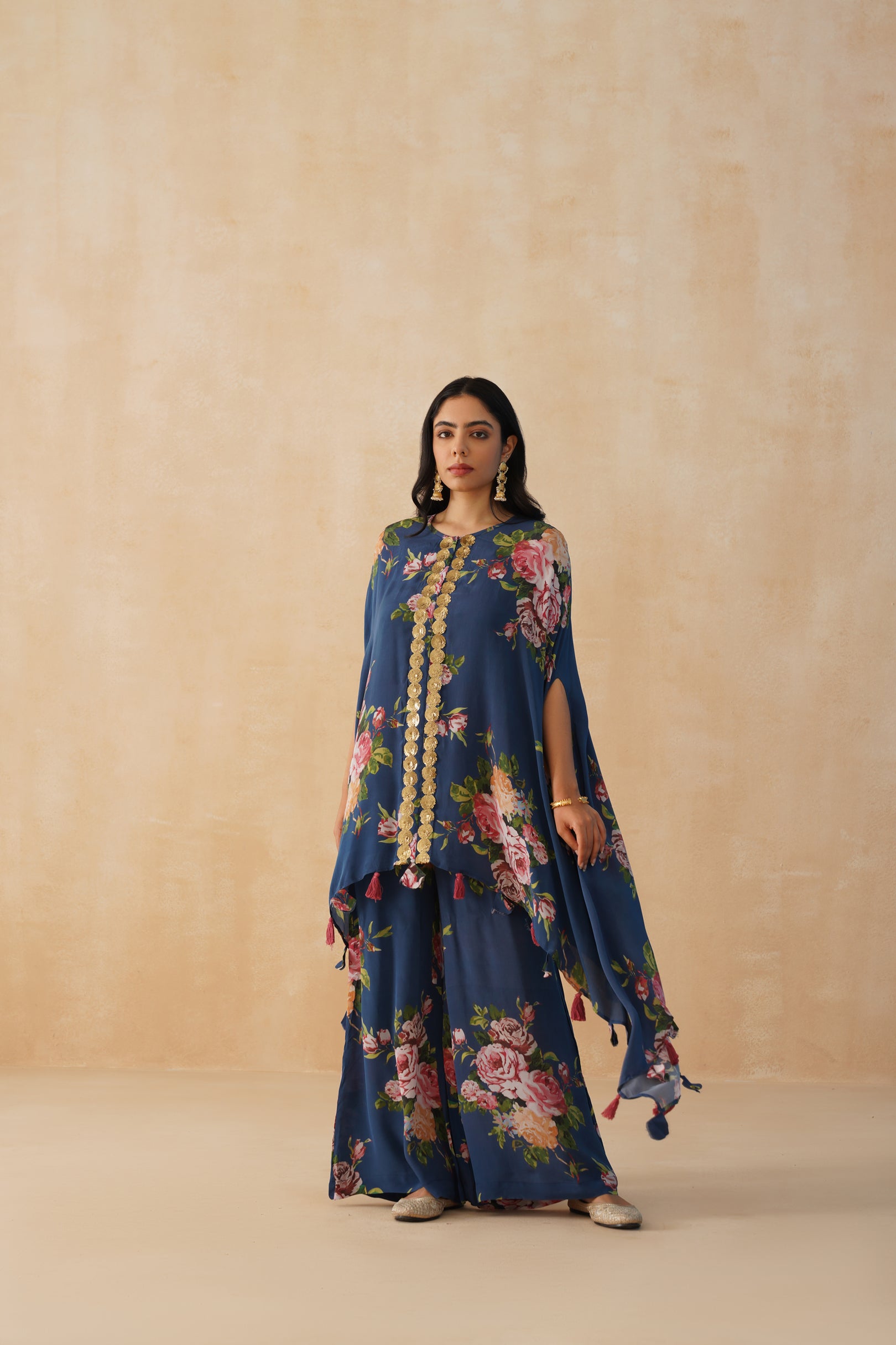 Details: Floral Cape style top with intricate gold detailing. Paired with comfortable wide leg pants.