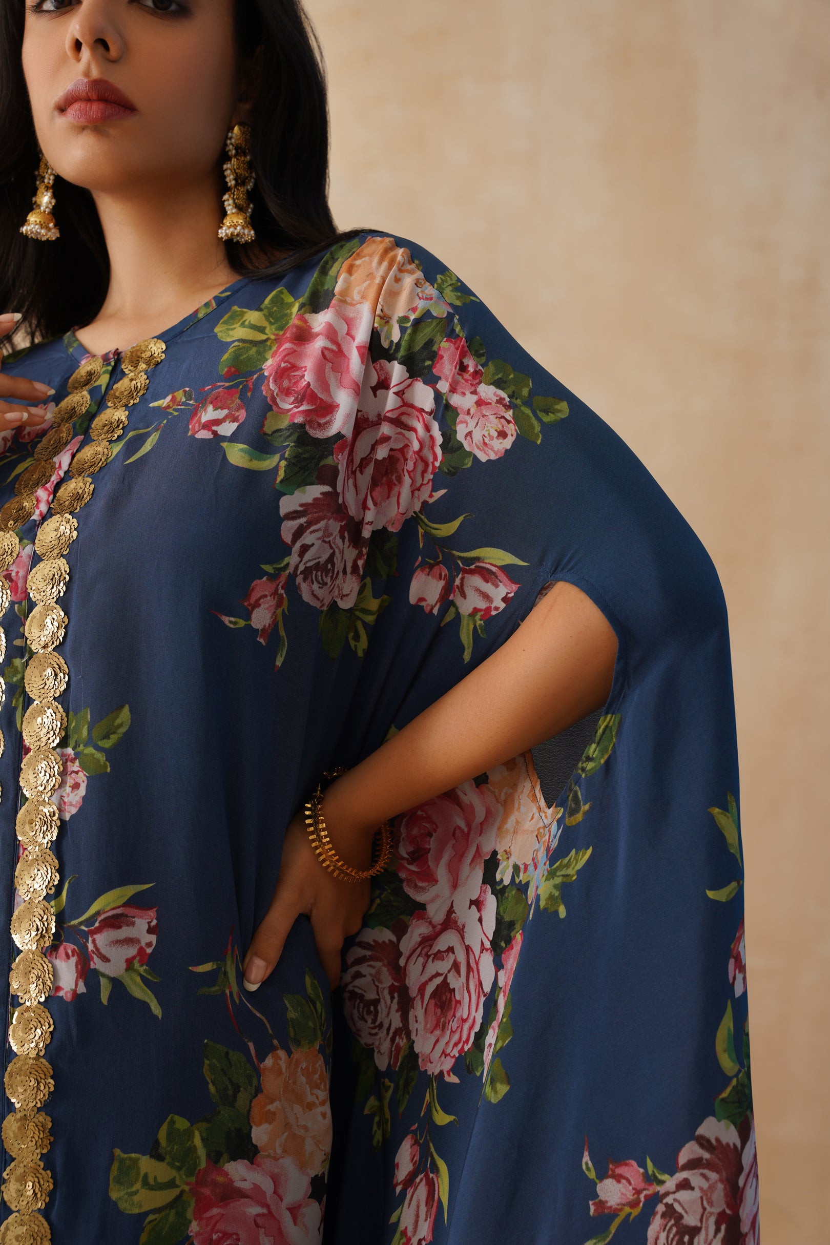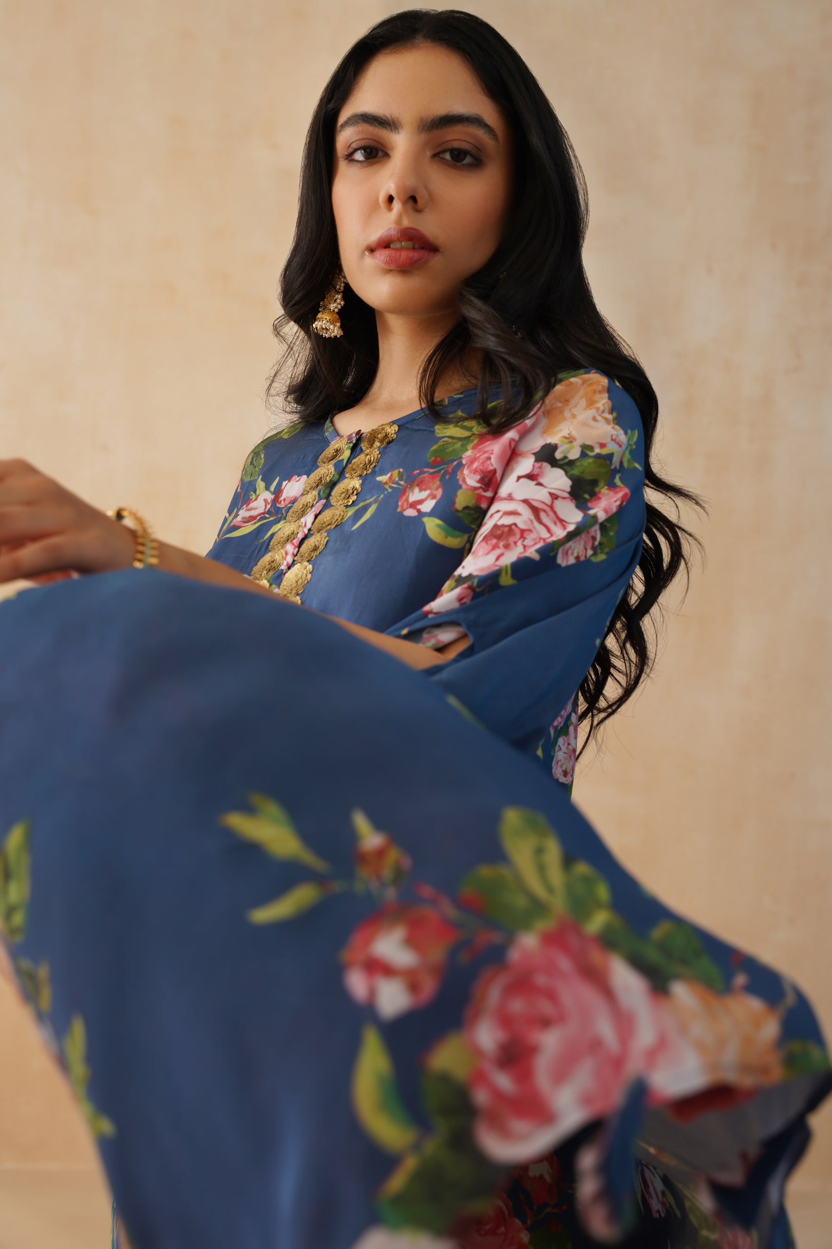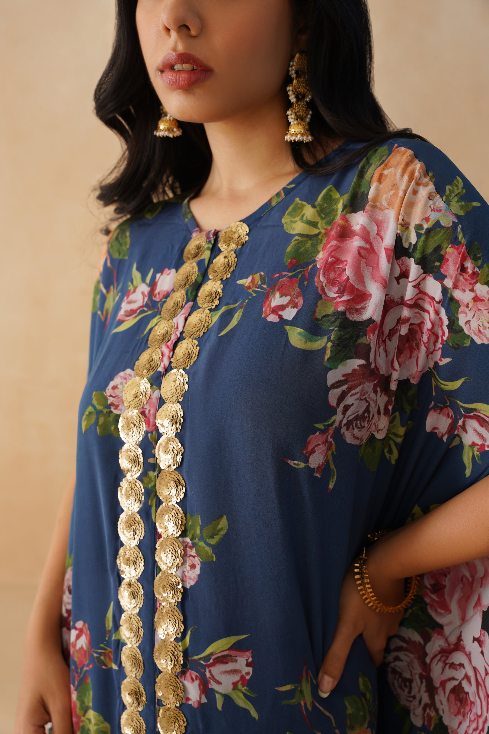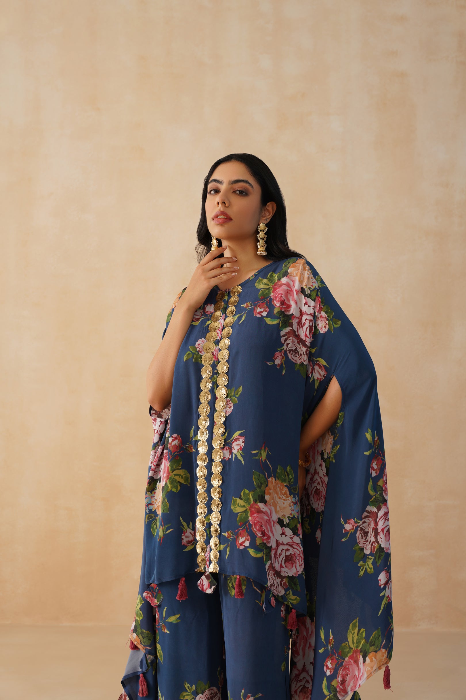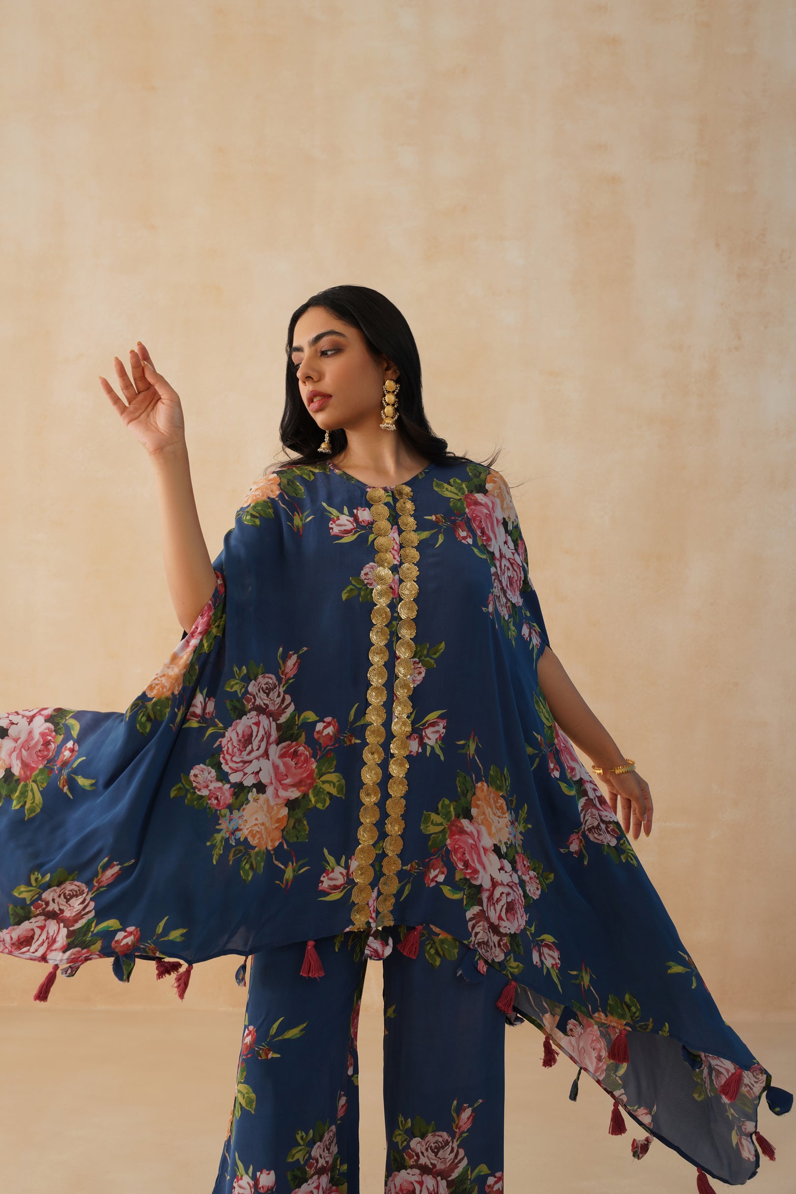 Details: Floral Cape style top with intricate gold detailing. Paired with comfortable wide leg pants.