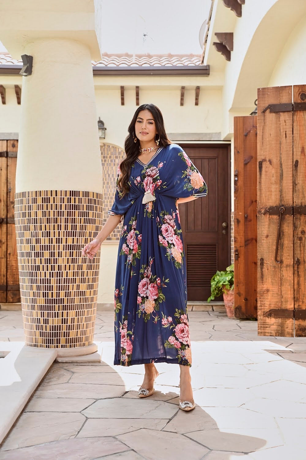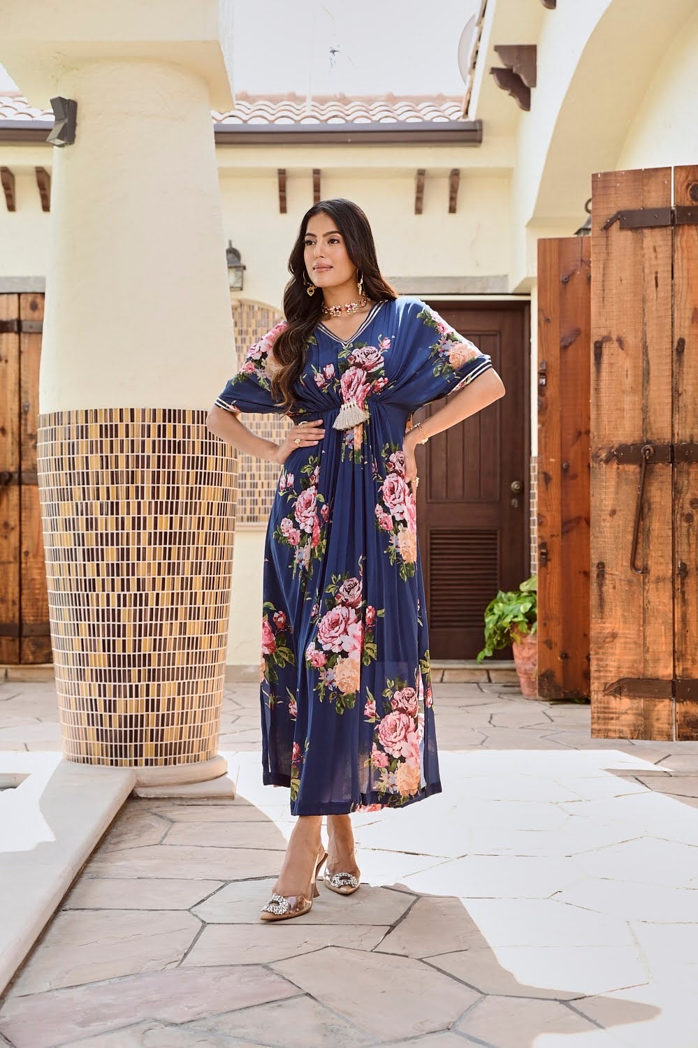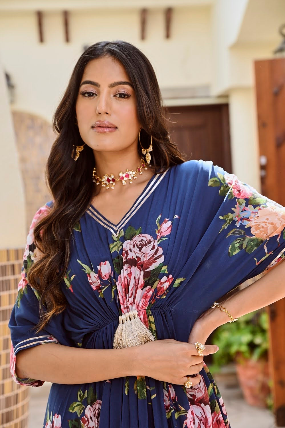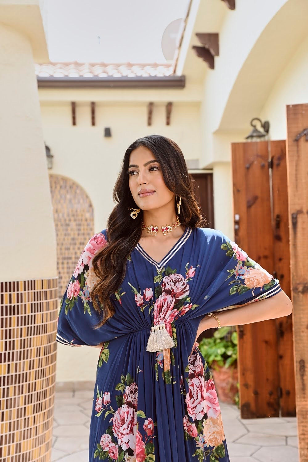 This vivid printed Kaftan Dress is a sure shot head turner this festive season. Style it with polki jewelry and mojaris for a Mehndi celebration. Or wear it with statement gold hoops and gladiators for a beach soiree. A must have piece in your wardrobe. It come with a soft cotton slip.