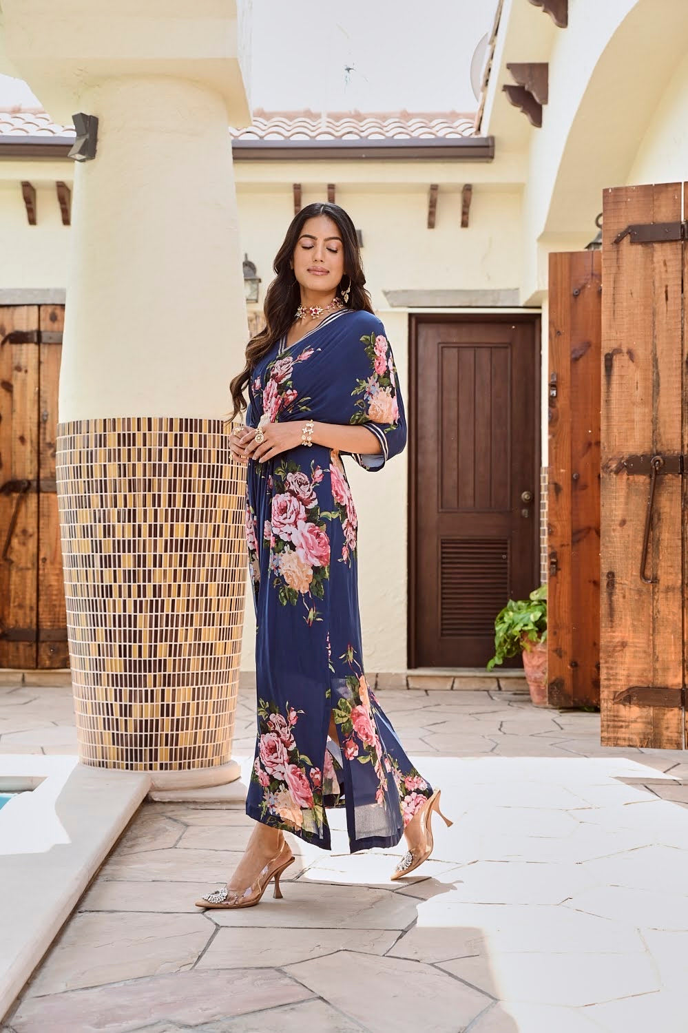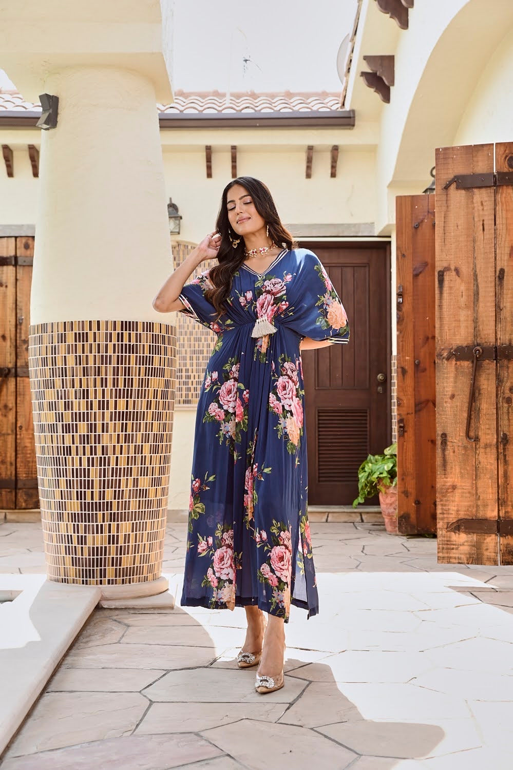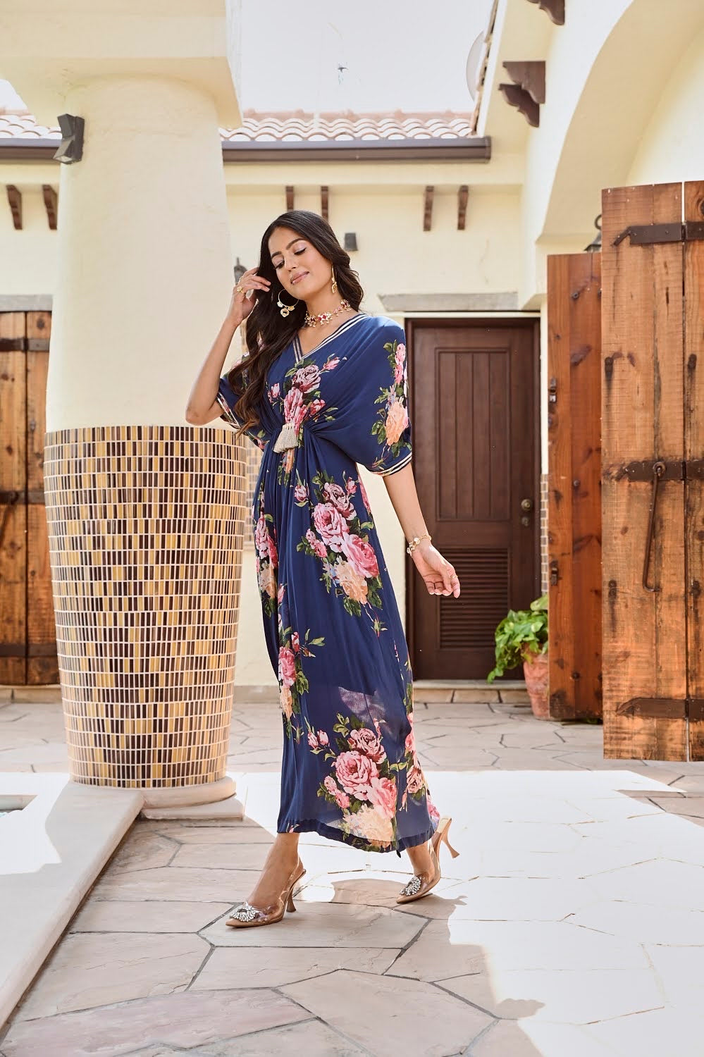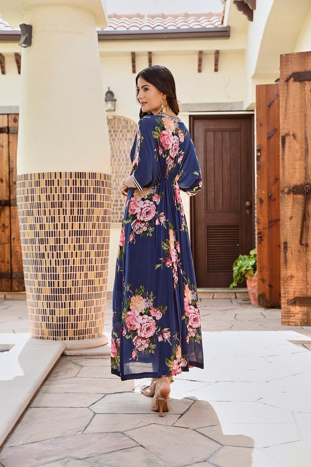 This vivid printed Kaftan Dress is a sure shot head turner this festive season. Style it with polki jewelry and mojaris for a Mehndi celebration. Or wear it with statement gold hoops and gladiators for a beach soiree. A must have piece in your wardrobe. It come with a soft cotton slip.
