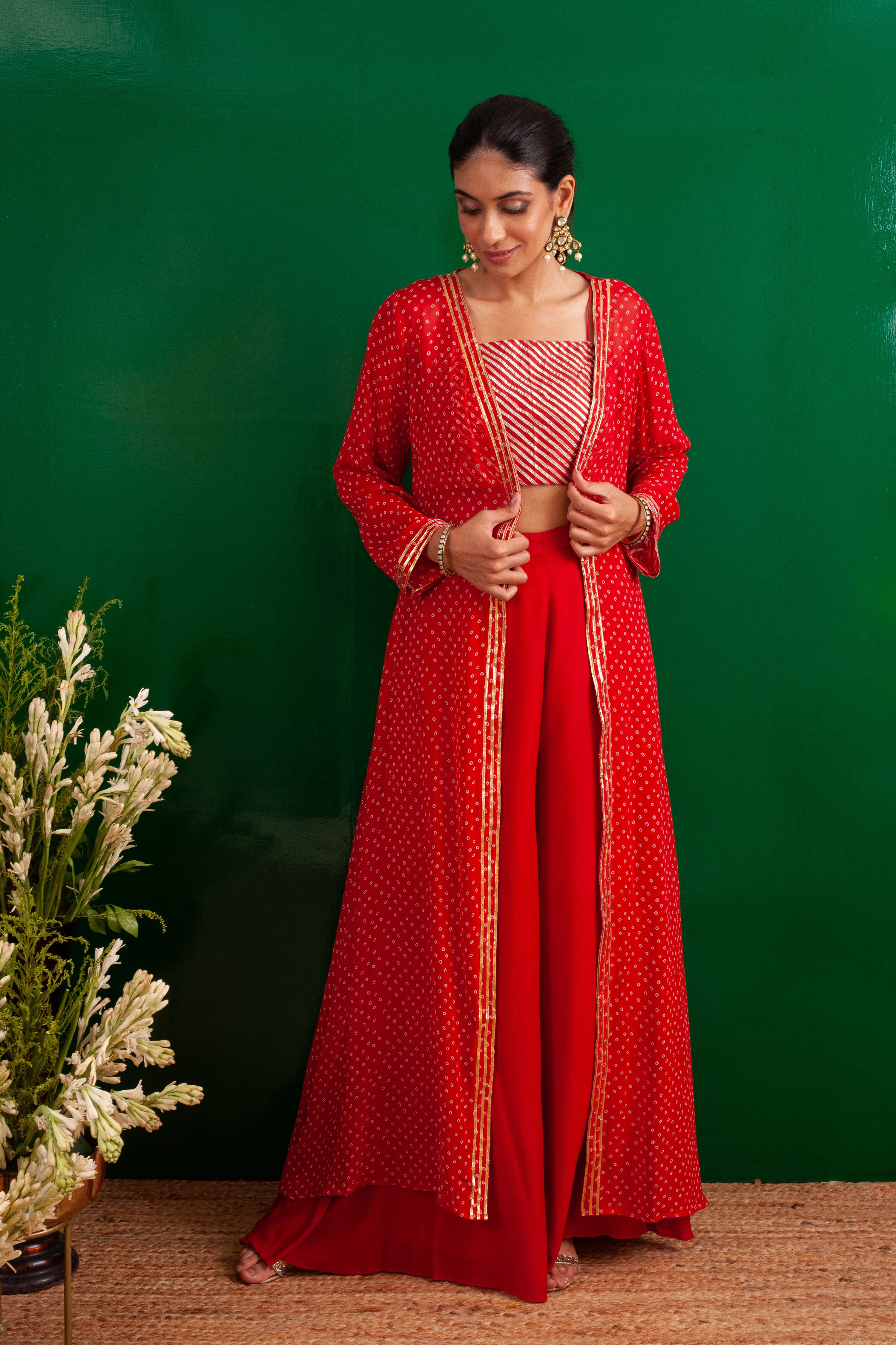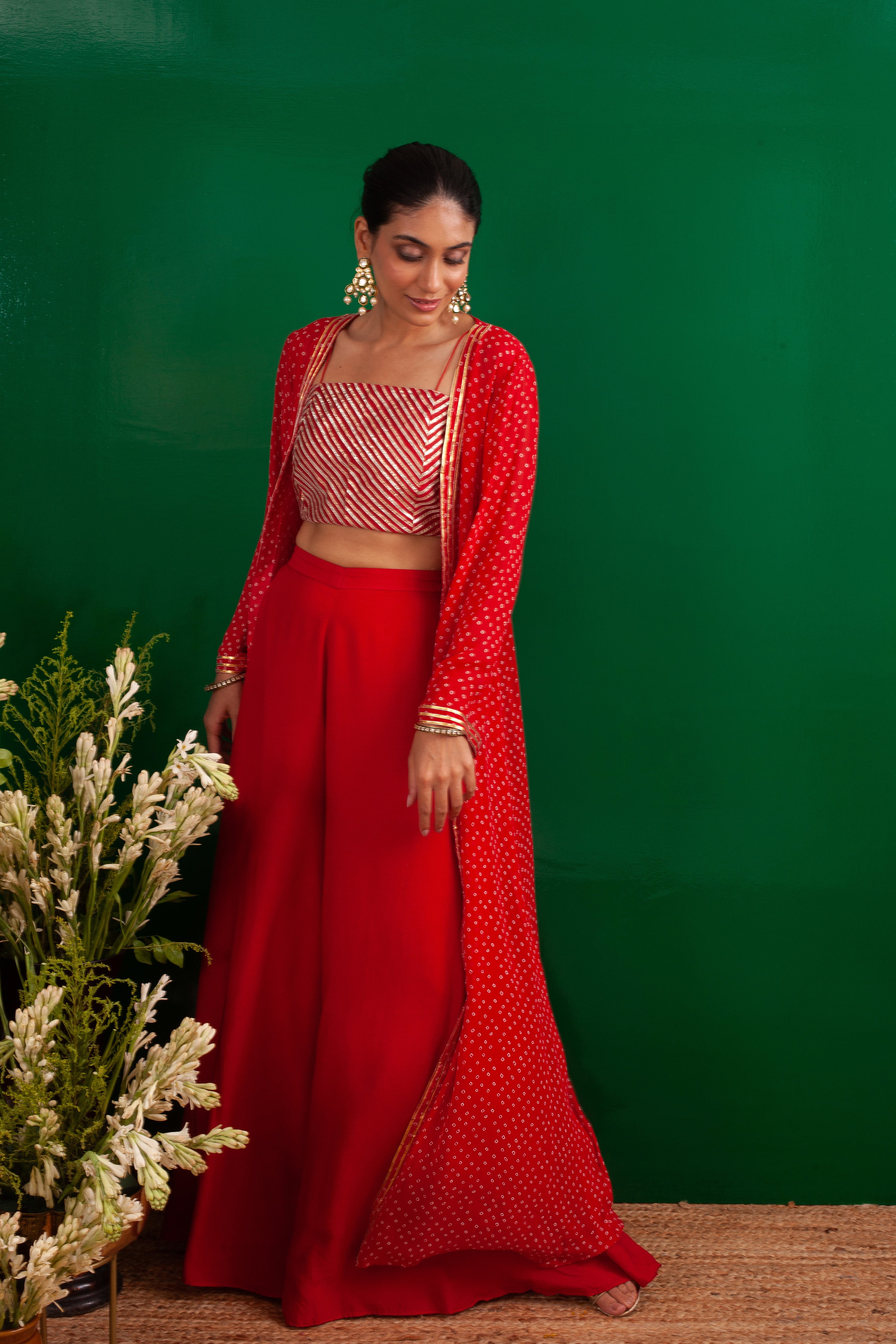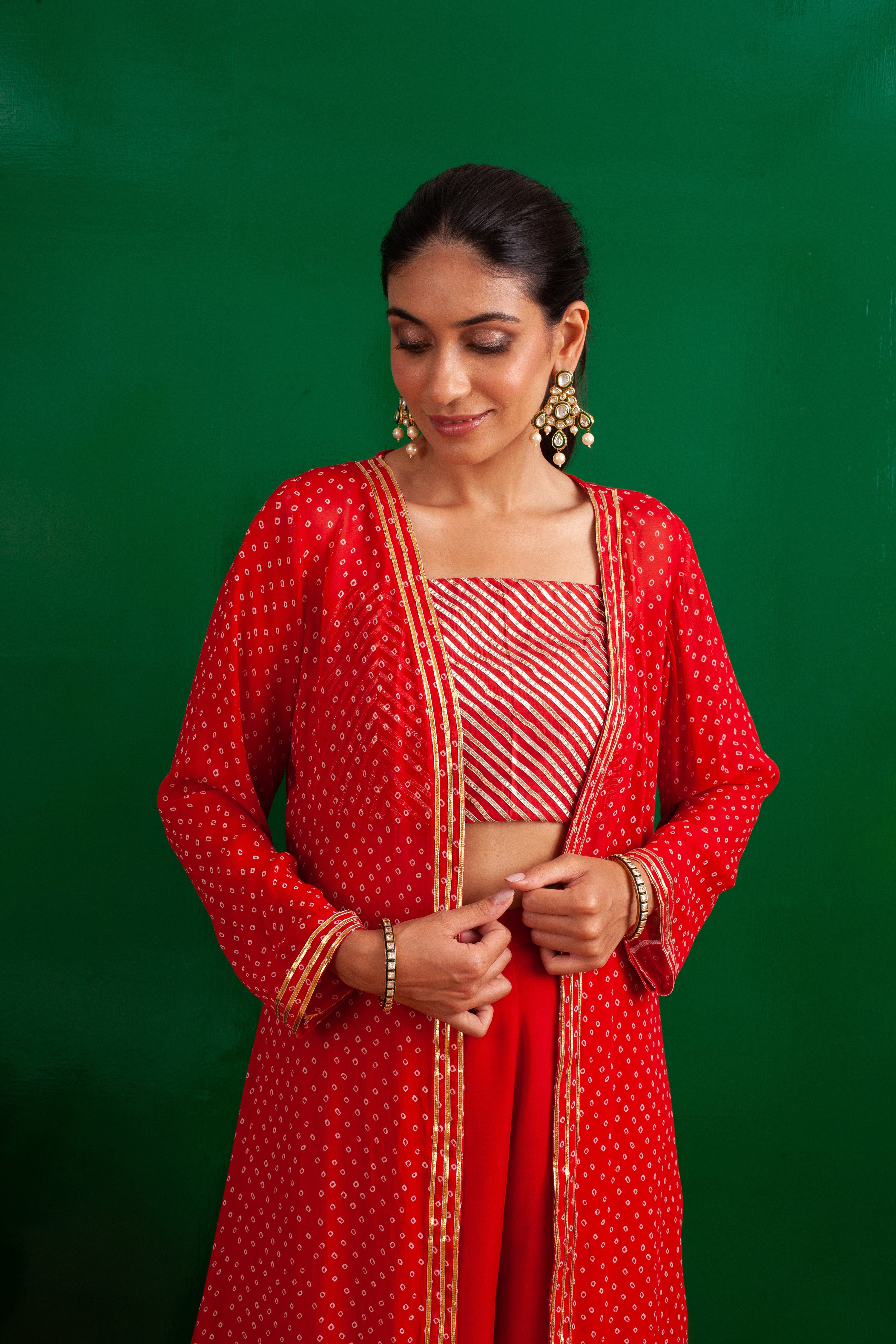 RED BANDHANI NAAZ JACKET WITH CROP TOP AND PALLAZO PANTS