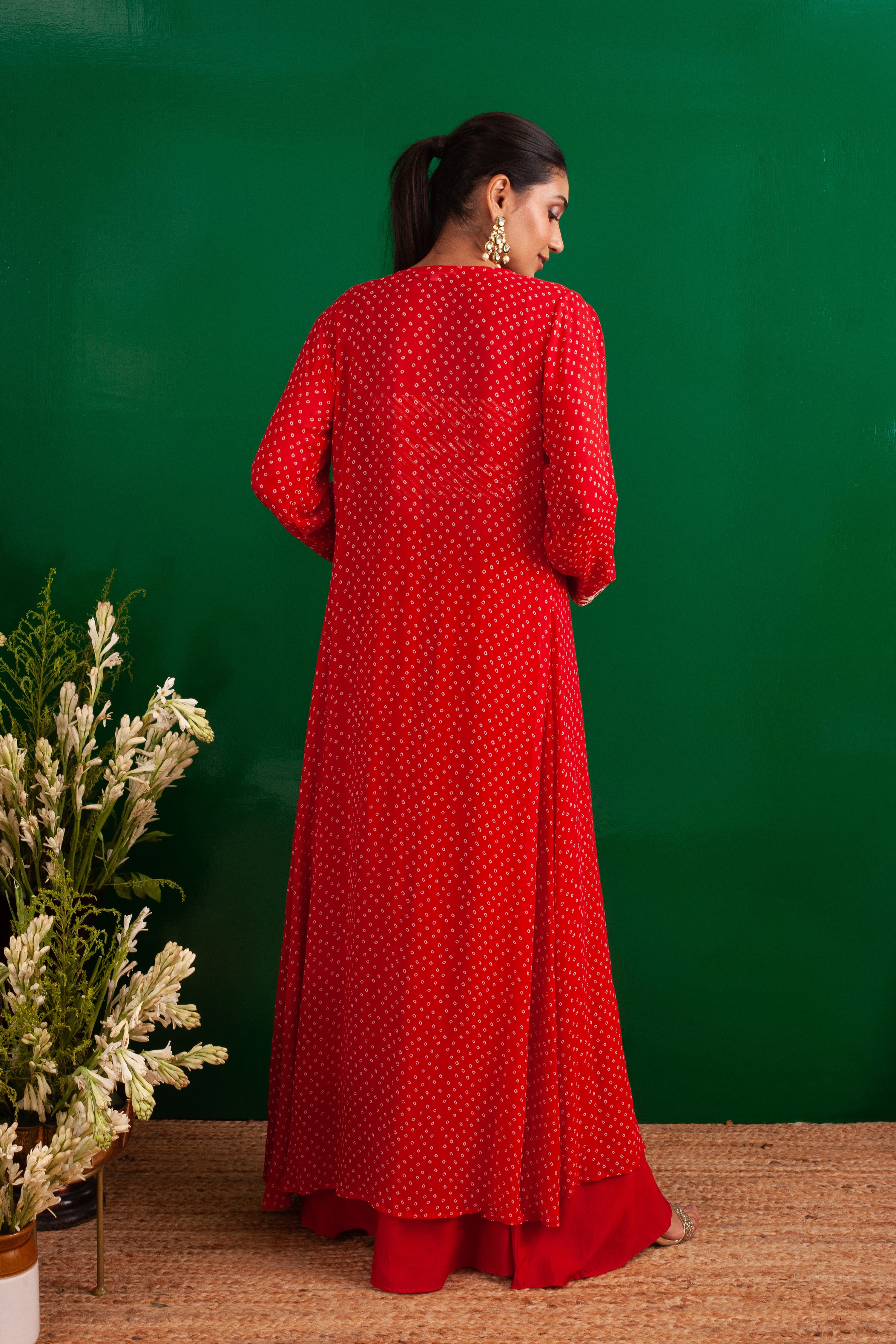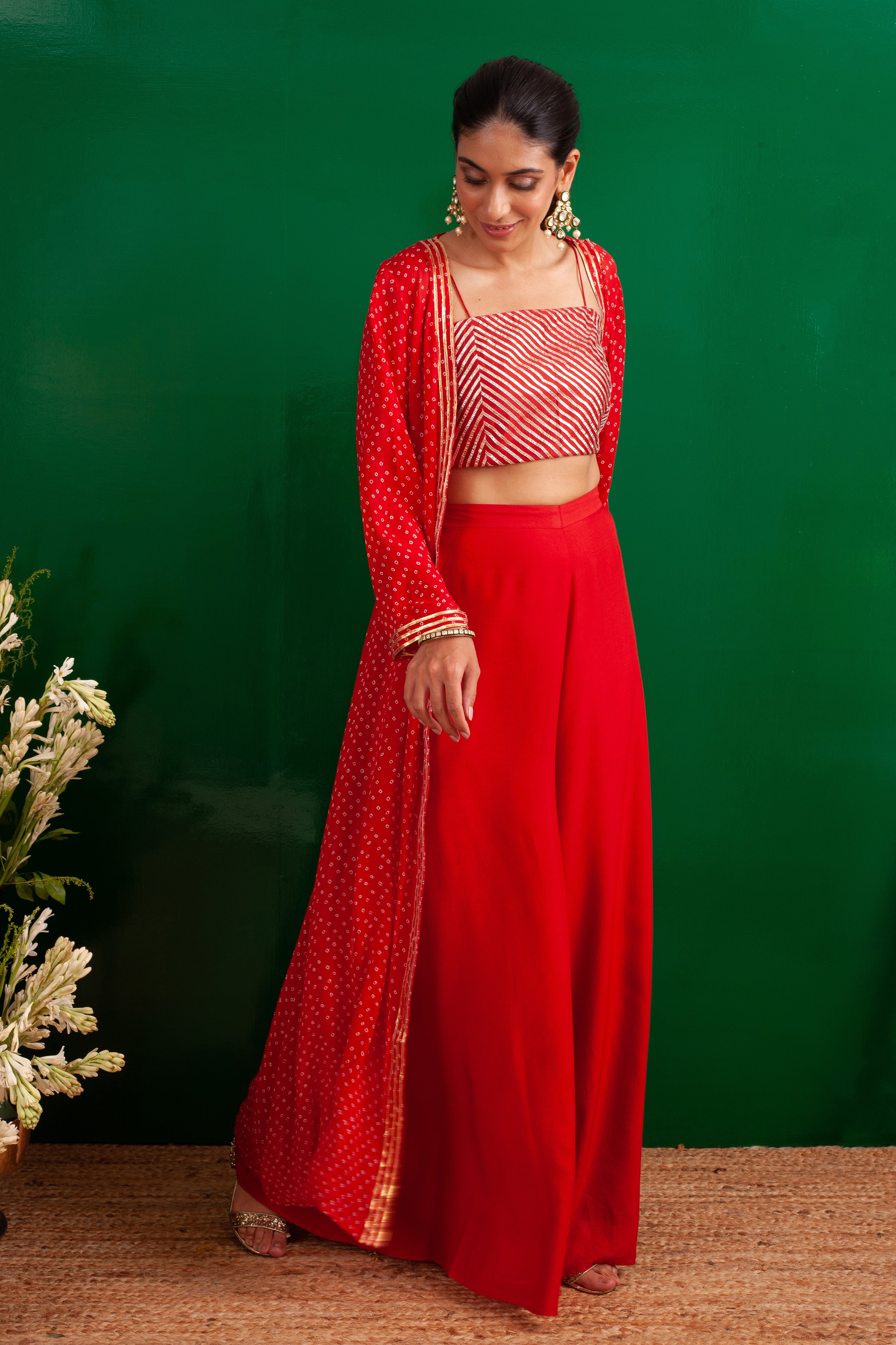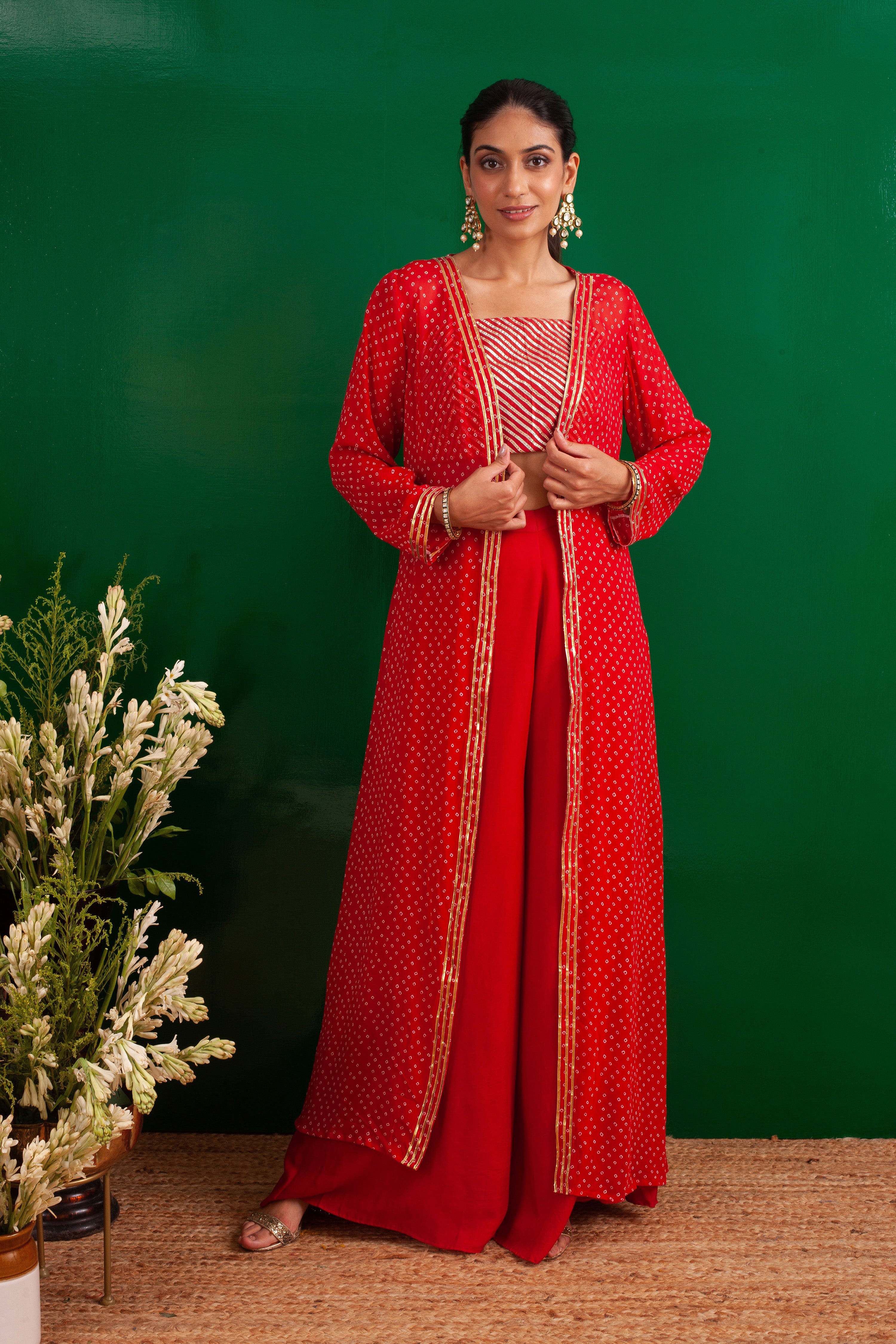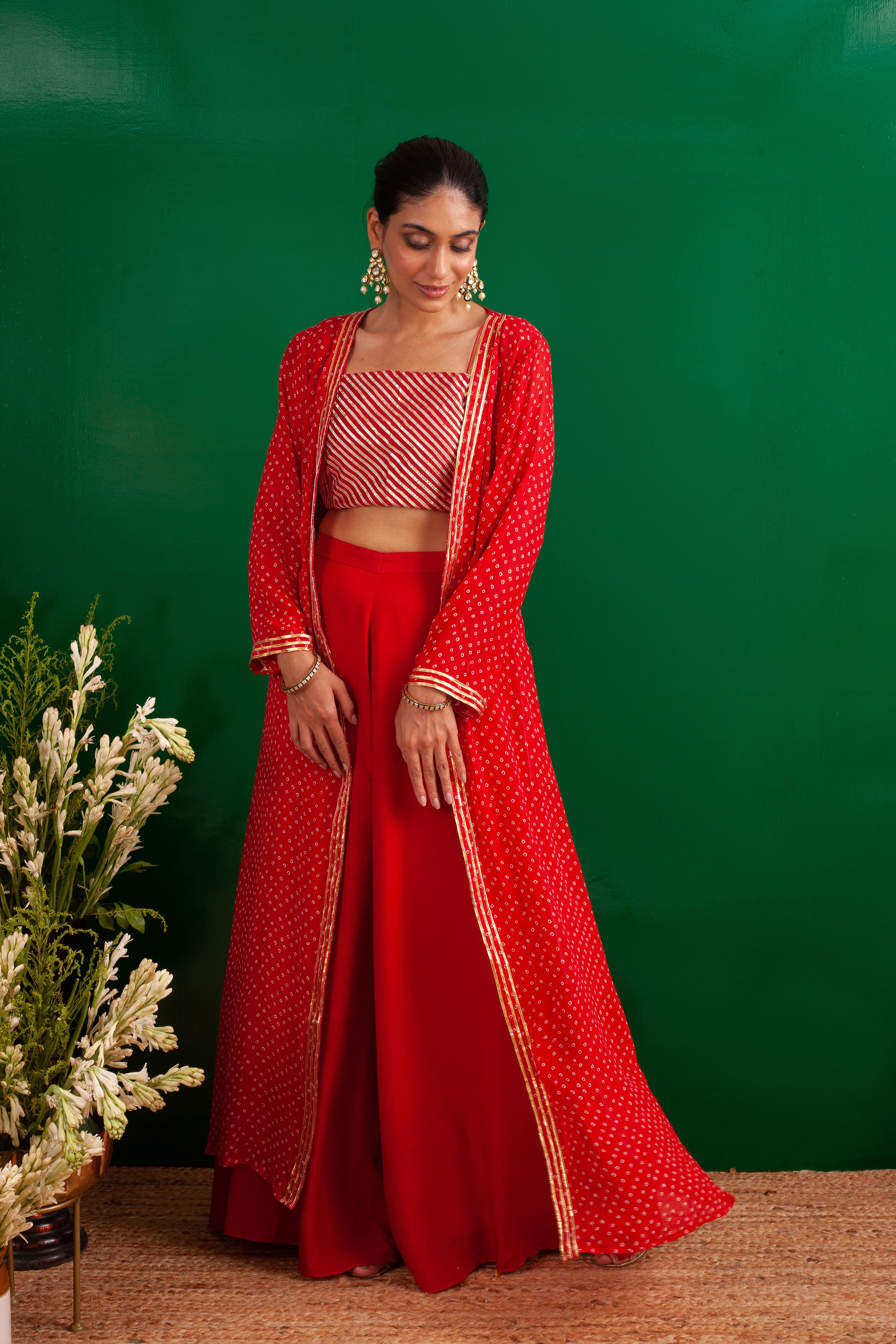 RED BANDHANI NAAZ JACKET WITH CROP TOP AND PALLAZO PANTS