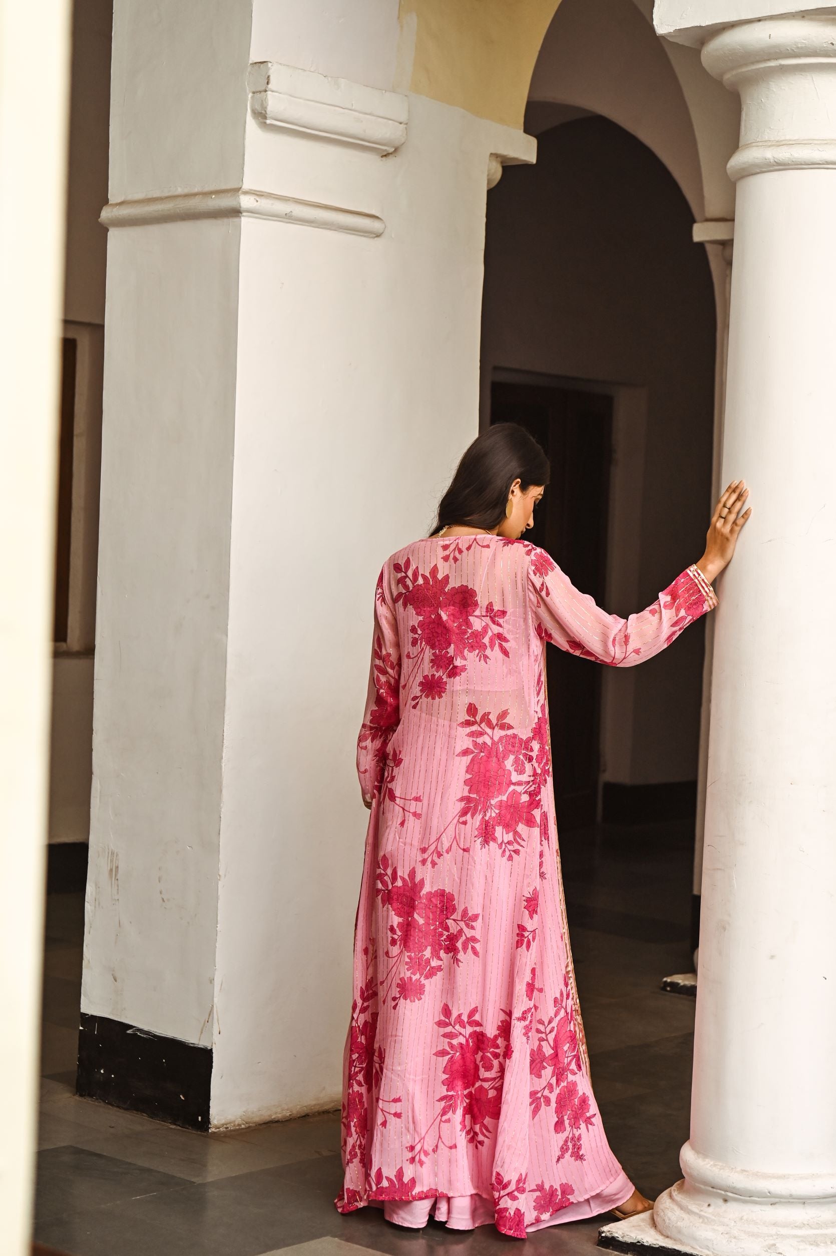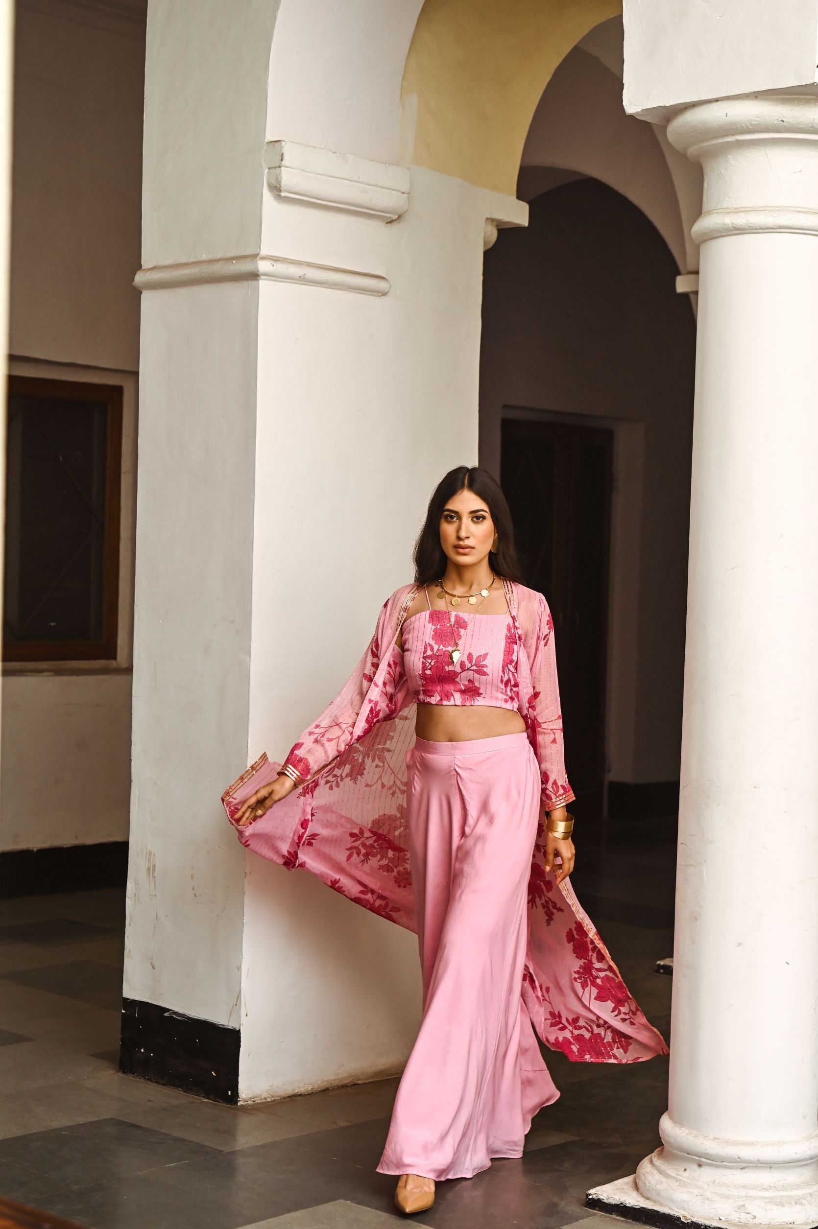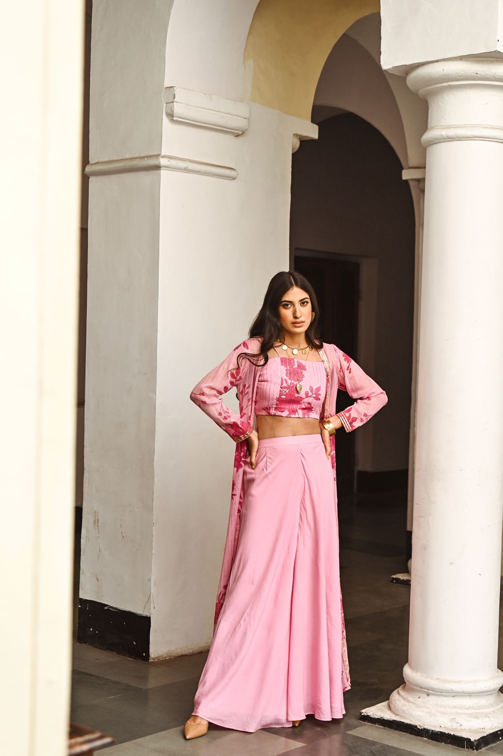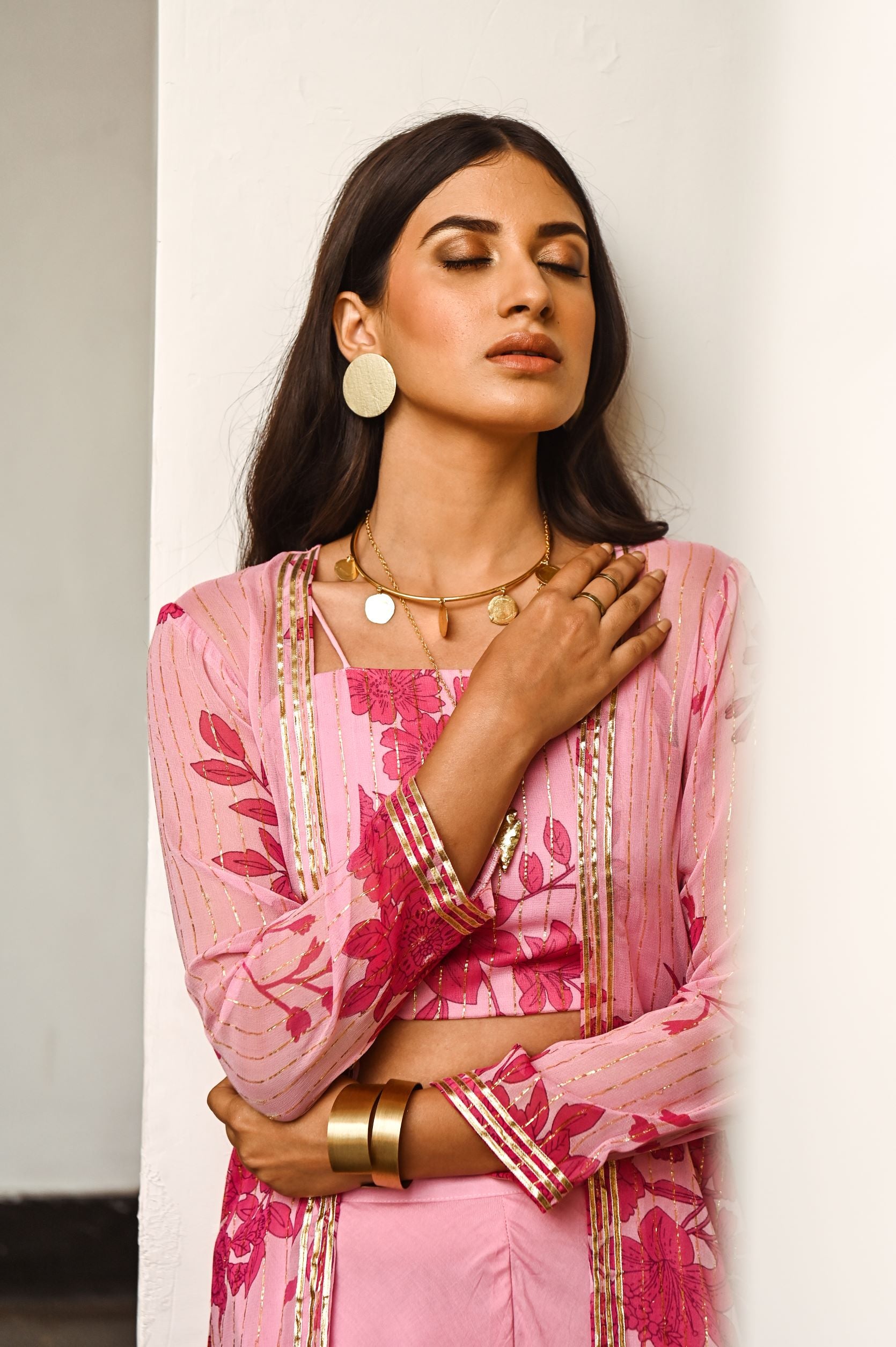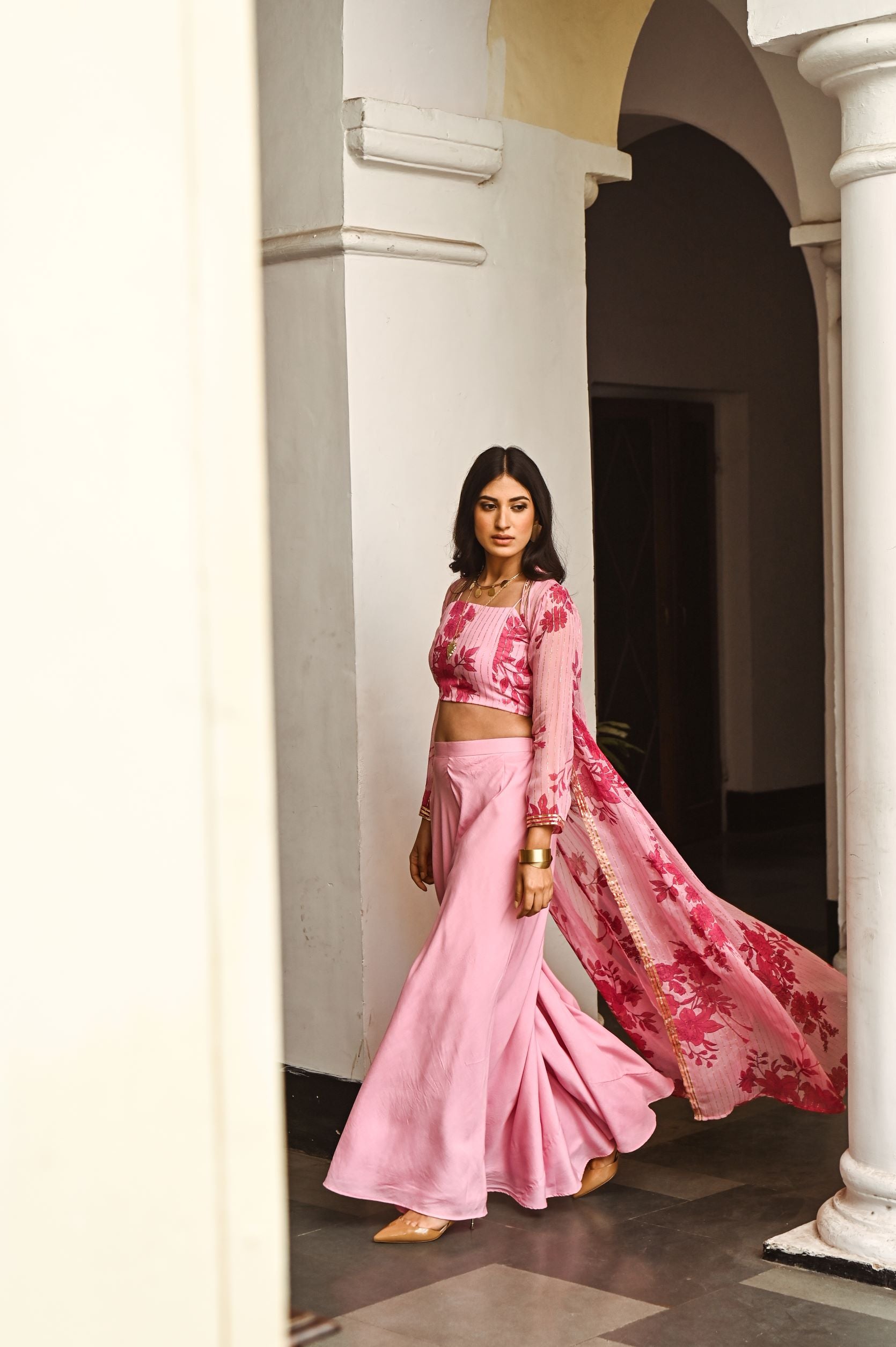 Pink printed cape in lurex georgette with a matching crop top. Intricate hand gota detailing at the the neck and sleeve. This set is paired with soft cotton modal flair pants accentuating the waist.