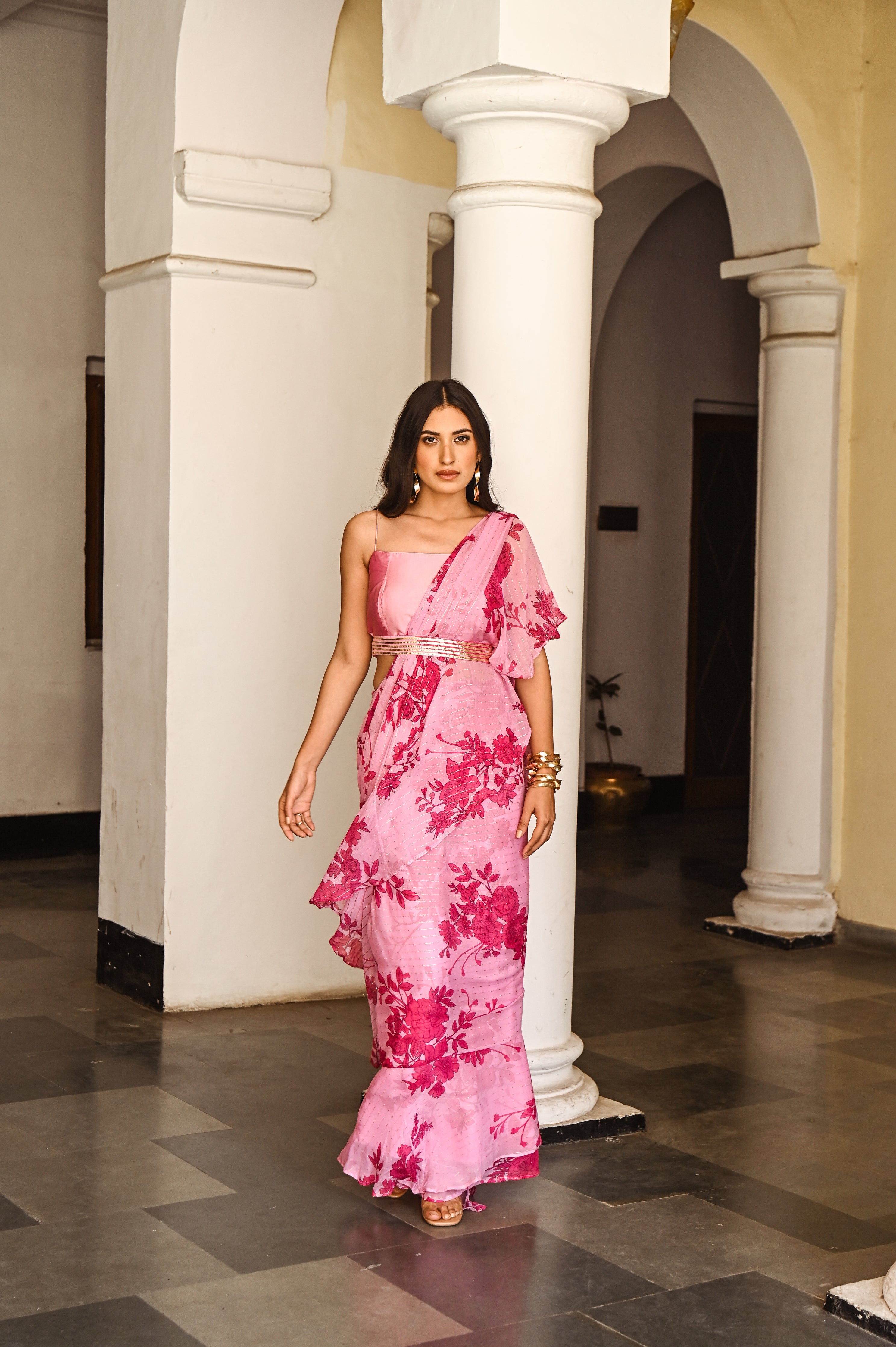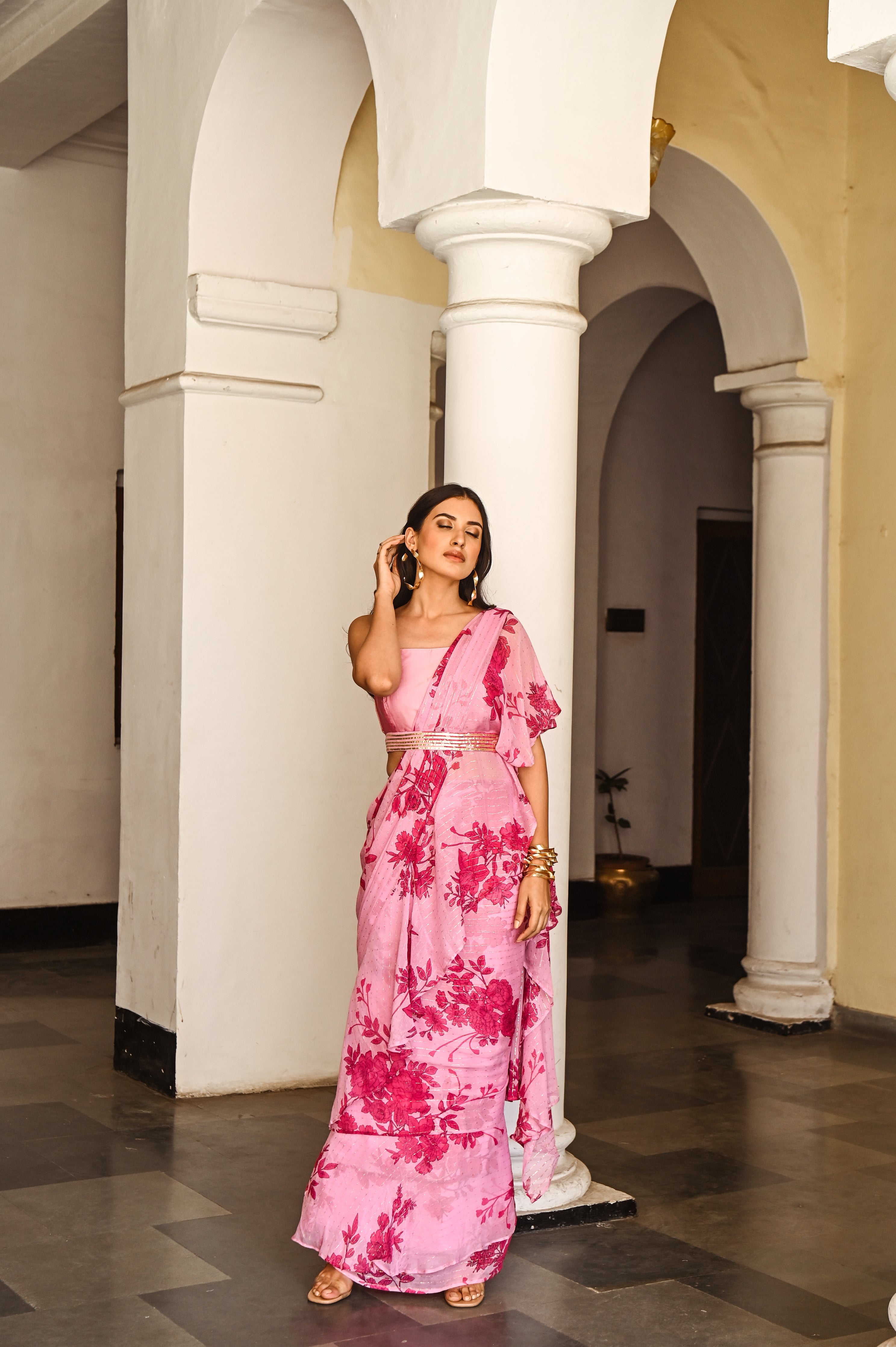 PINK ADYA DRAPED RUFFLE SAREE WITH CROP TOP AND BELT