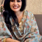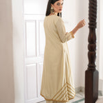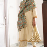 Kurta in soft cotton silk with antique gold thread and tassel details at the neckline, side panel, hem and sleeve ends. Has an attached lining in soft cotton voile. Slim salwar in soft cotton silk with thread and gota details at the hem with elastic. Soft Printed Chanderi silk odhani with gold thread embroidery at the edge.