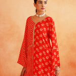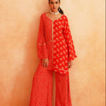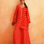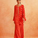 Scarlet red relaxed fit high low shirt with dull gold accents on the neck with three contrast prints for that easy boho chic look paired with comfort fit palazzo pants.