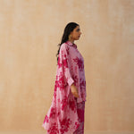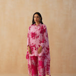 Details: High low shirt with wooden buttons with a contrast pink straight pants