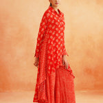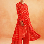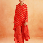 Scarlet red relaxed fit high low shirt with collar and wooden buttons for that easy boho chic look paired with comfort fit palazzo pants.