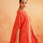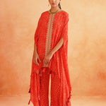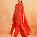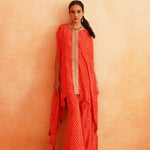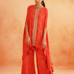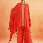 Cape style top with intricate gold detailing. Paired with comfortable wide leg pants. Also comes with a cotton mulmul slip.