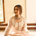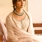 Anarkali kurta in crushed mul cotton. Exquisite benarasi detailing at the yolk. Soft net odhani with Gota hand work at the edges. This Kurta & Dupatta Set are the perfect pick this festive season. Style this kurta with delicate polki jewellery and mojaris.