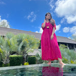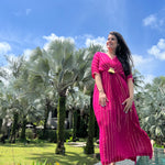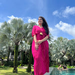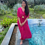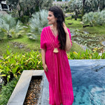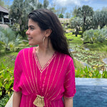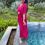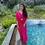 This vivacious Kaftan Dress is a sure shot head turner this festive season. Style it with polki jewelry and mojaris for a Mehndi celebration. Or wear it with statement gold hoops and gladiators for a beach soiree. A must have piece in your wardrobe. It come with a soft cotton slip.