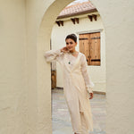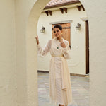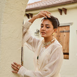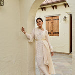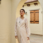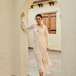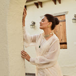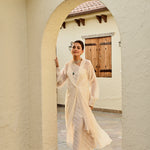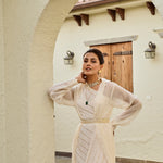 Ivory lurex one shoulder dress with intricate pleated detailing at the waist and  delicate organza jacket . A silhouette so stunning, comfortable & stylish, its bound to make heads turn. Style this outfit with a statement gold earrings and pointy pumps.