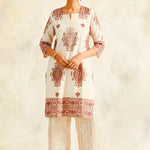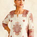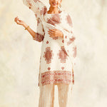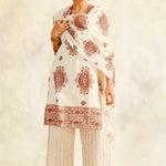 Soothing beige with rust accents Kurta and stole in our Jodhpur print on soft cotton mulmul . Cotton modal pants with hand embroidered silver and rose gold gota detailing.