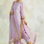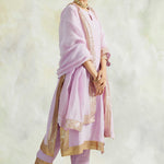 Exquisite soft chanderi kurta with antique gold gota embroidery on the hem . Cigarette pants with antique gold on the edge , Soft chanderi odhani with antique gold gota highlighting at the edges.