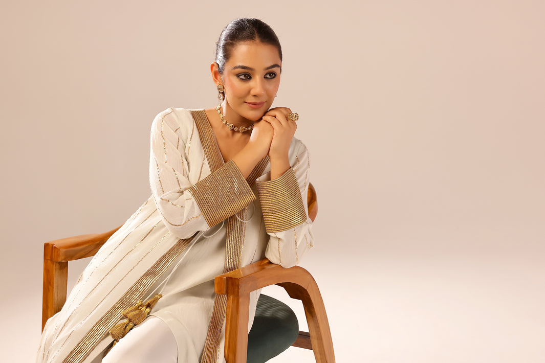 CREAM VEERA KURTA WITH SHAHRARA AND ODHANI - SET OF THREE