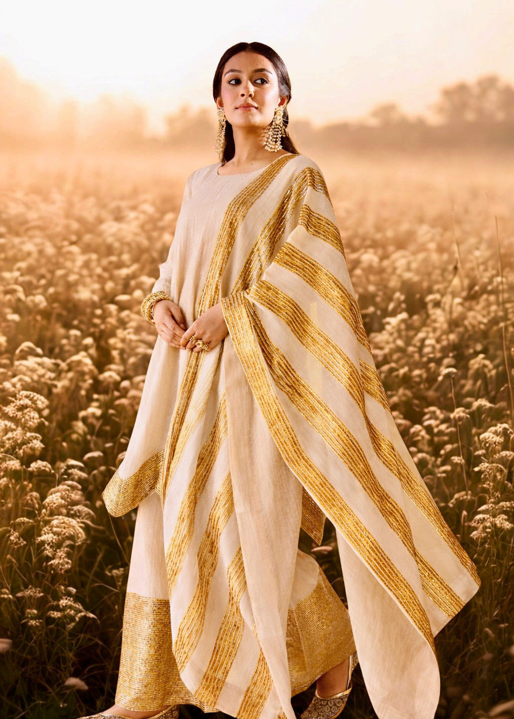 BEIGE AND GOLD TAHIRA DRAPED SAREE GOWN