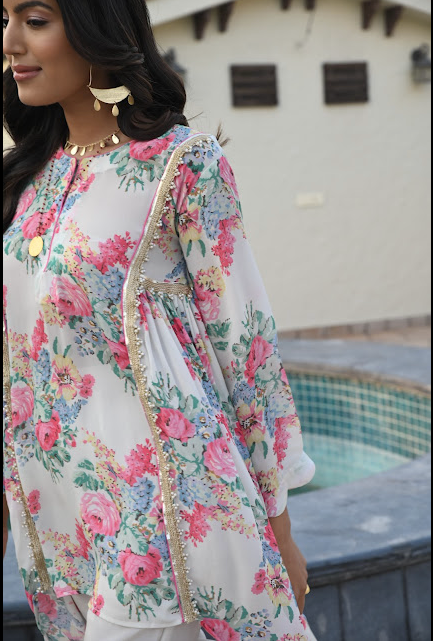 Top in soft crepe with intricate hand embroideries with gold gota and thread at the neckline and sleeve end along with delicate pearl work.Trousers in soft crepe and contrast organza and lace details at the edge.