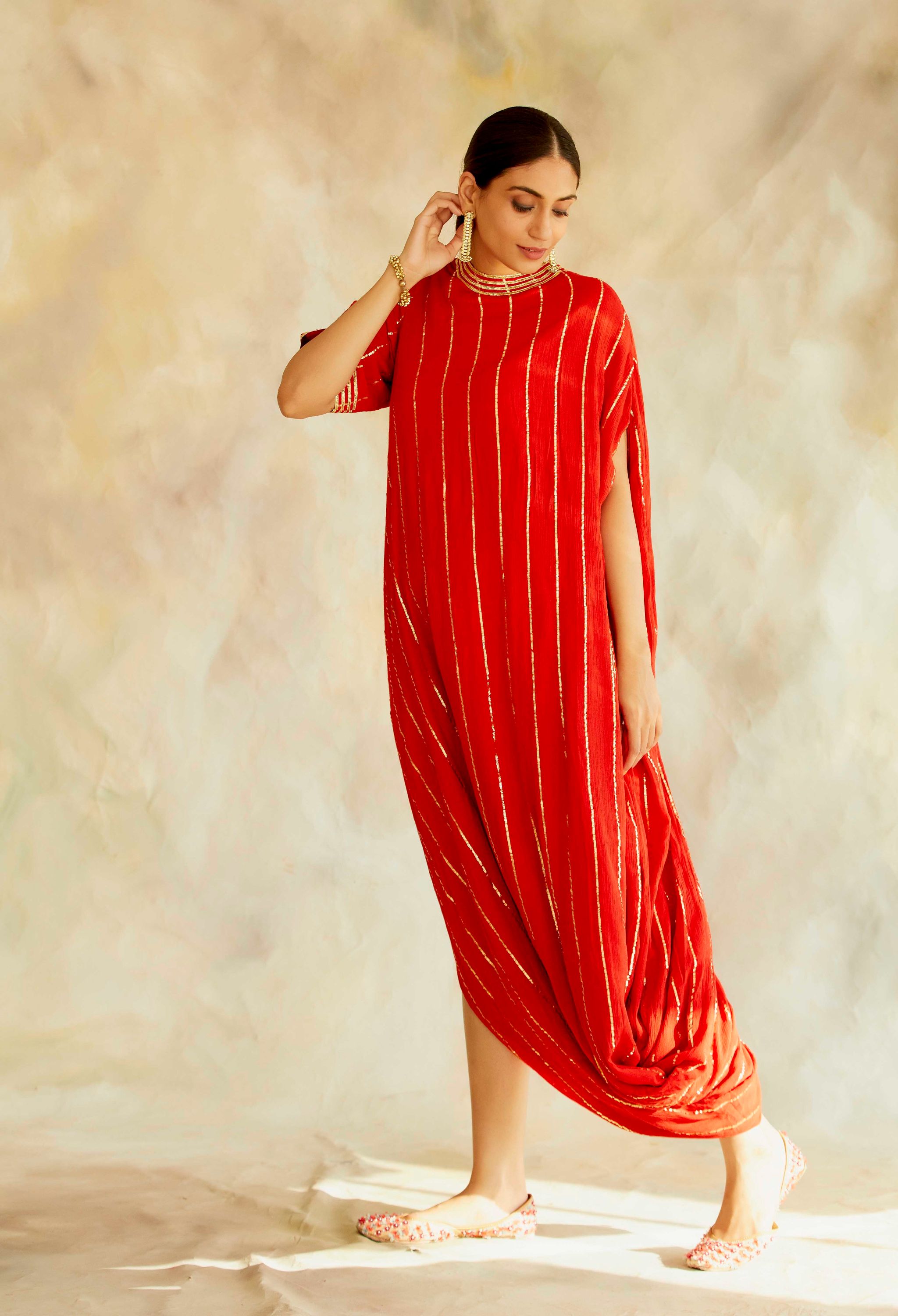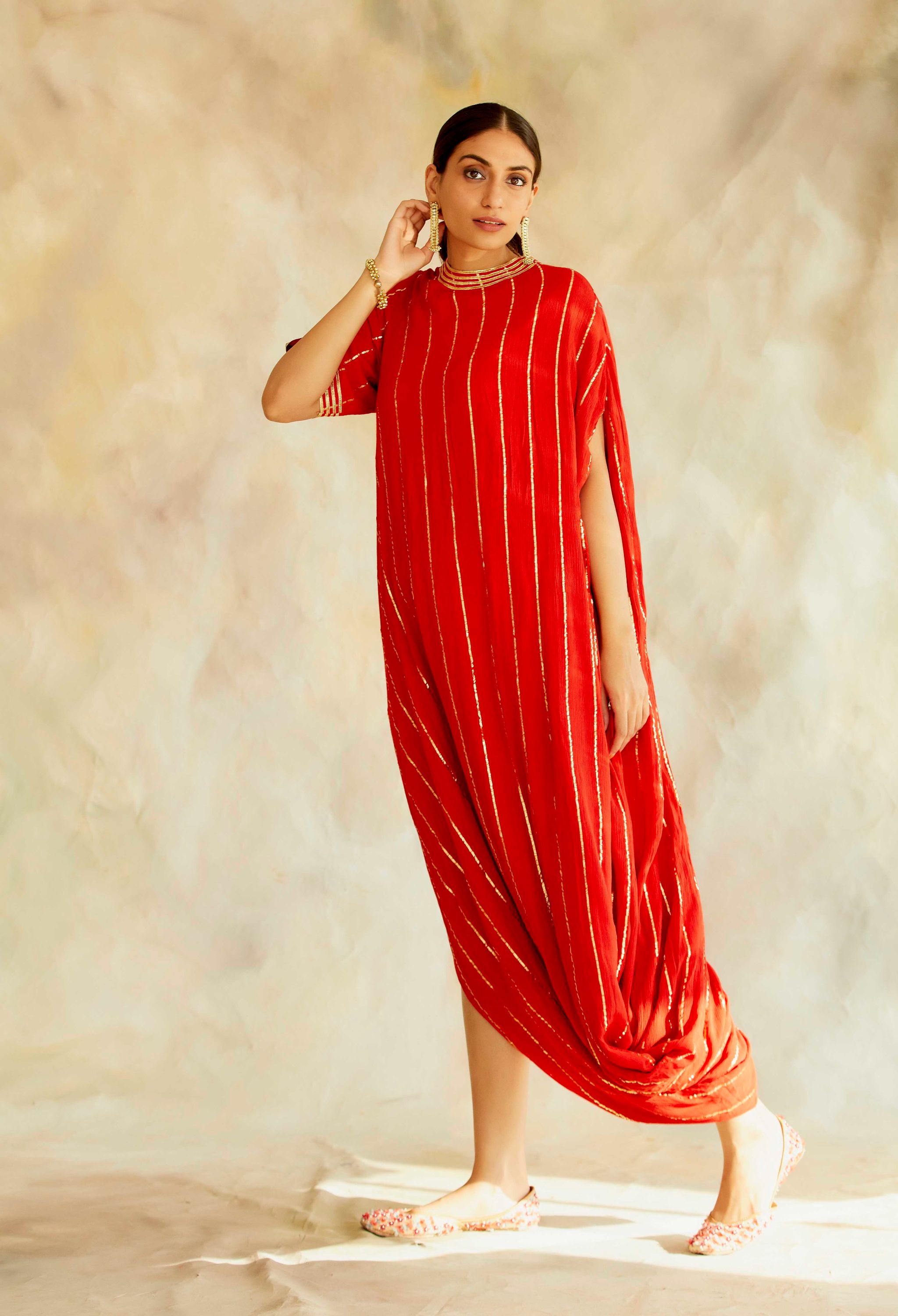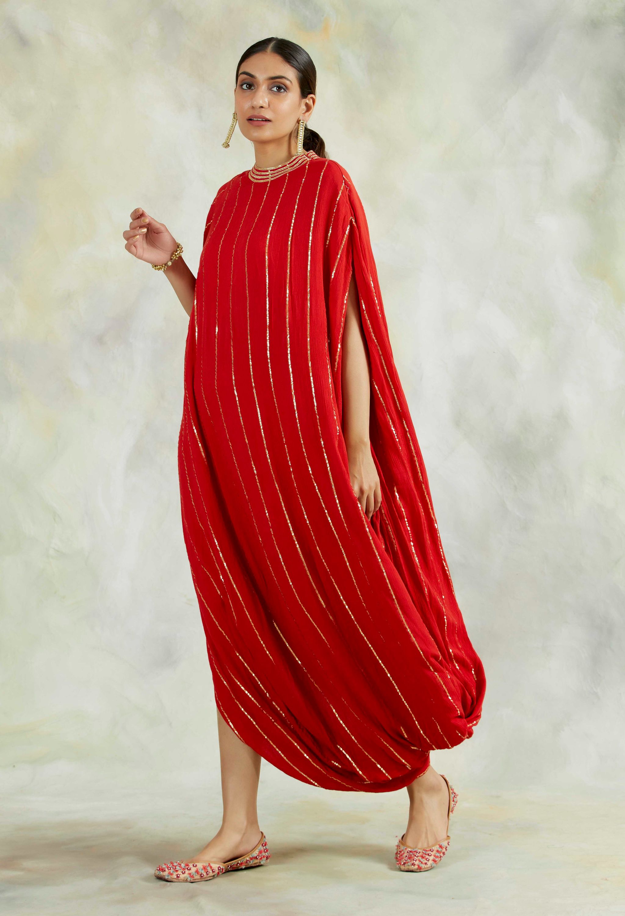 Cowl dress in soft rayon crepe with gold lurex details. Neckline is highlighted with gold thread and gota embroidery.