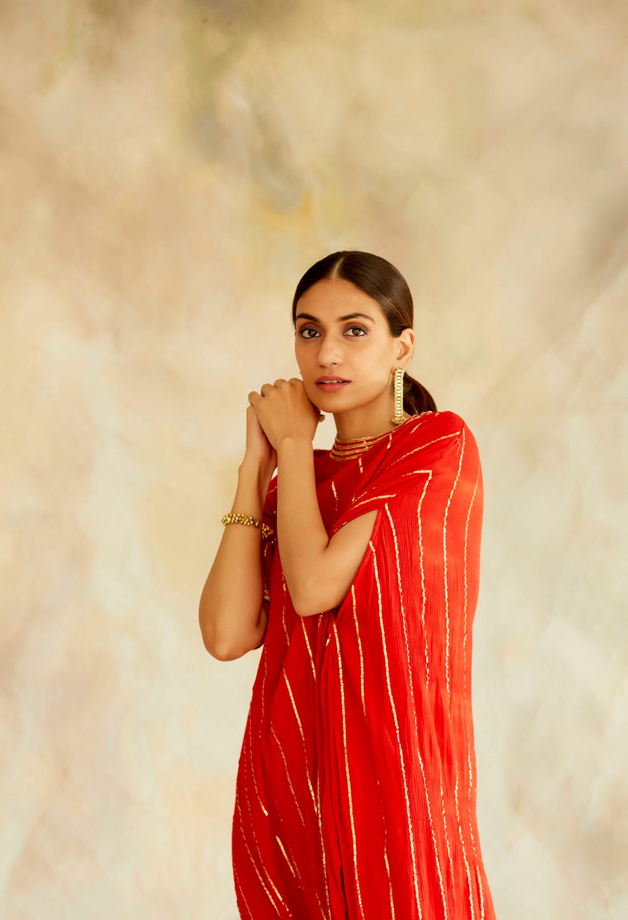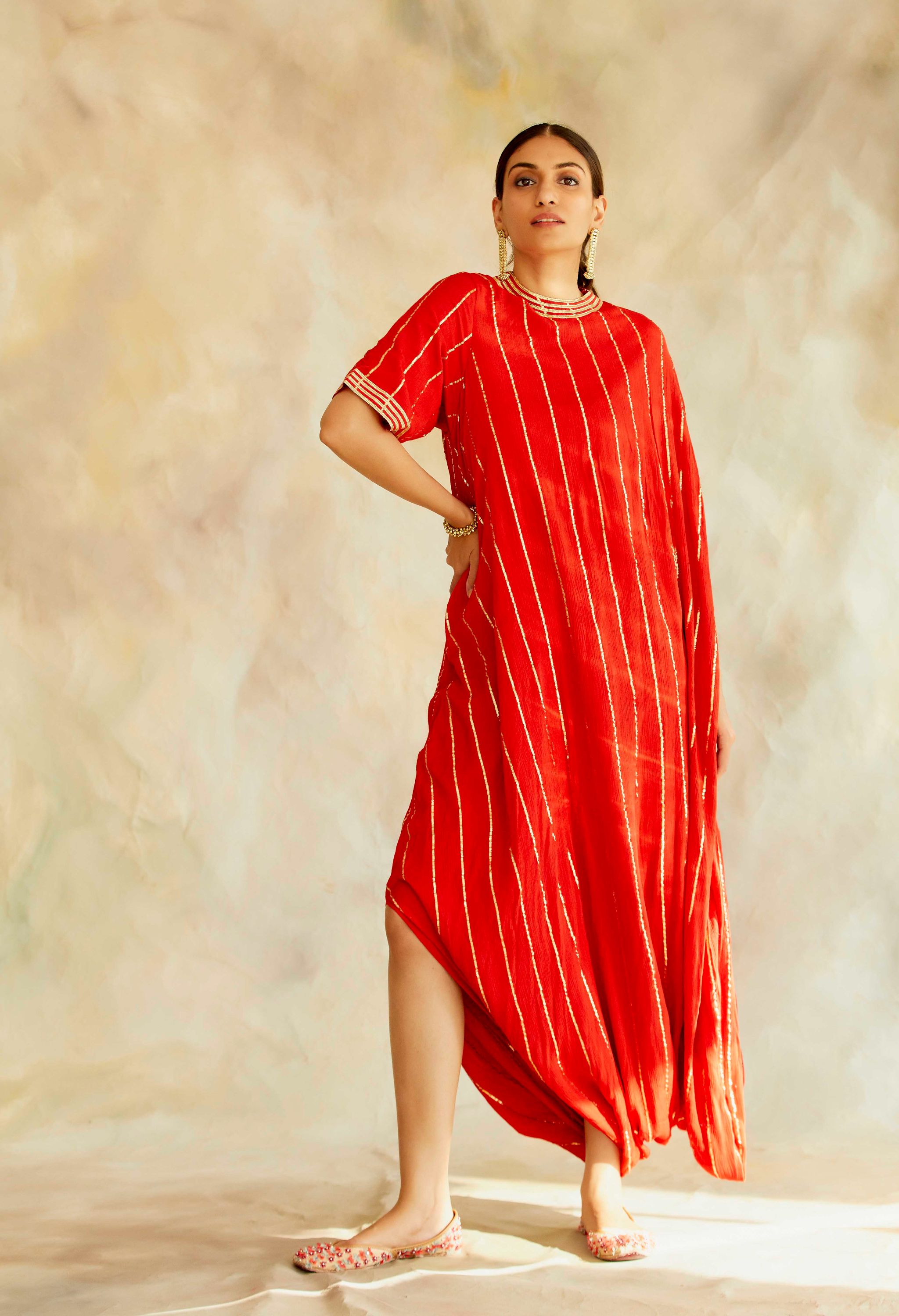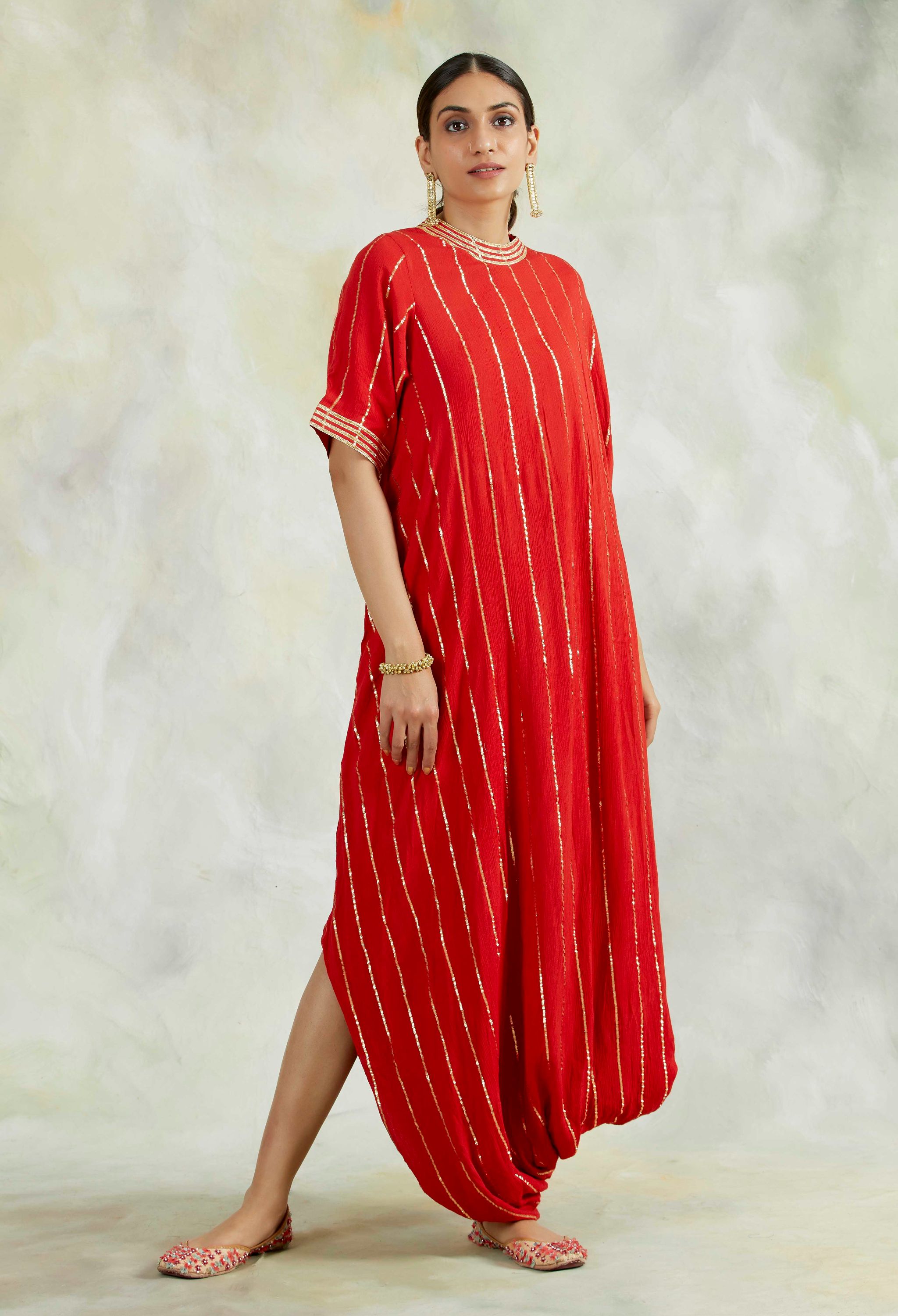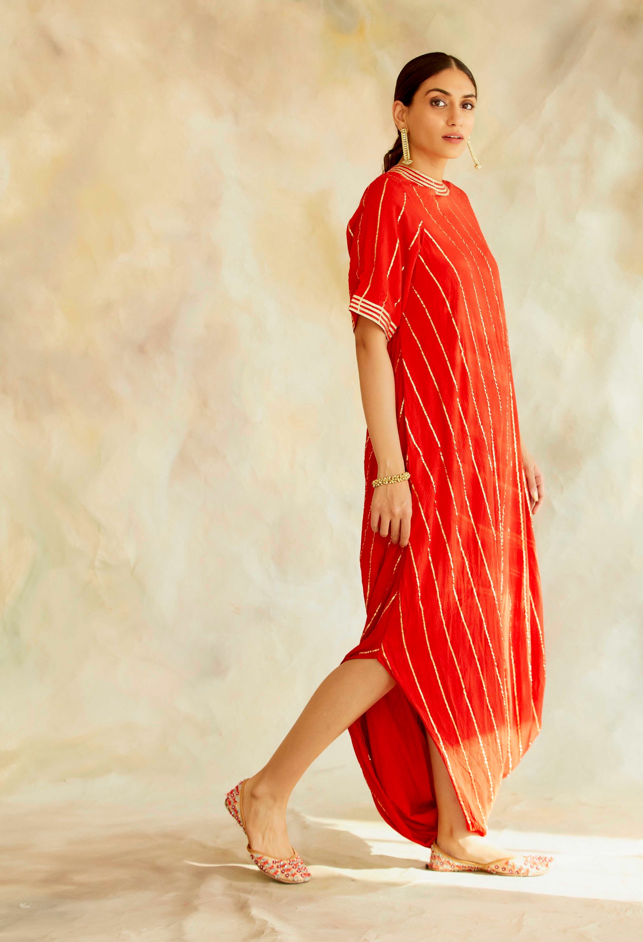 Cowl dress in soft rayon crepe with gold lurex details. Neckline is highlighted with gold thread and gota embroidery.