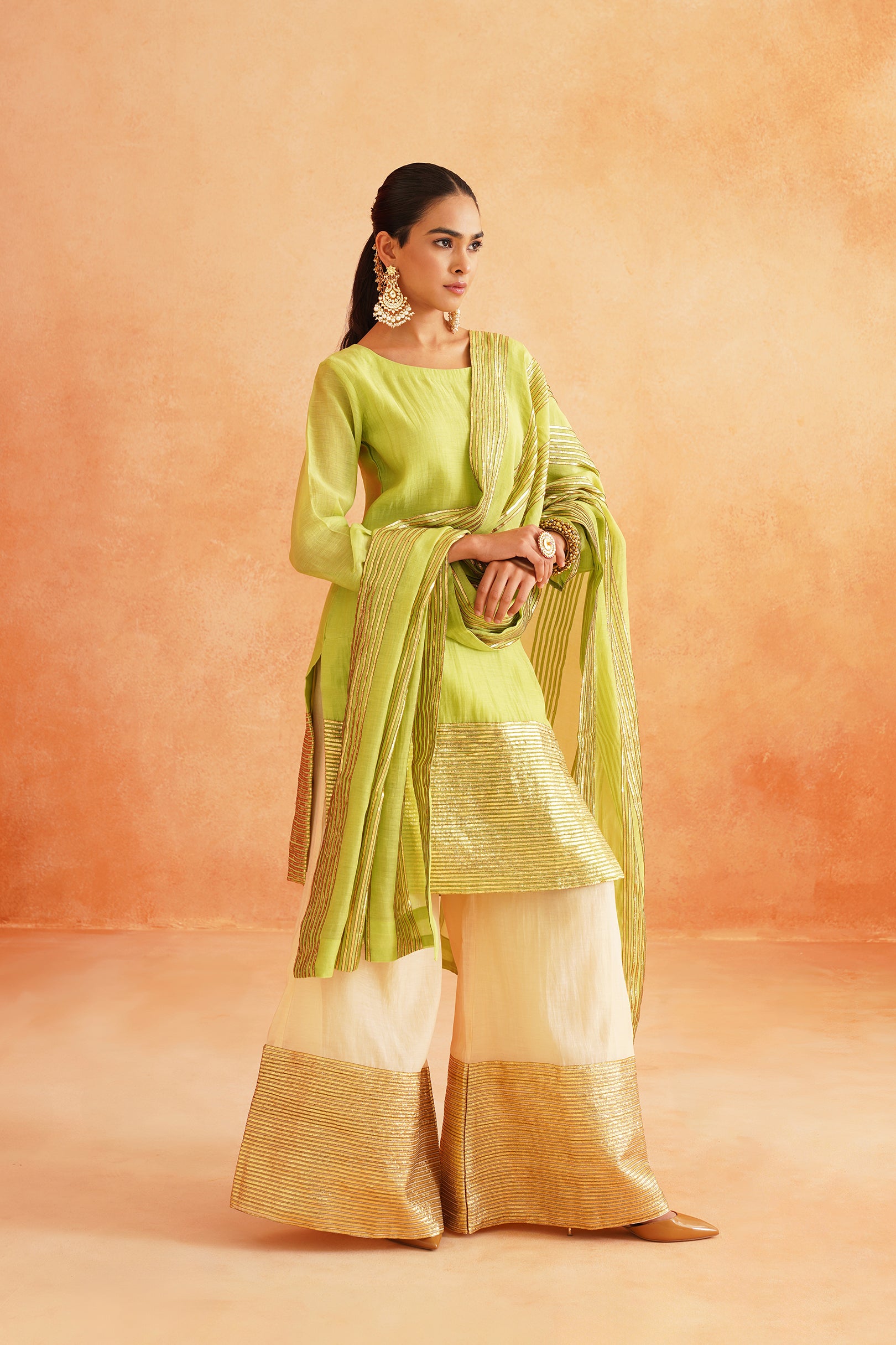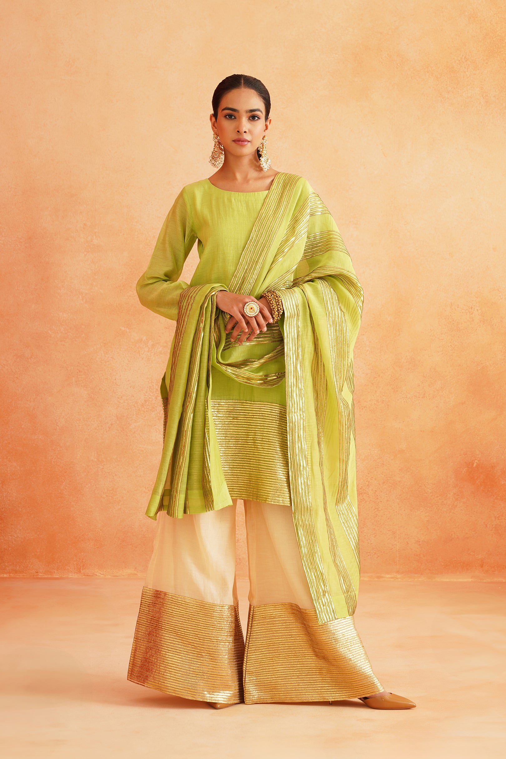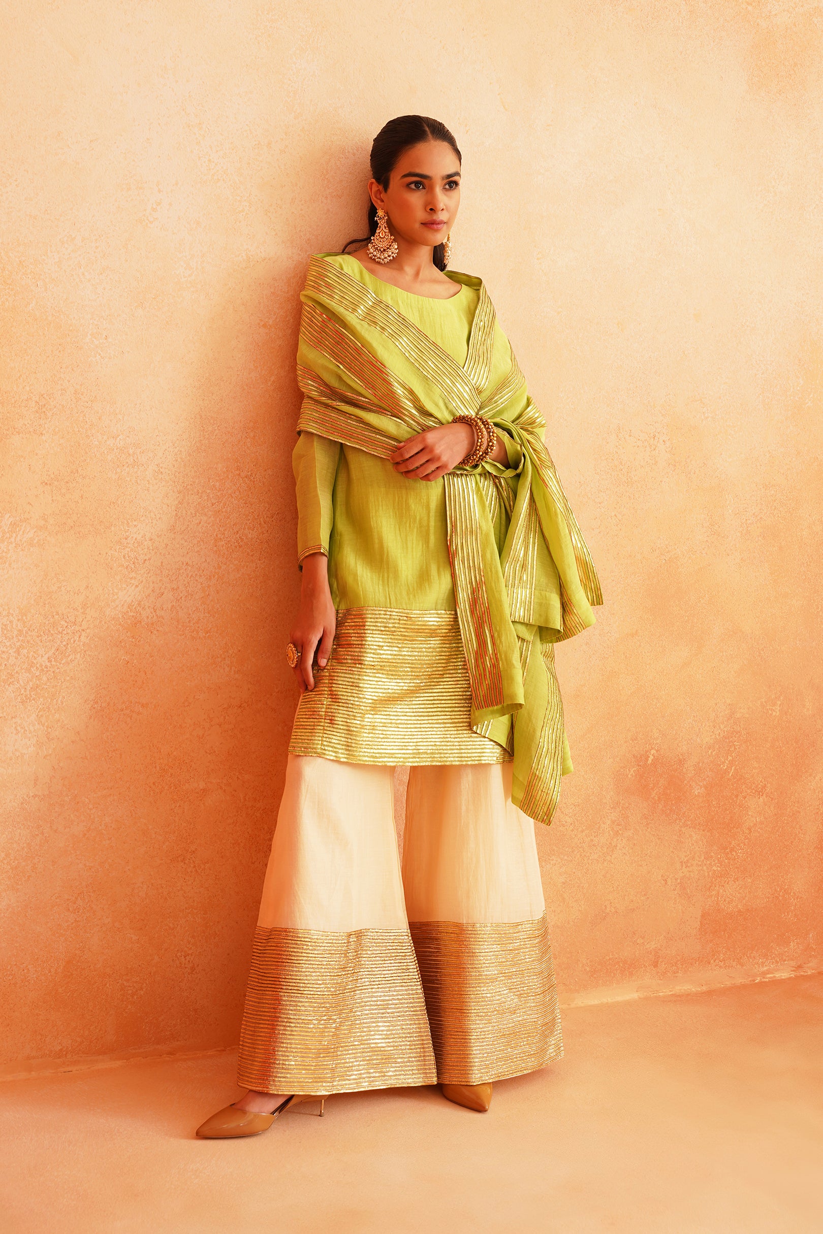 Pure soft chanderi kurta with extremely fine and intricate dull gold gota embroidery at the hem. This kurta set comes with a pure chanderi odhani with intricate gold detailing. The sharara is warm offwhite with a matching dull gold embroidery .This simple yet classic sharara set is a must have for every wardrobe. Pair it with polki or gold jewellery for an exquisite royal look.
