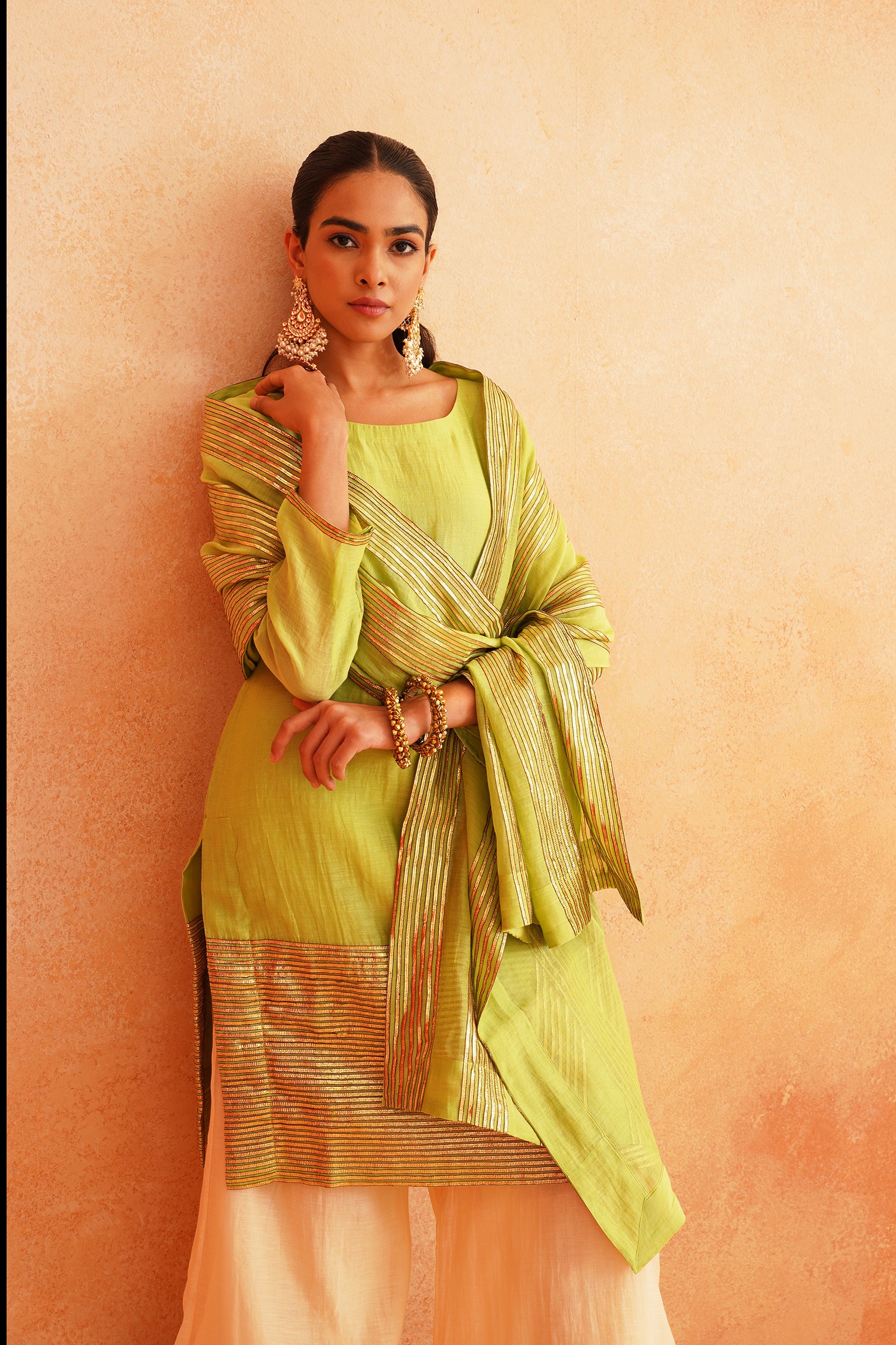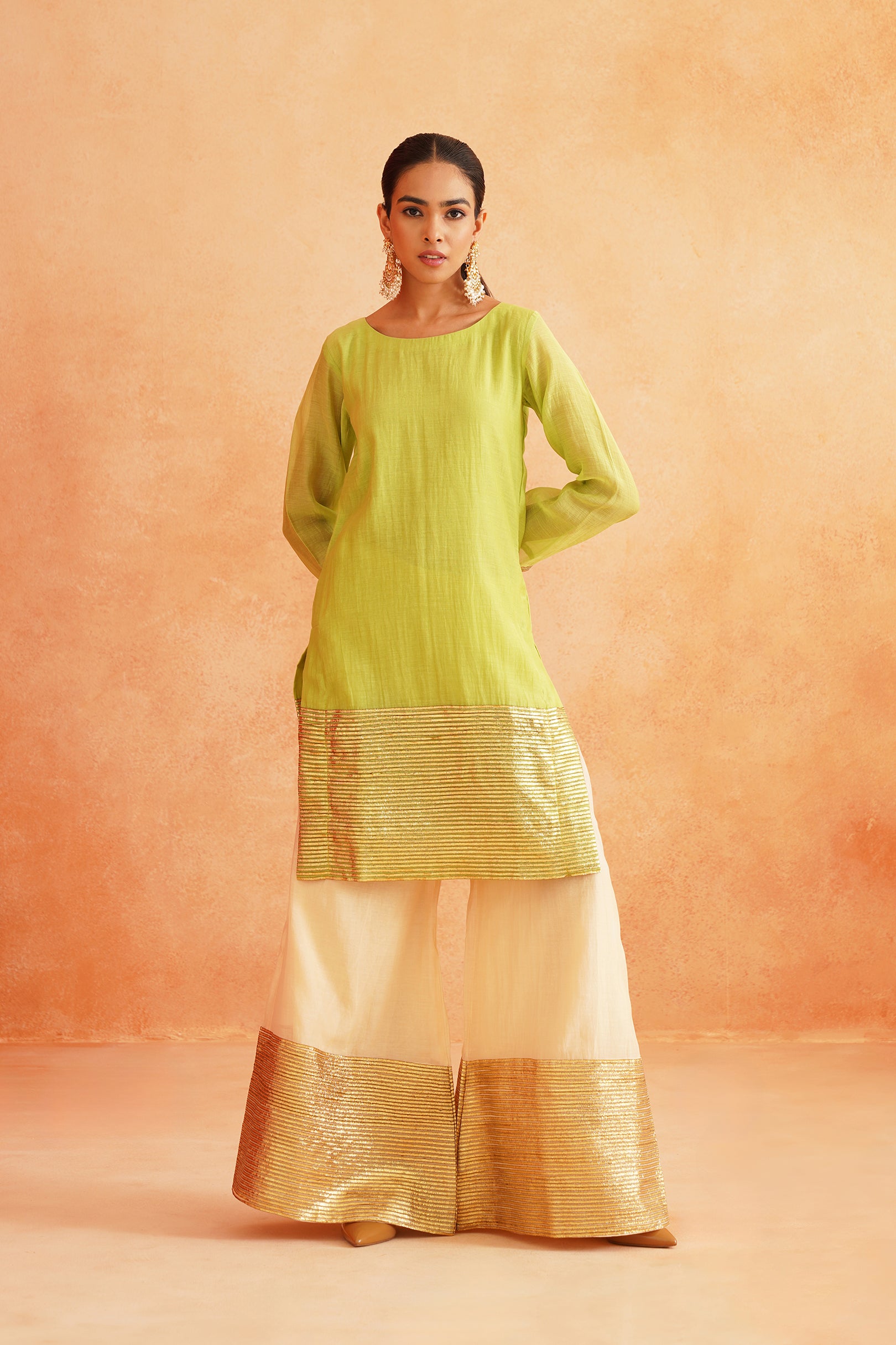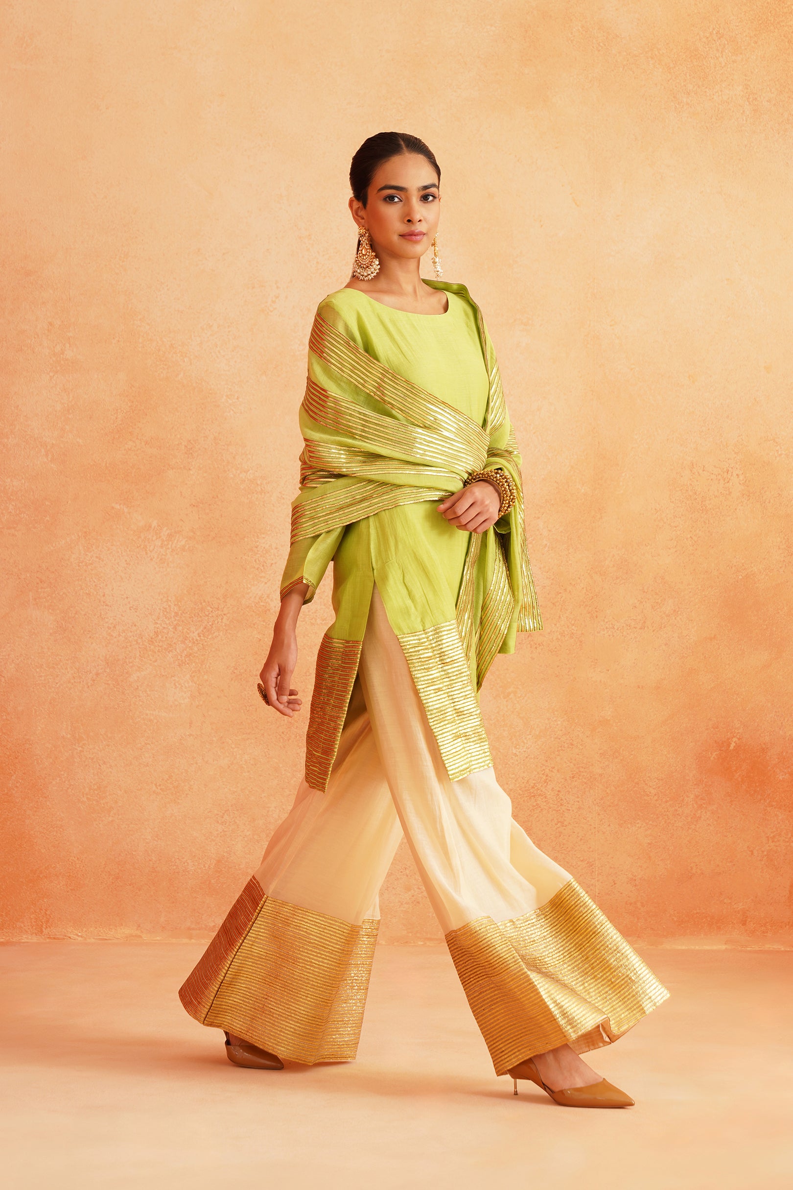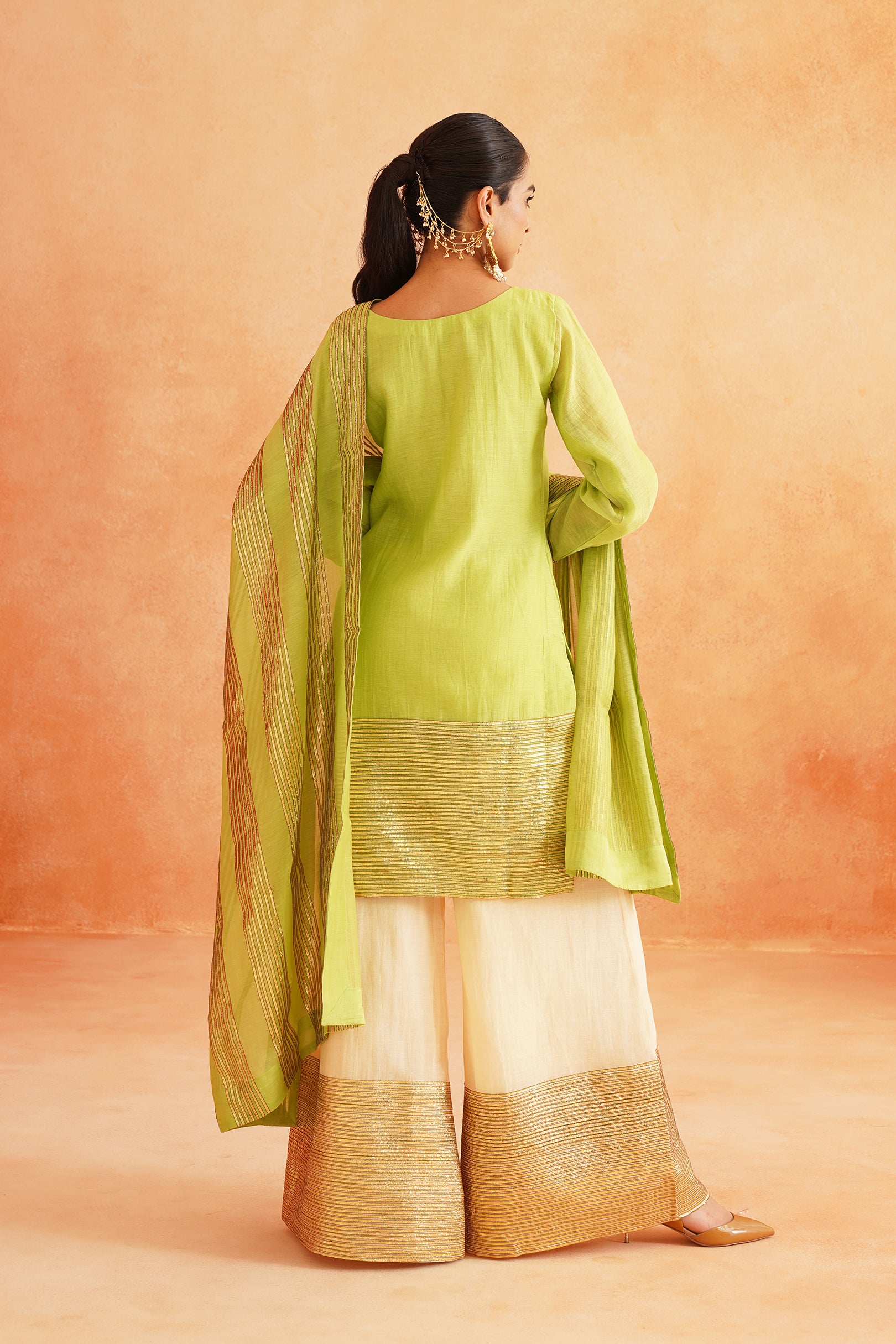 Pure soft chanderi kurta with extremely fine and intricate dull gold gota embroidery at the hem. This kurta set comes with a pure chanderi odhani with intricate gold detailing. The sharara is warm offwhite with a matching dull gold embroidery .This simple yet classic sharara set is a must have for every wardrobe. Pair it with polki or gold jewellery for an exquisite royal look.