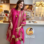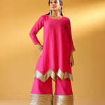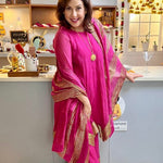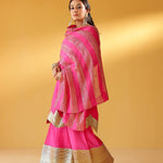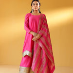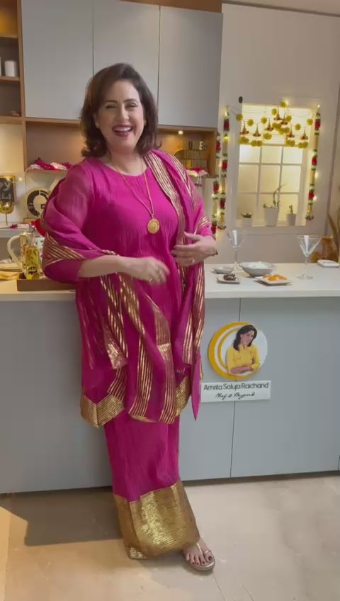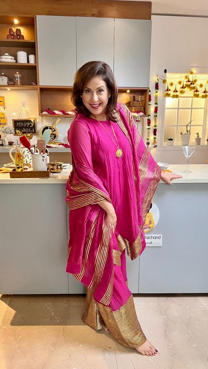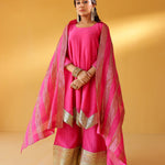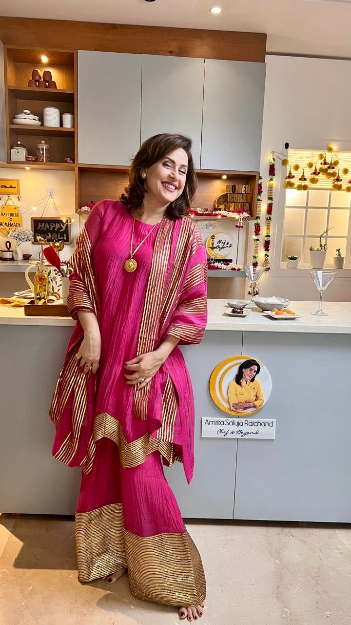 CHEF AMRITA RAICHAND | PINK AVNI PURE CHANDHERI KURTA FLARED PANTS & DUPATTA I SET OF THREE