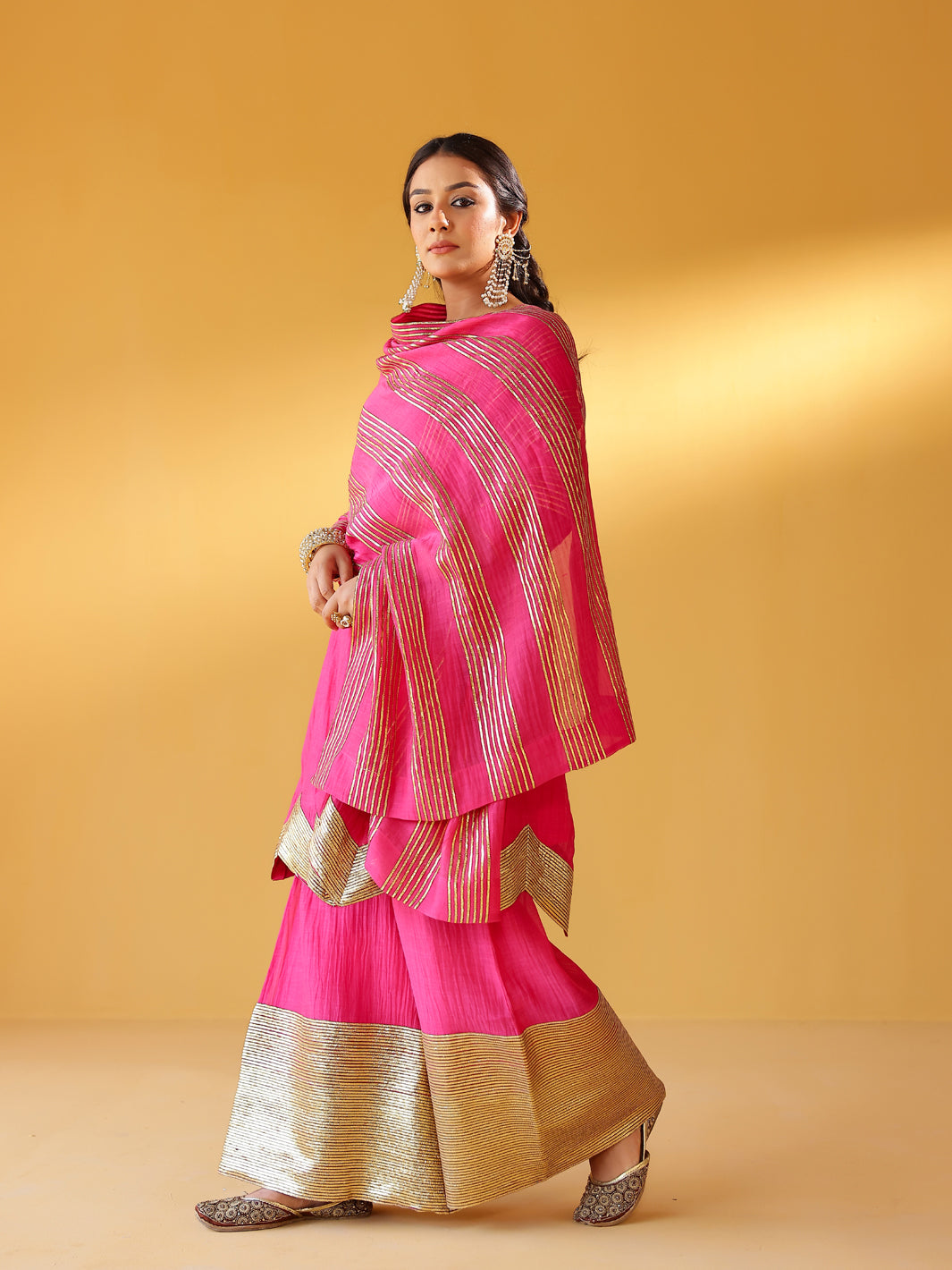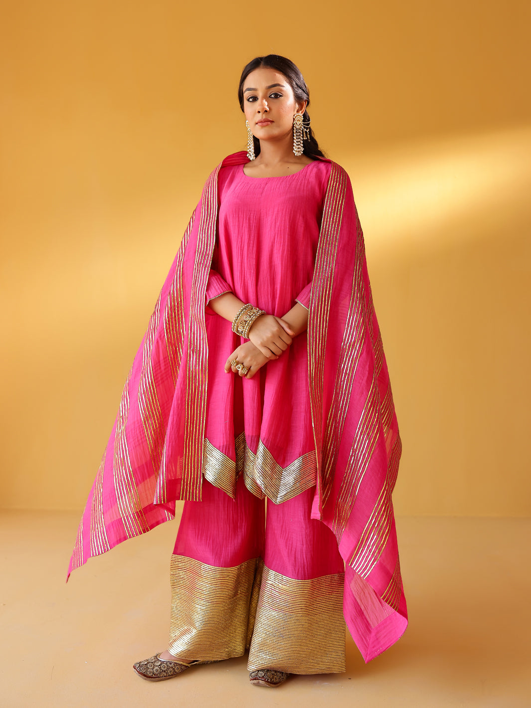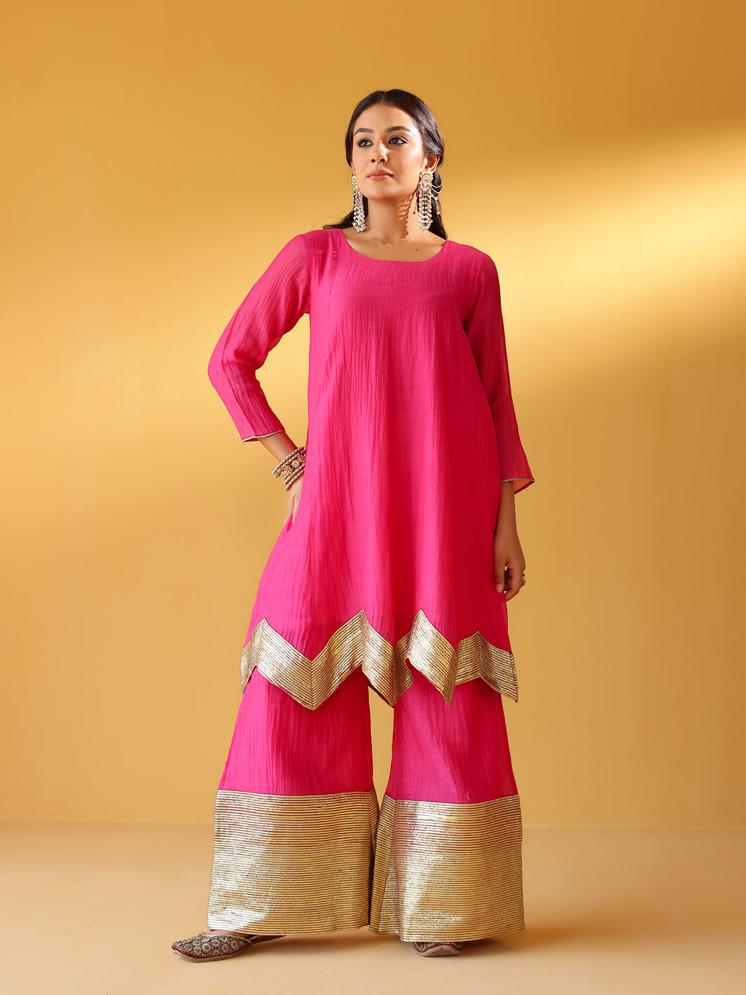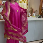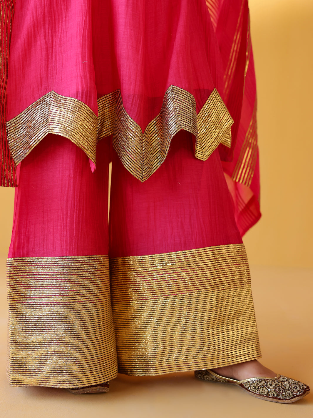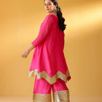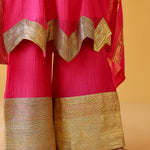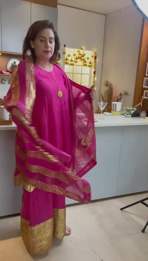 Pure soft chanderi kurta with extremely fine and intricate dull gold gota embroidery at the hem. This kurta set comes with a pure chanderi odhani with intricate gold detailing & matching sharara with a gold enhanced hem. A must have this festive season.