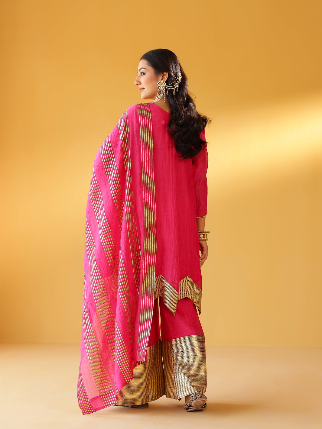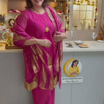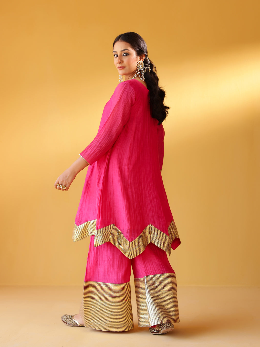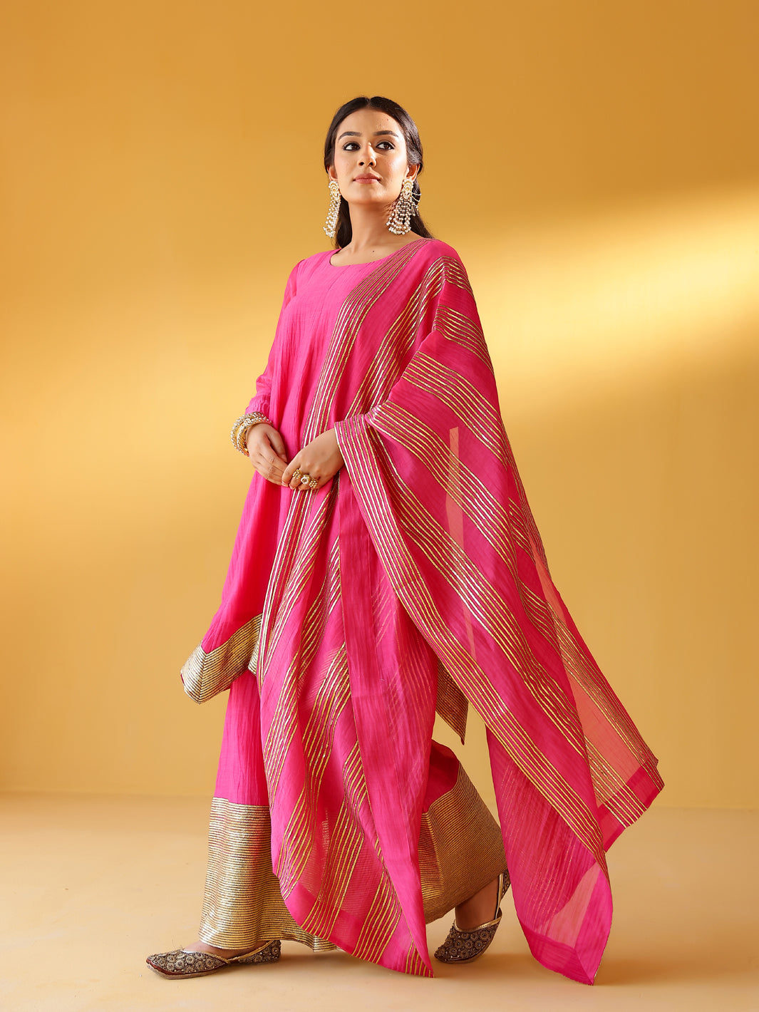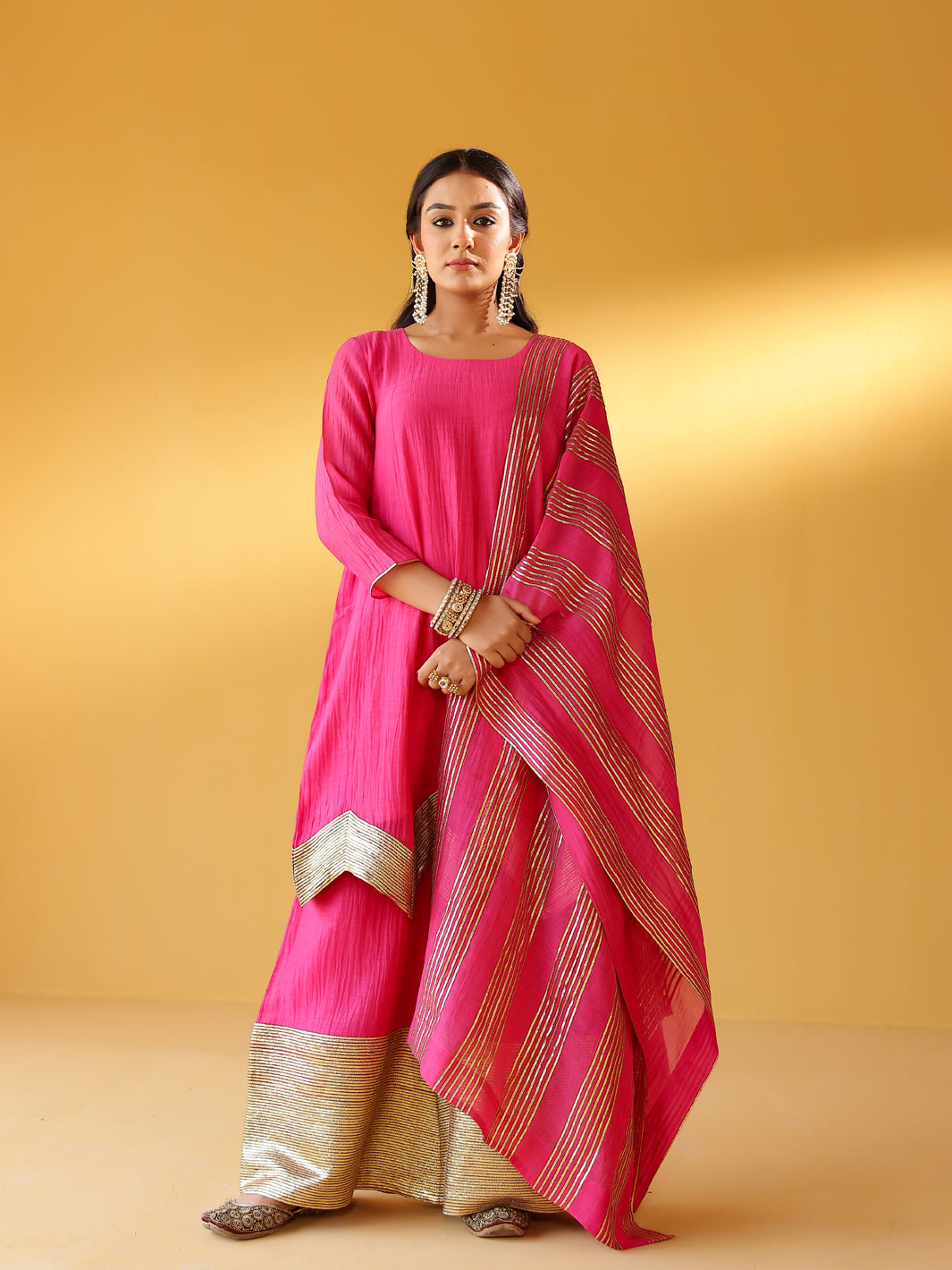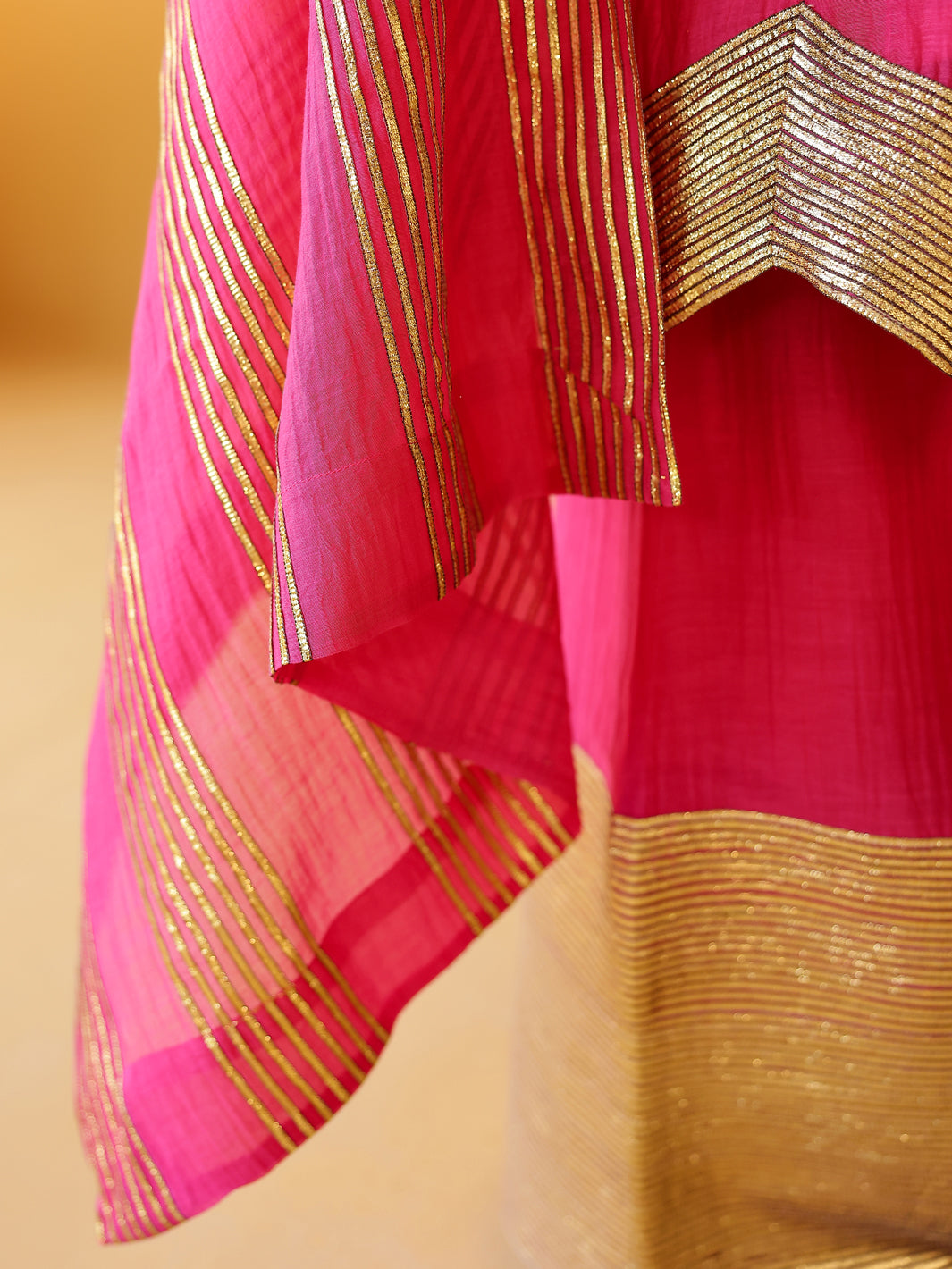 Pure soft chanderi kurta with extremely fine and intricate dull gold gota embroidery at the hem. This kurta set comes with a pure chanderi odhani with intricate gold detailing & matching sharara with a gold enhanced hem. A must have this festive season.