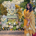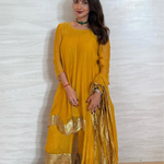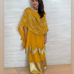 Pure soft chanderi kurta with extremely fine and intricate dull gold gota embroidery at the hem. This kurta set comes with a pure chanderi odhani with intricate gold detailing & matching sharara with a gold