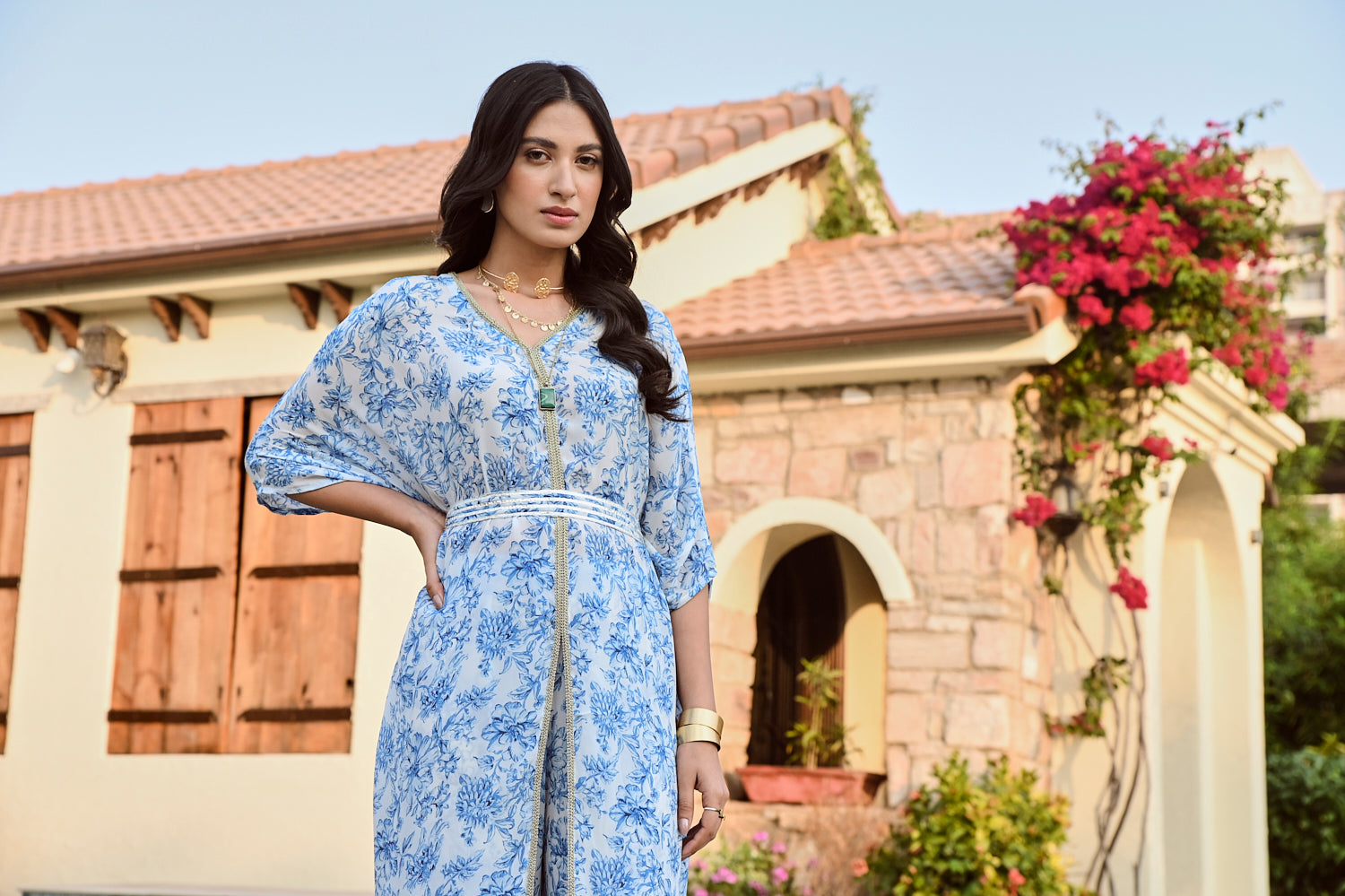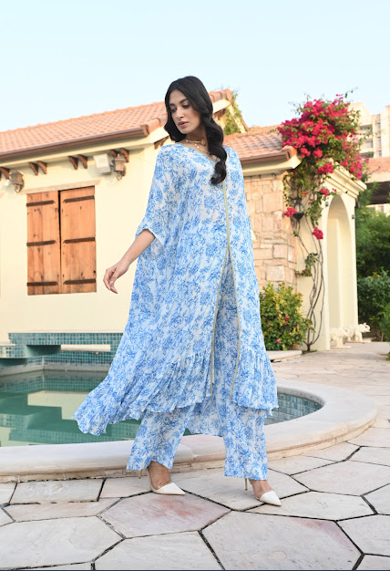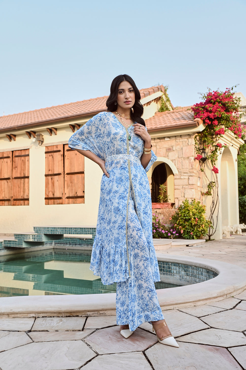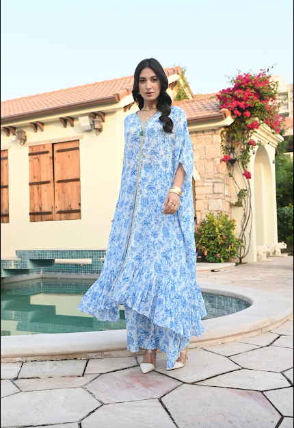 Pure printed crepe kaftan top with matching pants and an exquisite gota belt makes this piece a must have this festive season. Style it with mojaris for a mehndi celebration or sleek heels for an evening soiree.
