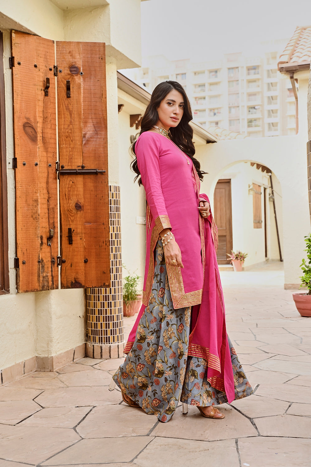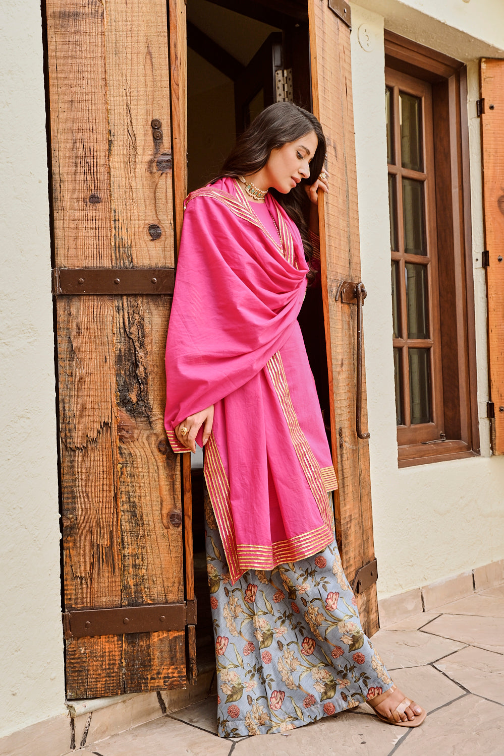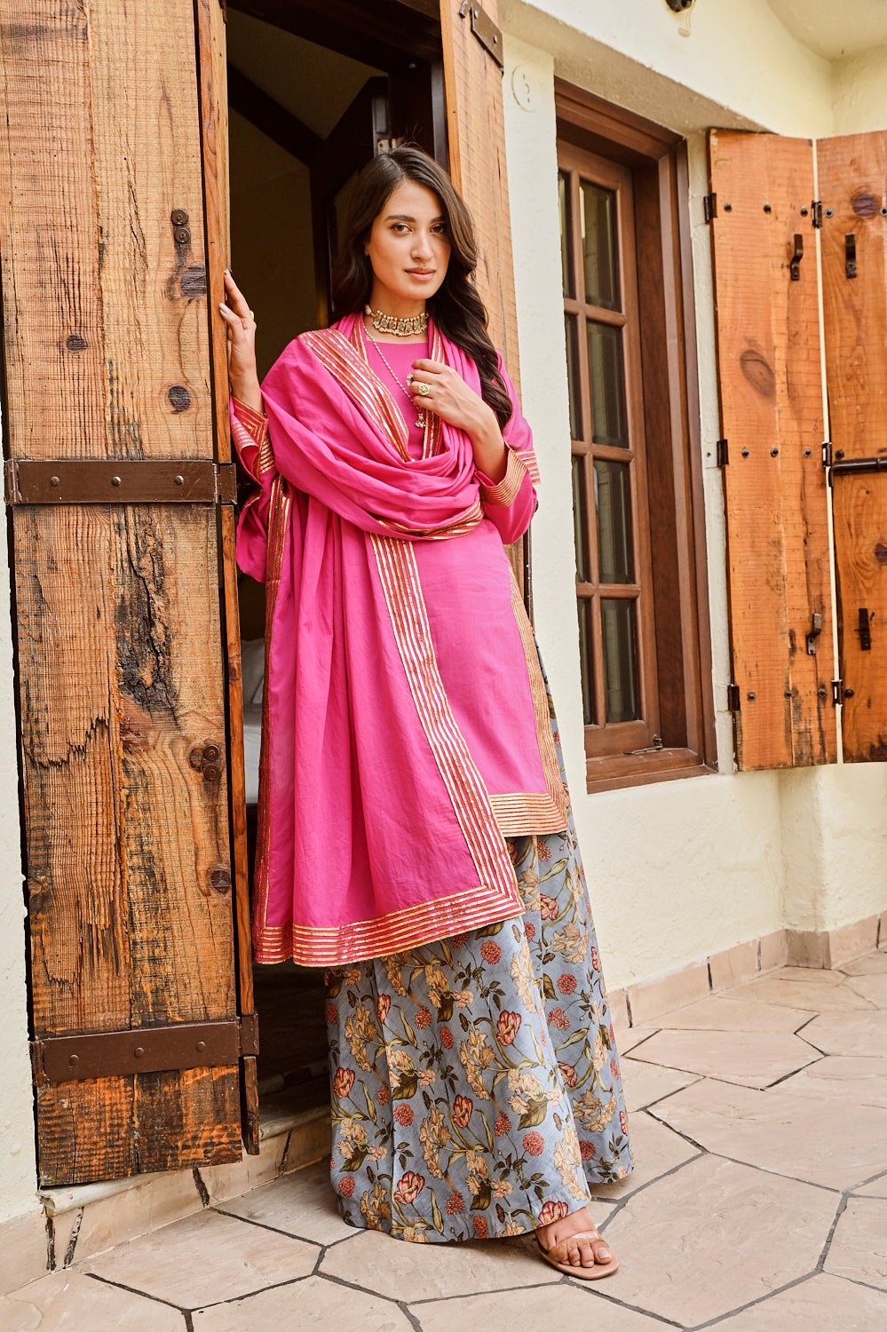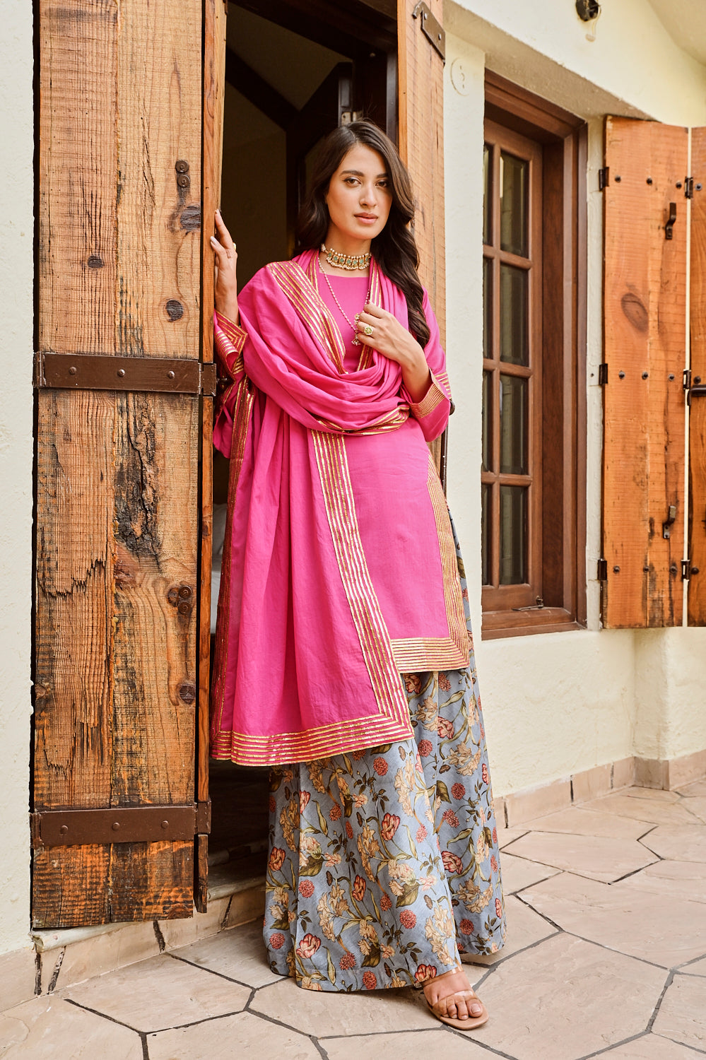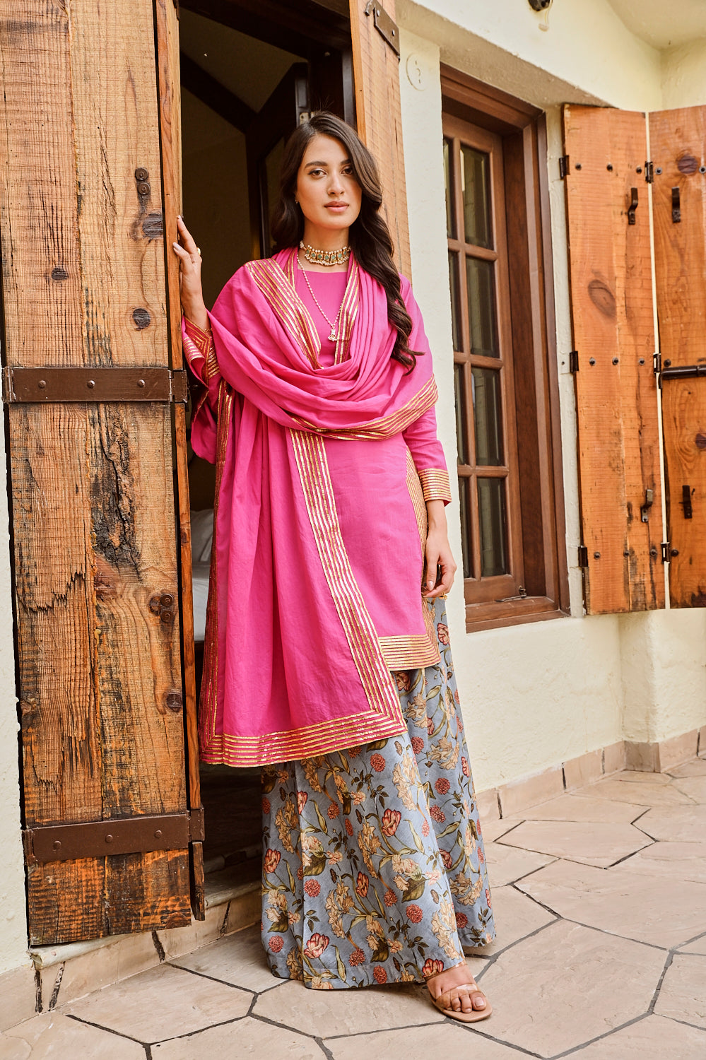 Pure cotton staraight kurta in hot pink , intricate antique gold gota detalinng with contrast grey floral chanderi floral flair palaazo for comfort fit . This set is paired with cotton odhani along with antique gold hand work for that fuss free festive look .
