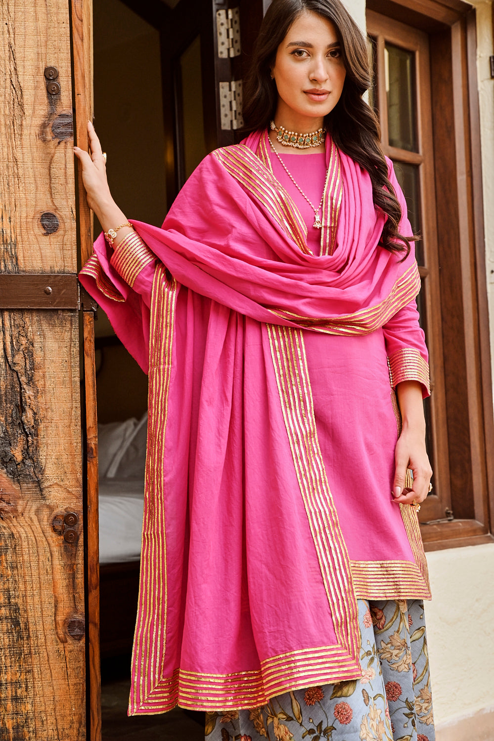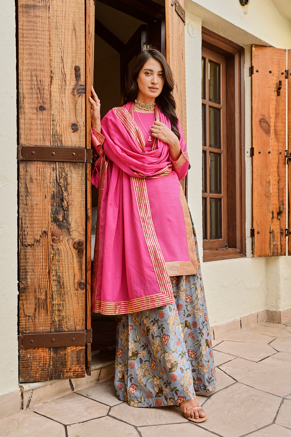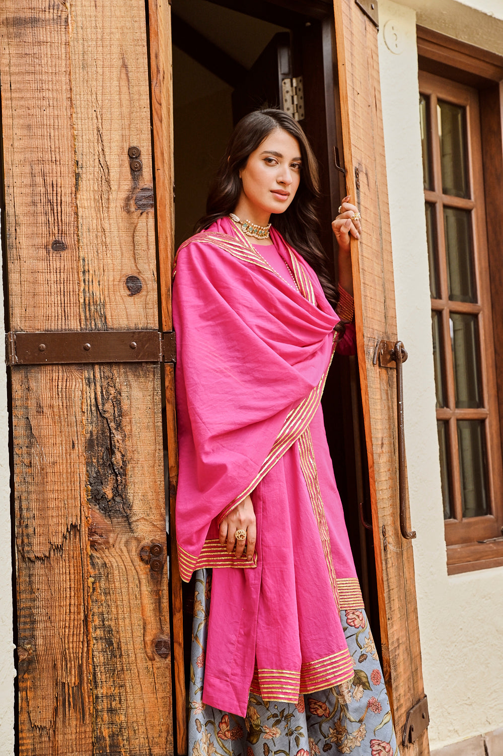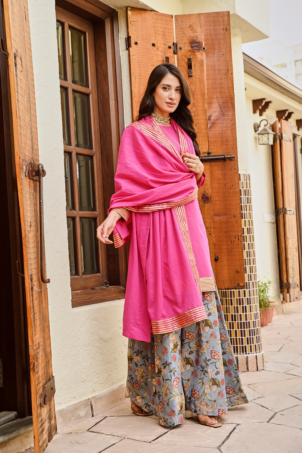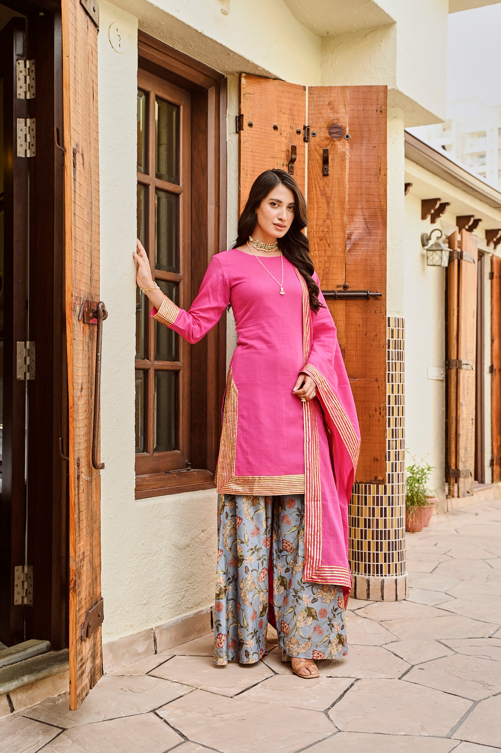 Pure cotton staraight kurta in hot pink , intricate antique gold gota detalinng with contrast grey floral chanderi floral flair palaazo for comfort fit . This set is paired with cotton odhani along with antique gold hand work for that fuss free festive look .