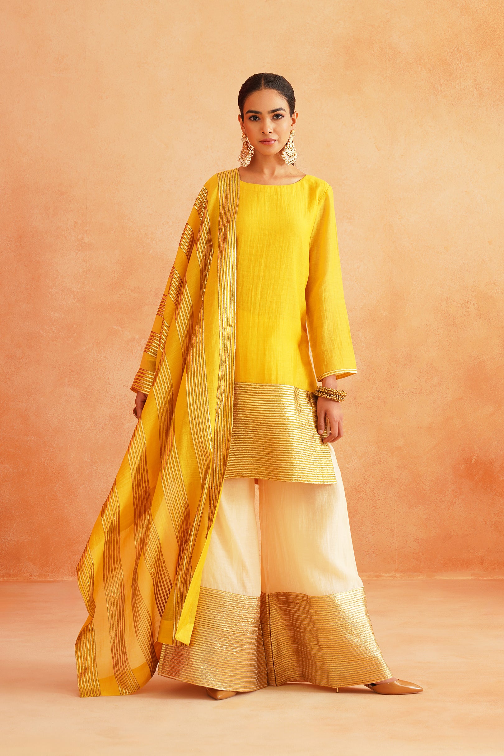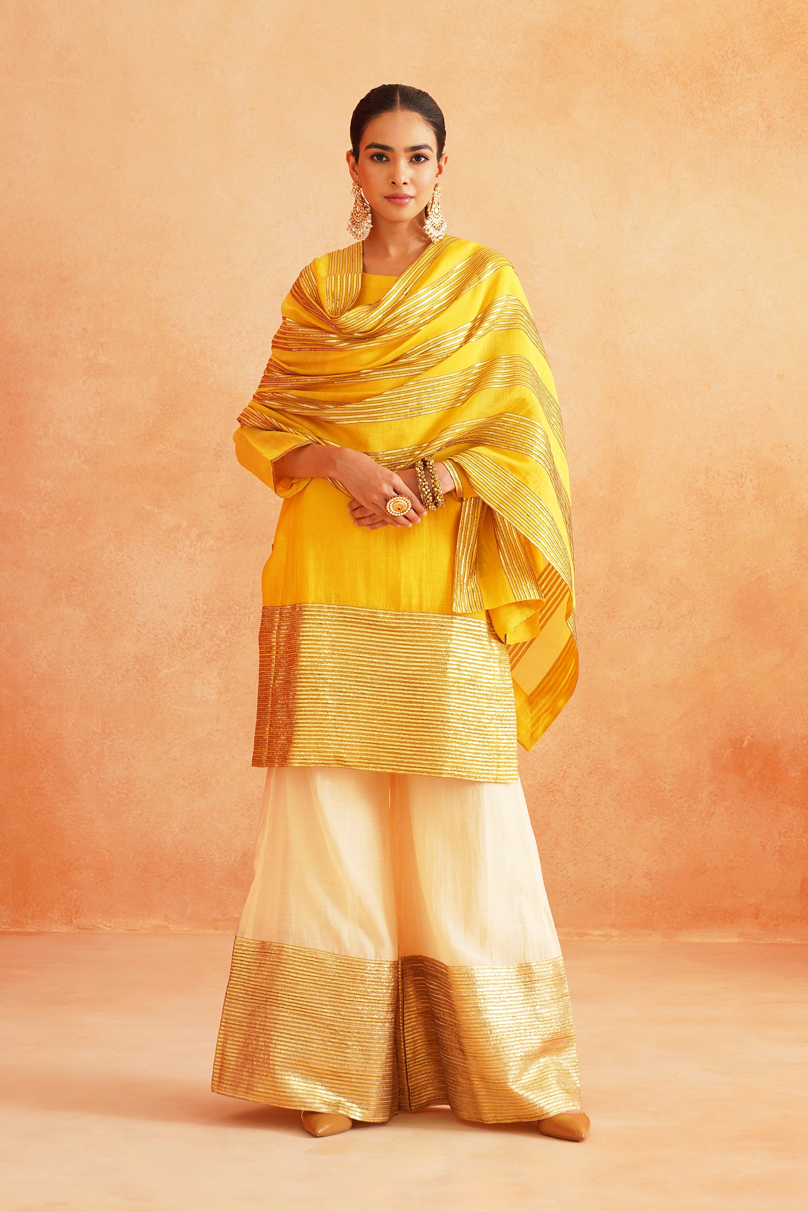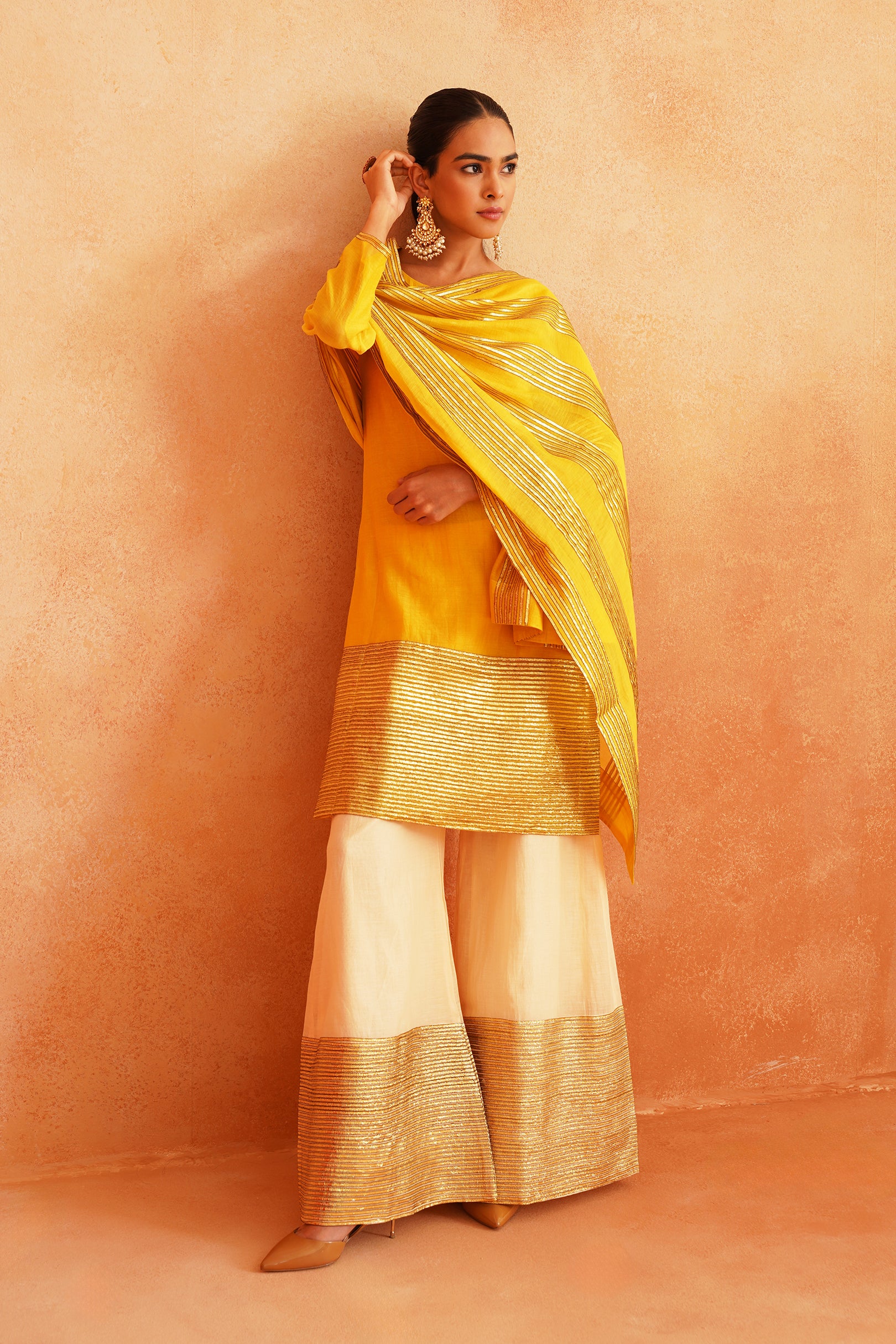 Pure soft chanderi kurta with extremely fine and intricate dull gold gota embroidery at the hem. This kurta set comes with a pure chanderi odhani with intricate gold detailing. The sharara is warm offwhite with a matching dull gold embroidery .This simple yet classic sharara set is a must have for every wardrobe. Pair it with polki or gold jewellery for an exquisite royal look.