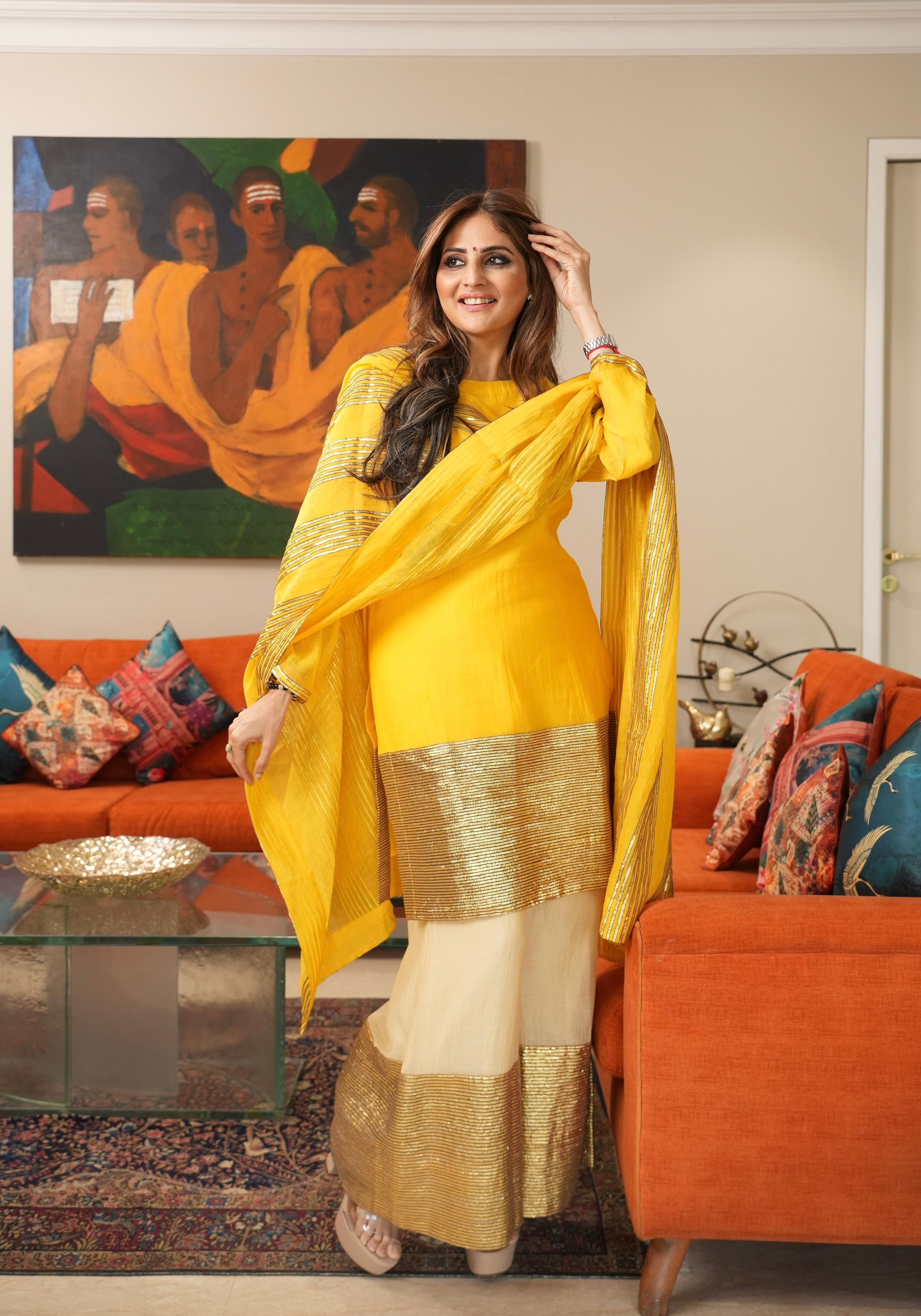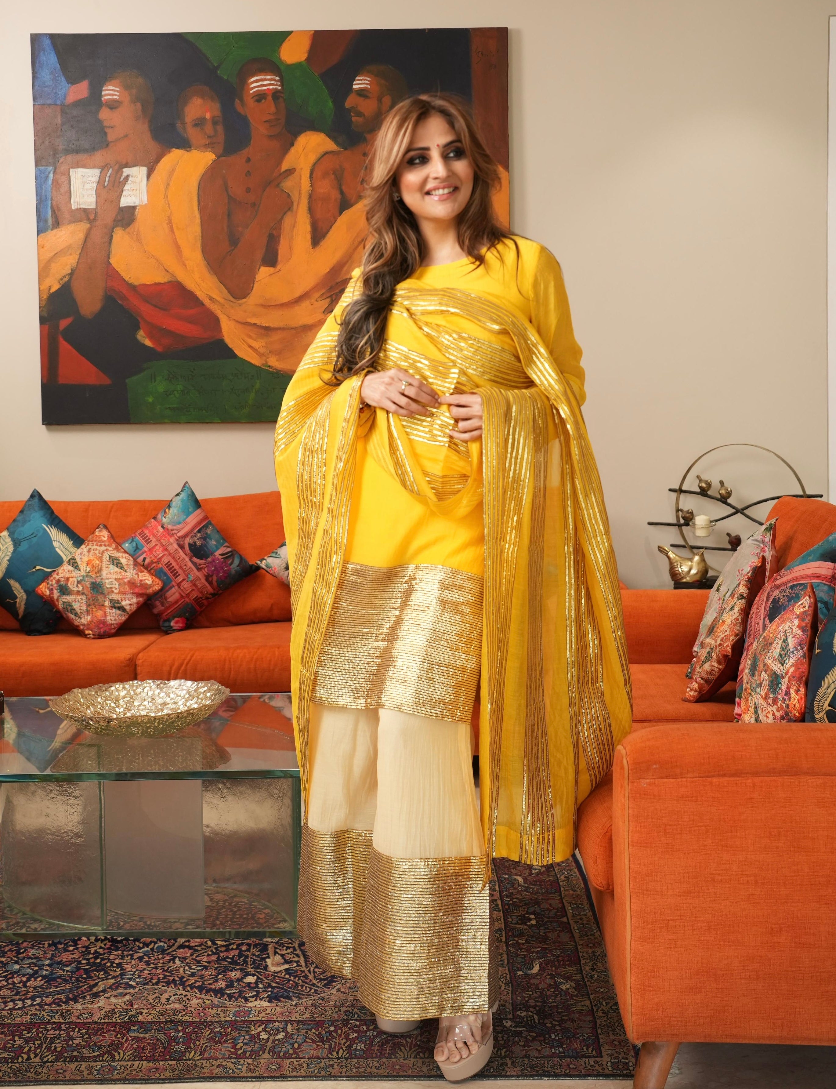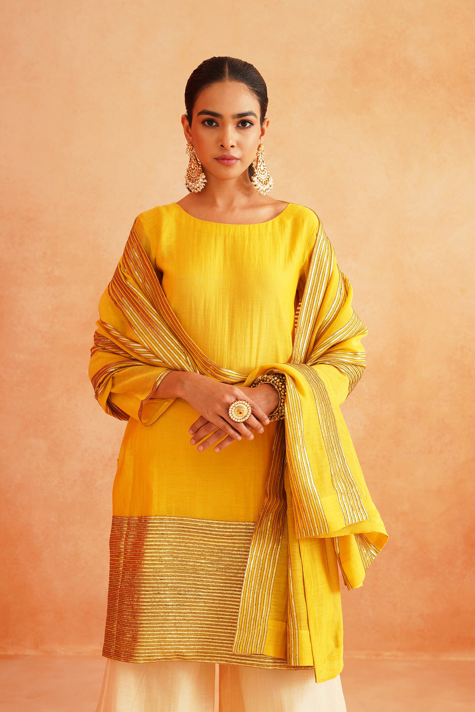 Pure soft chanderi kurta with extremely fine and intricate dull gold gota embroidery at the hem. This kurta set comes with a pure chanderi odhani with intricate gold detailing. The sharara is warm offwhite with a matching dull gold embroidery .This simple yet classic sharara set is a must have for every wardrobe. Pair it with polki or gold jewellery for an exquisite royal look.