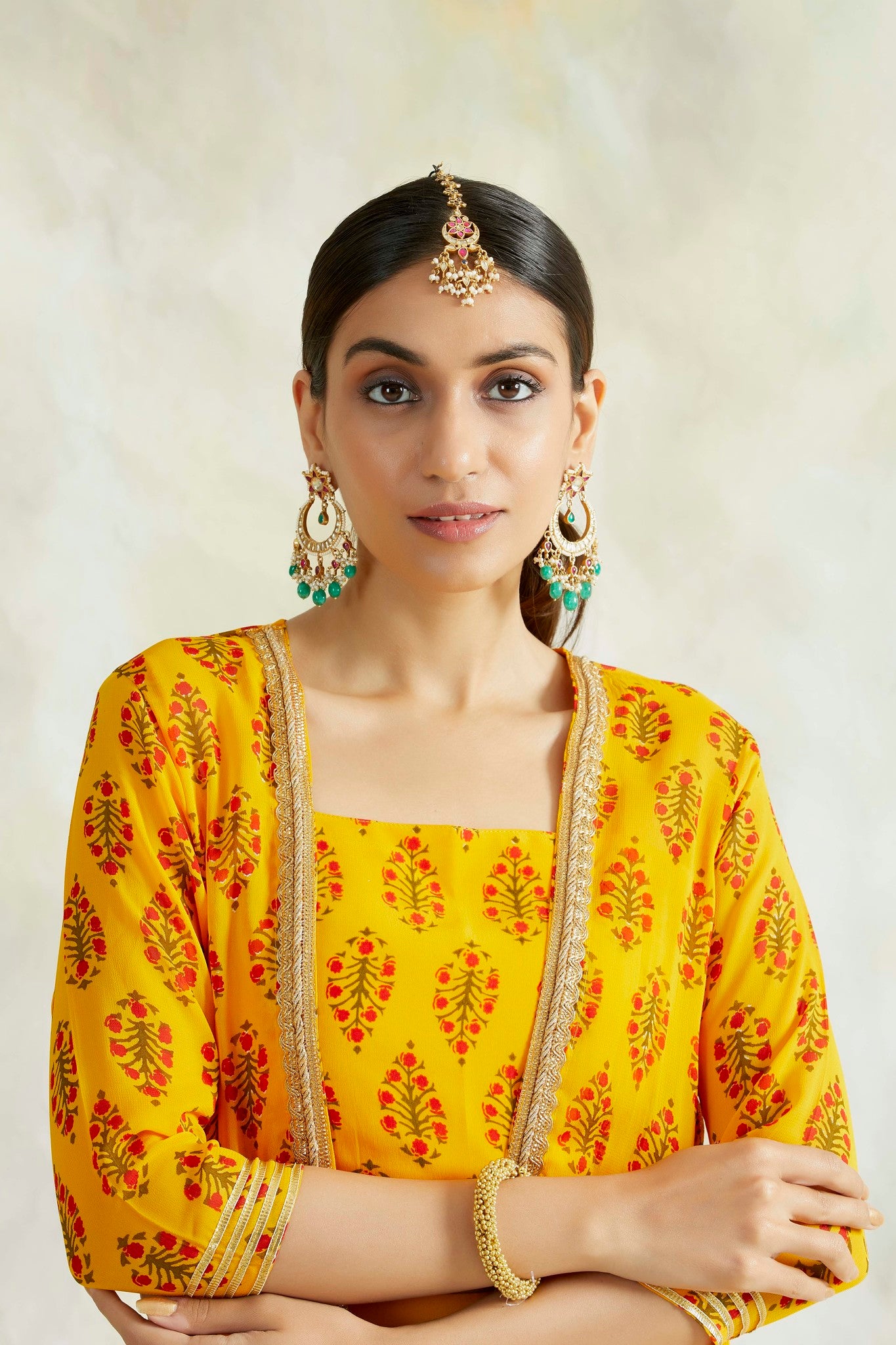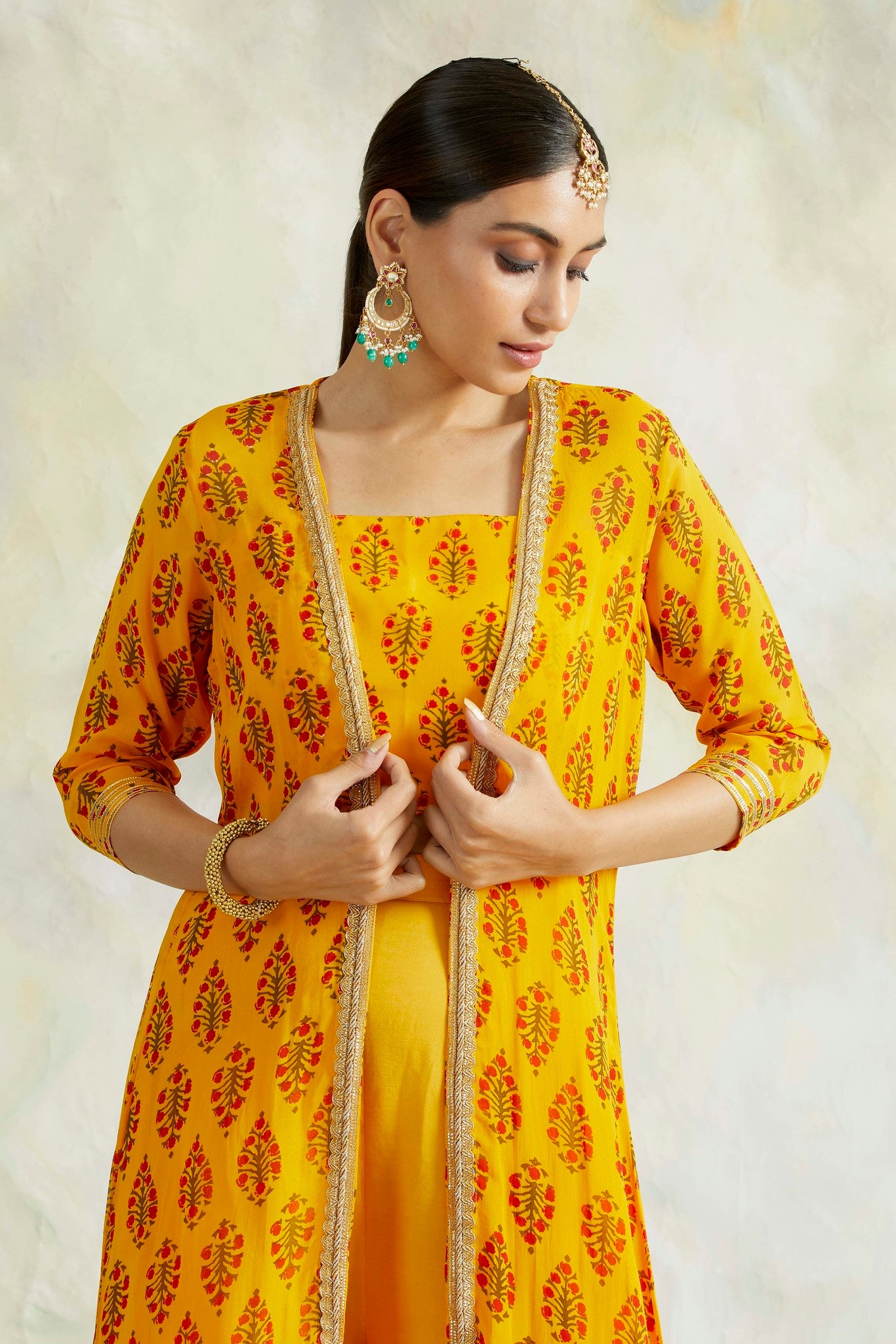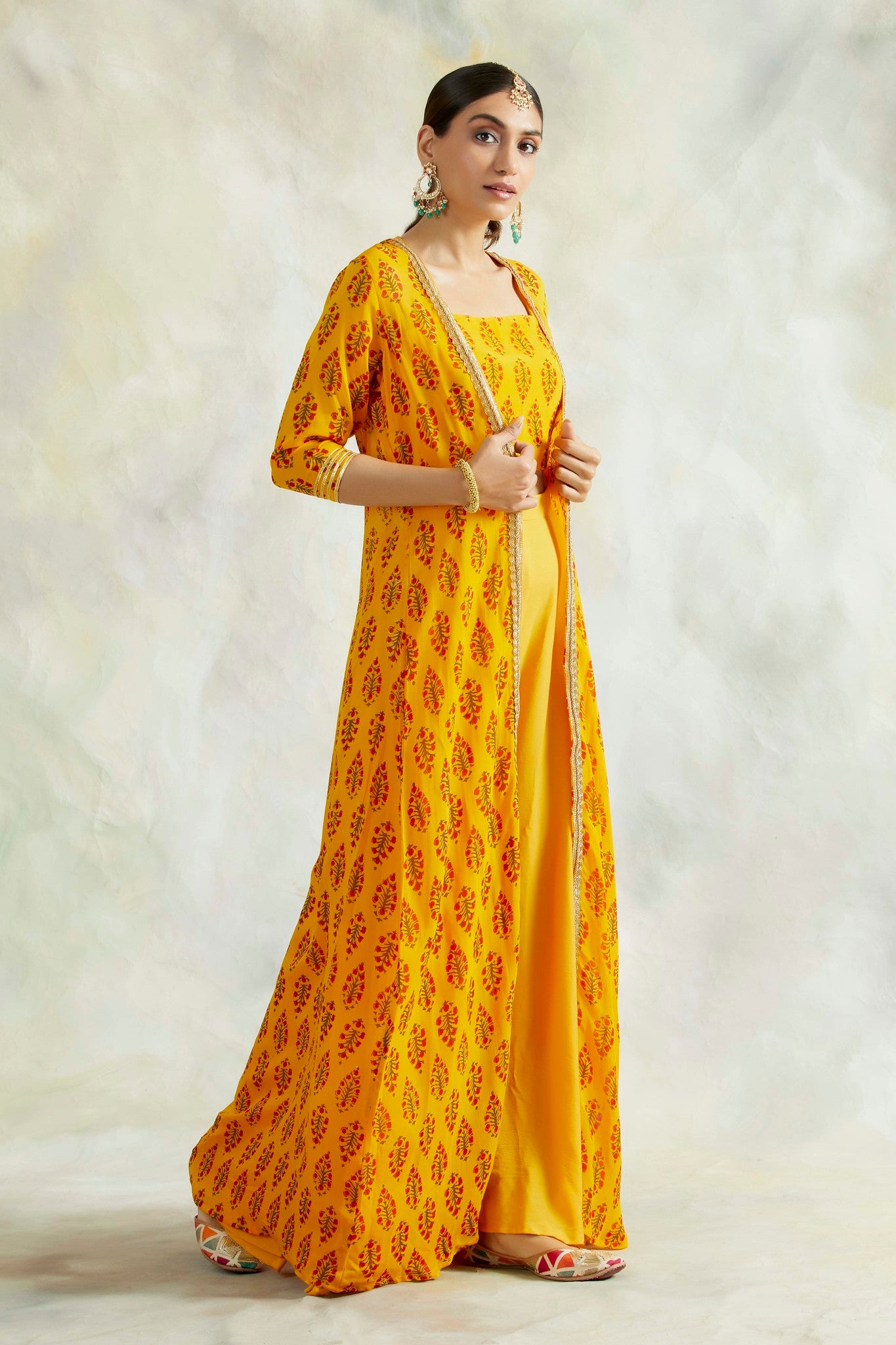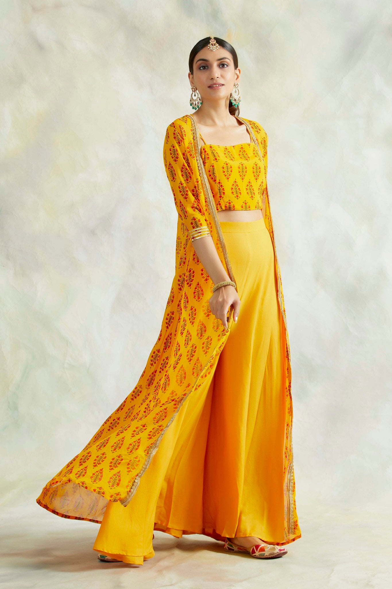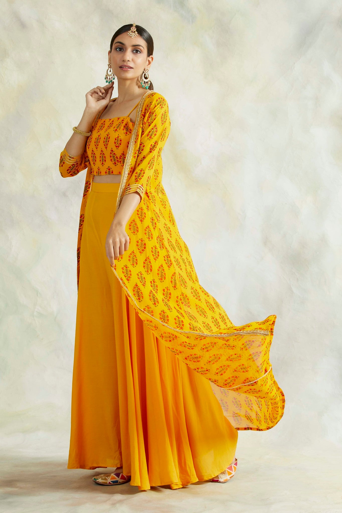 Details: Mustard printed cape in pure georgette with intricate hand gota detailing at the the neck. It is paired with pure crepe crop top with straps and soft cotton modal flair pants accentuating the waist