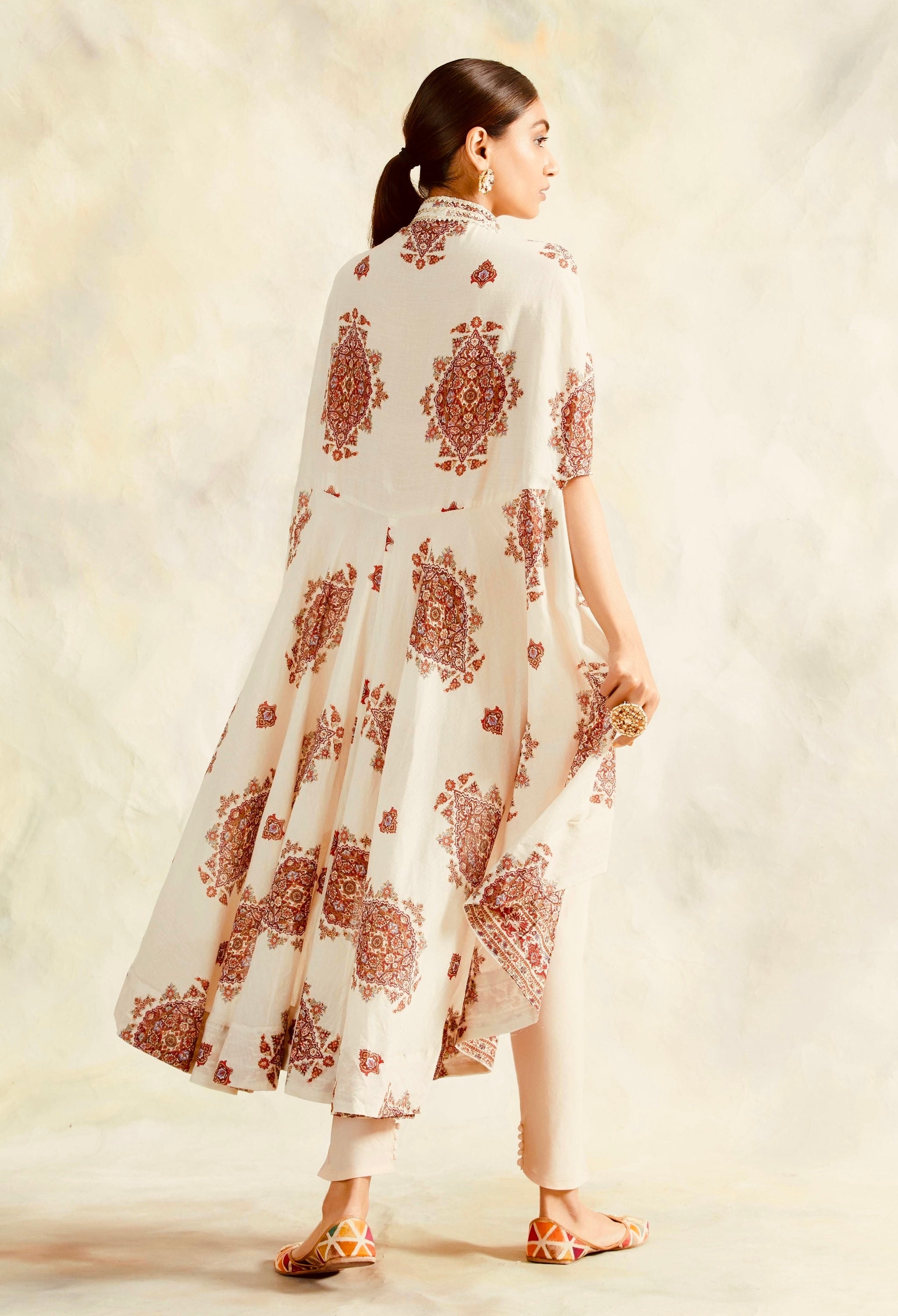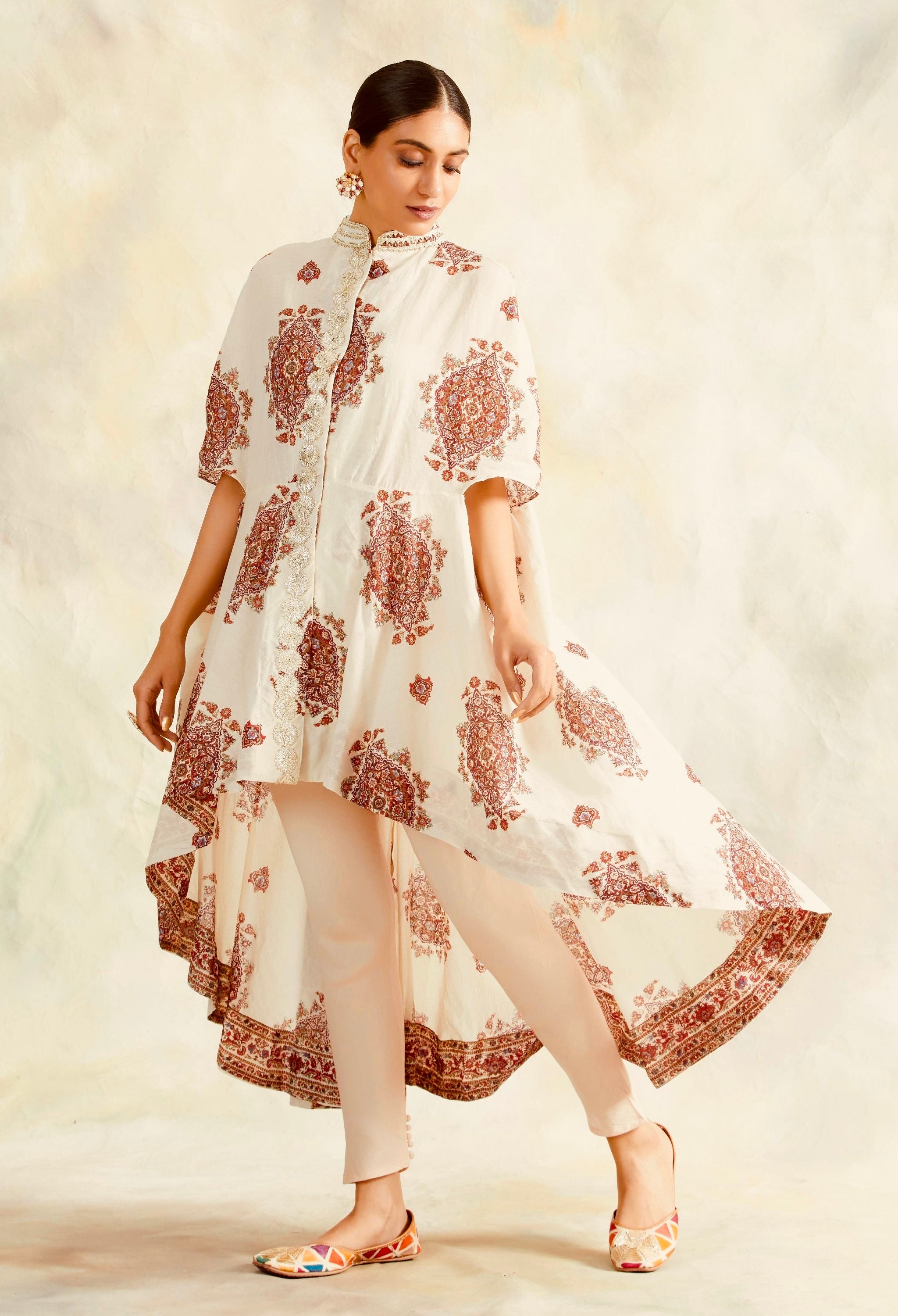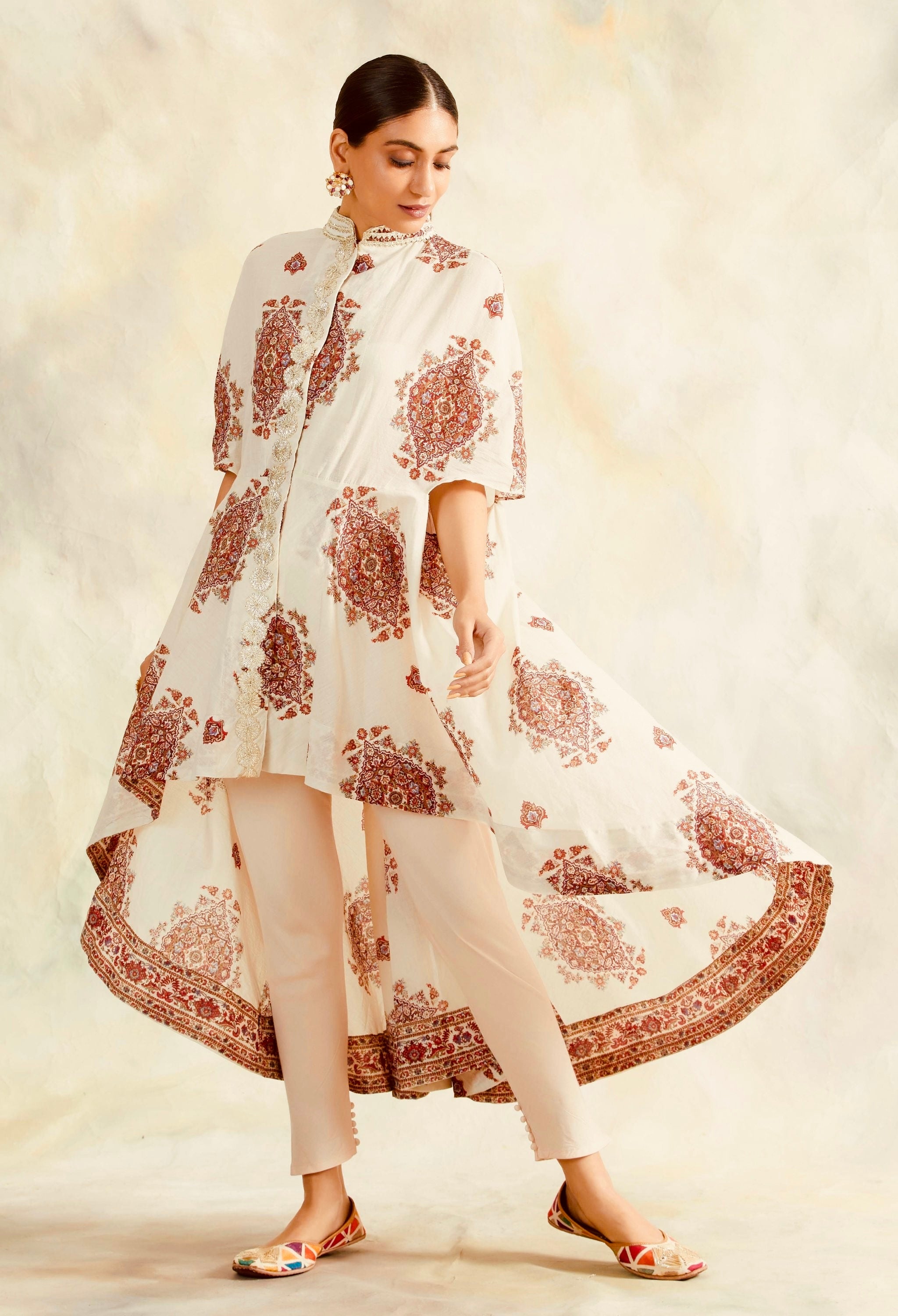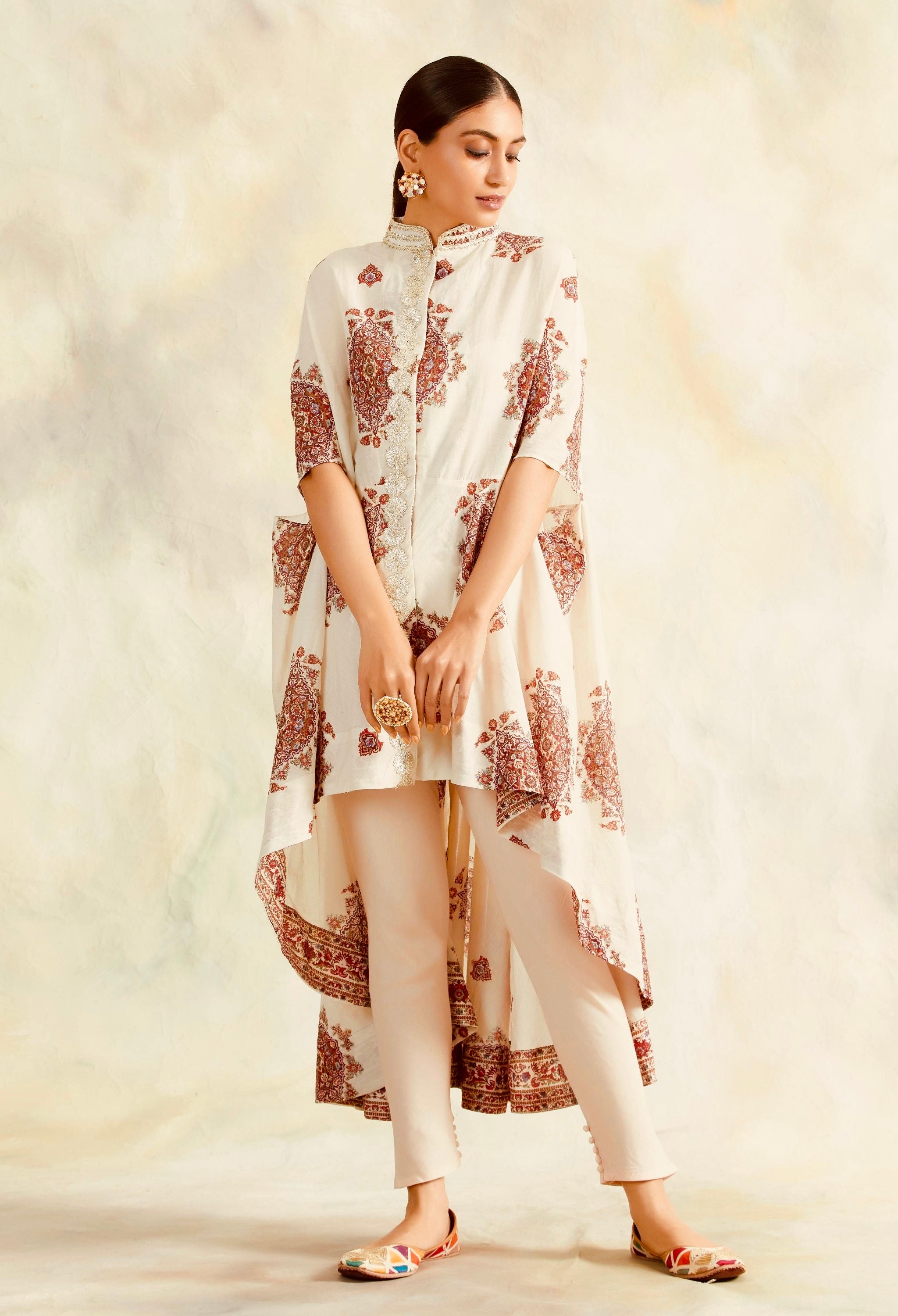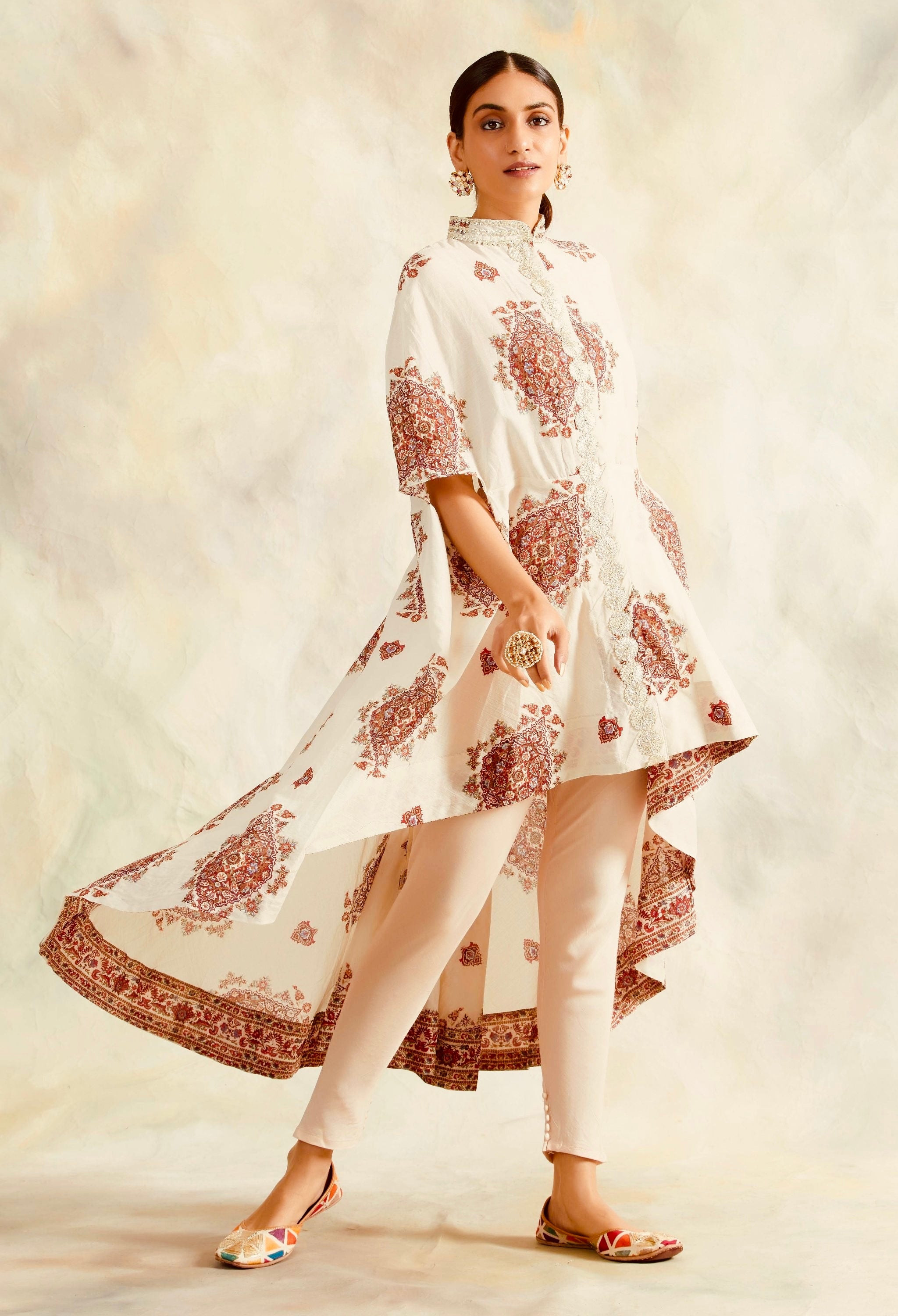 This signature piece is our hero product. Mihika will take you from day to night. Free flowing, high low top with exquisite block print and gota detailing. Comes with sleek tulip pants with button detailing at the edge