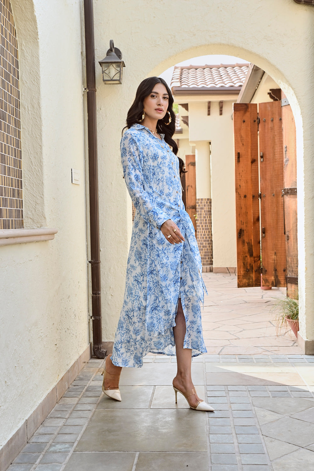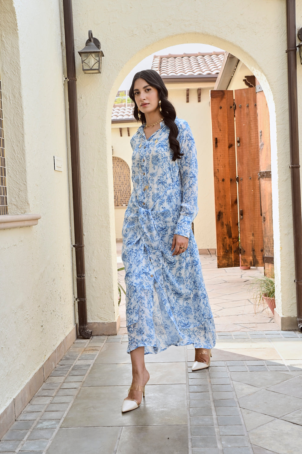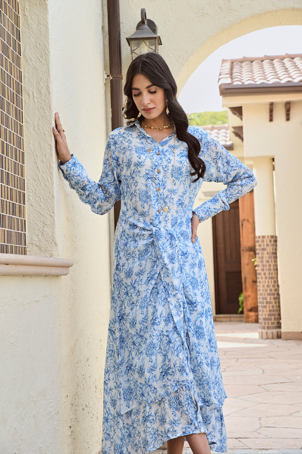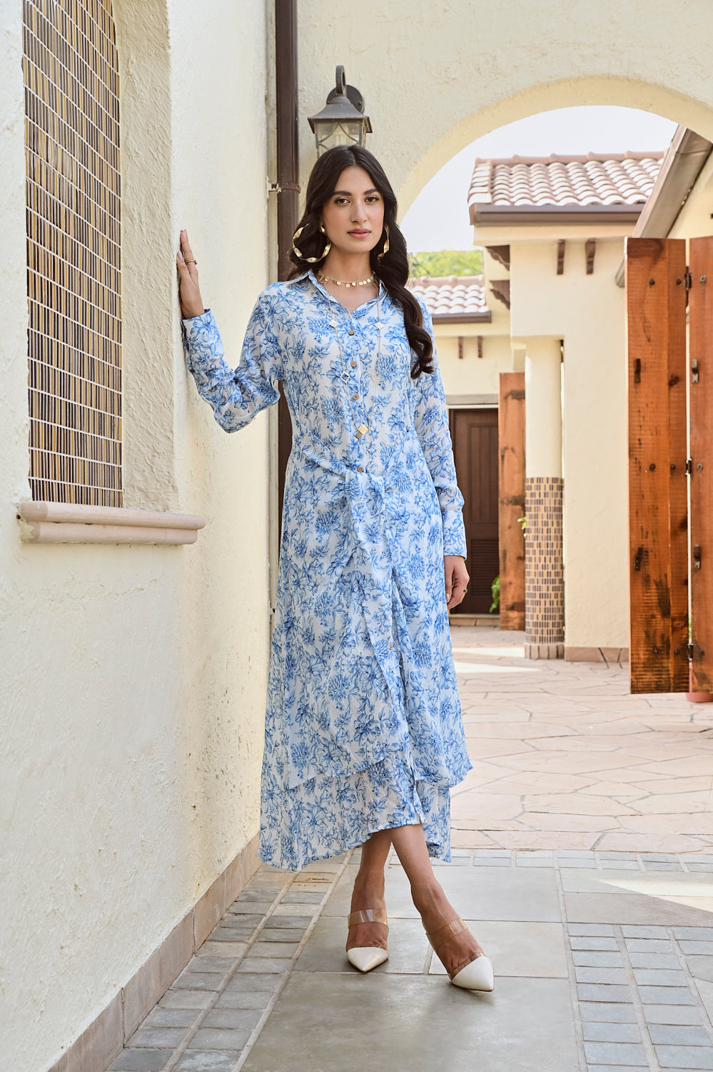Button down dress with front tie detail to cinch the waist as per your comfort . This dress is the perfect summer stable , made in soft crepe in blue and ivory floral print and the softest cotton mulmul slip.
