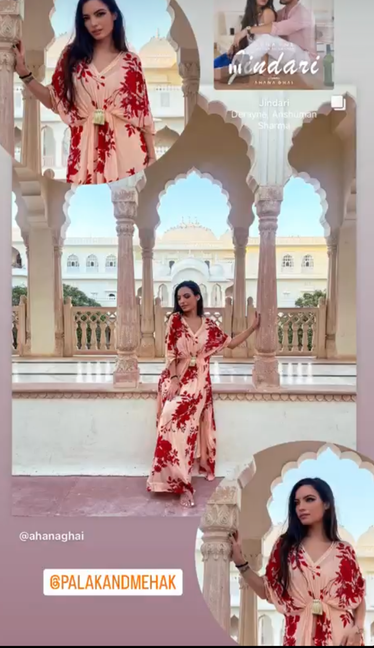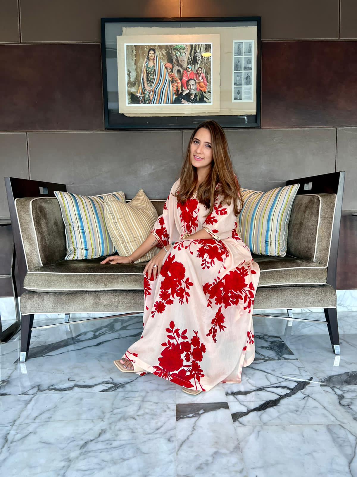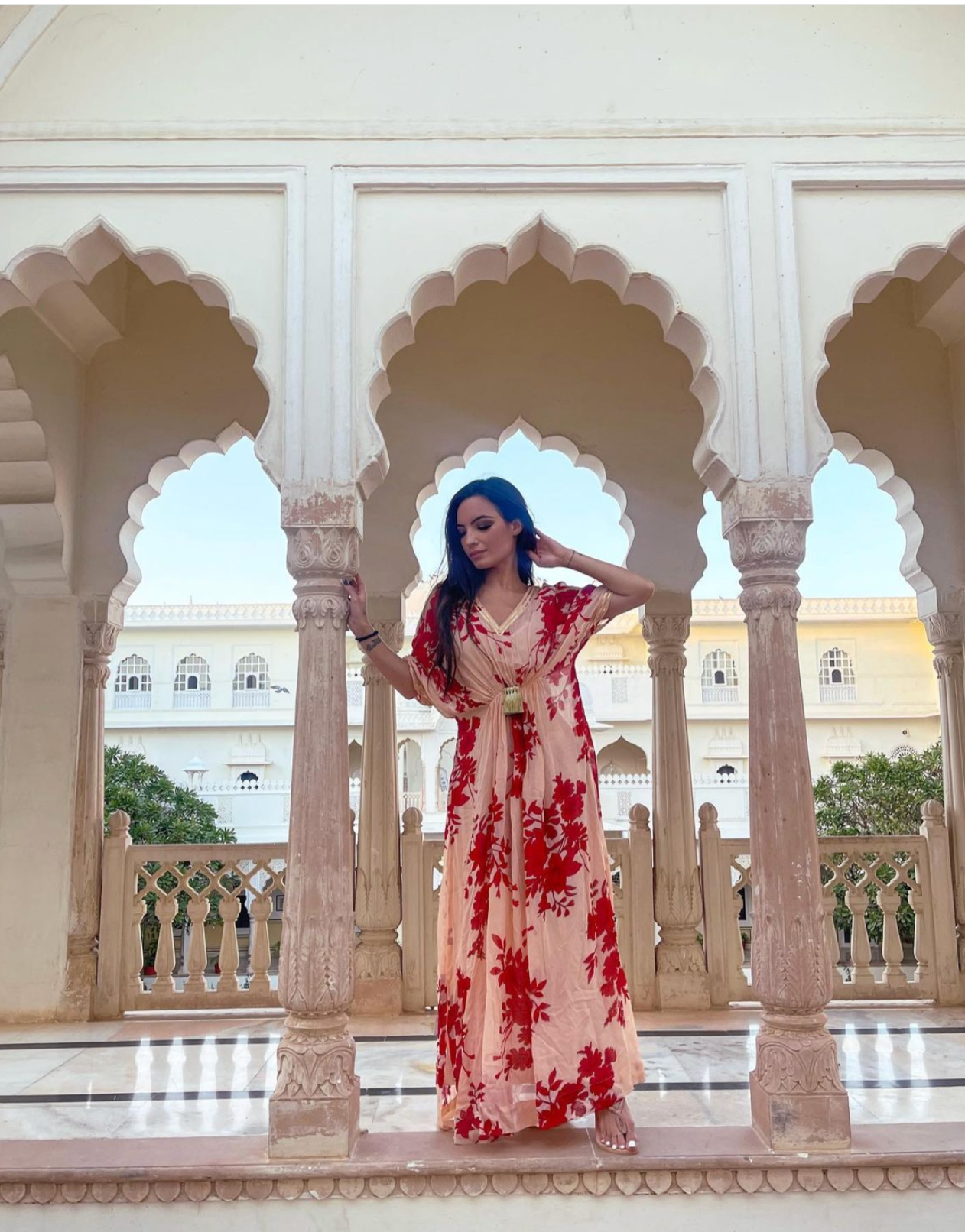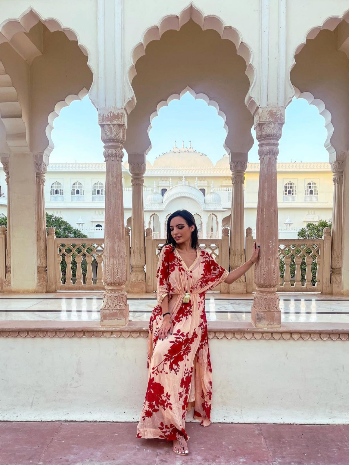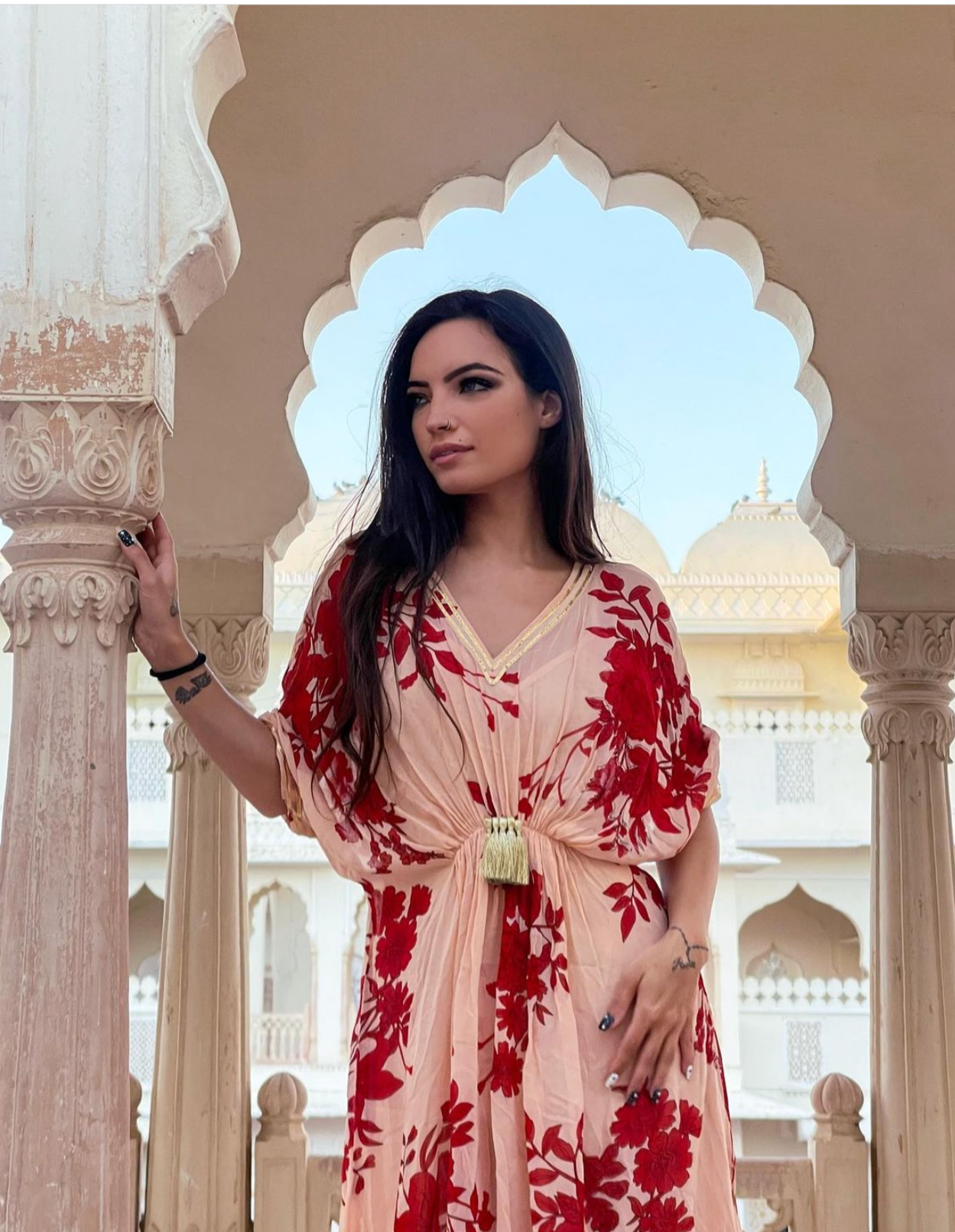 This vivid printed Kaftan Dress is a sure shot head turner this festive season. Style it with polki jewelry and mojaris for a Mehndi celebration. Or wear it with statement gold hoops and gladiators for a beach soiree. A must have piece in your wardrobe. It come with a soft cotton slip.