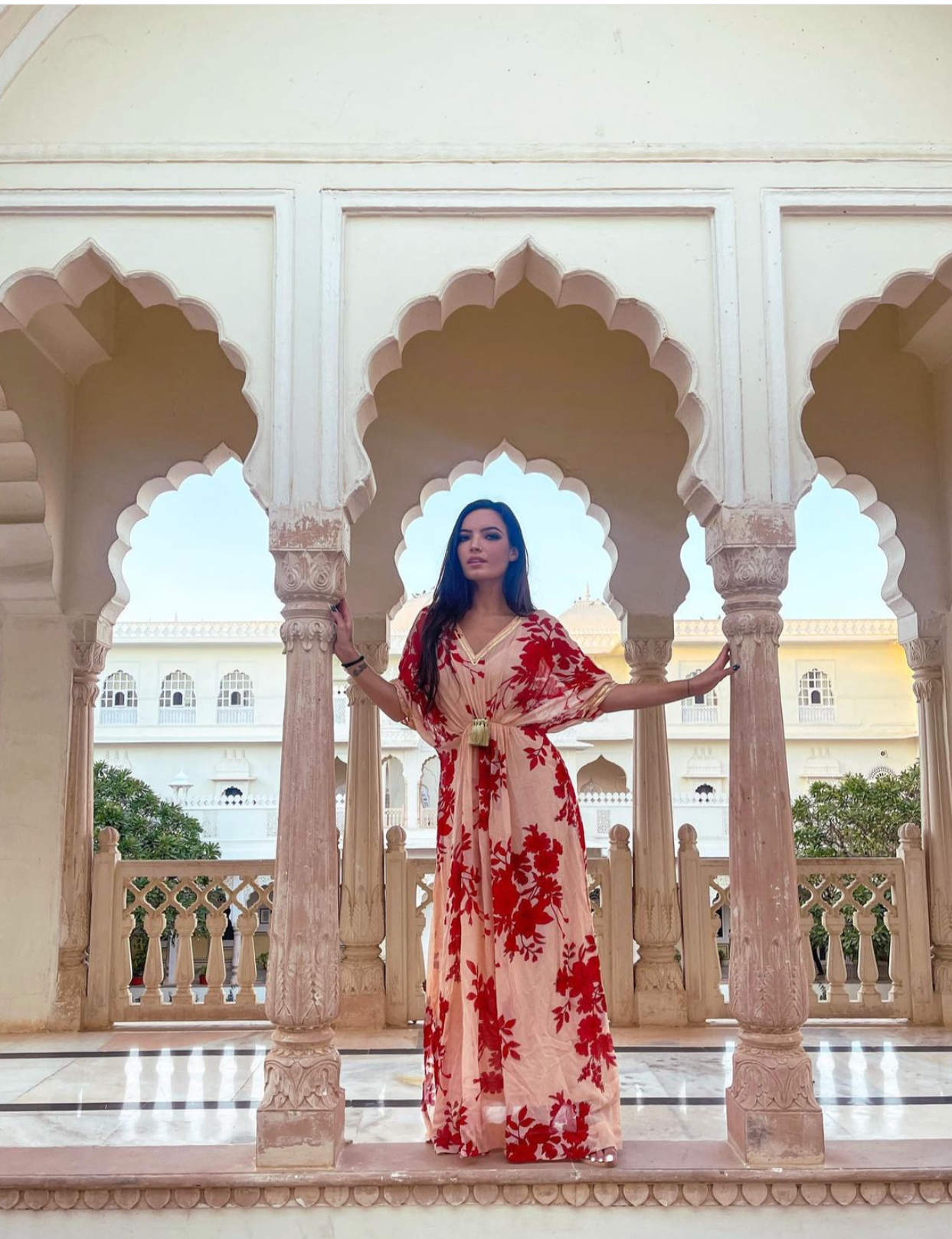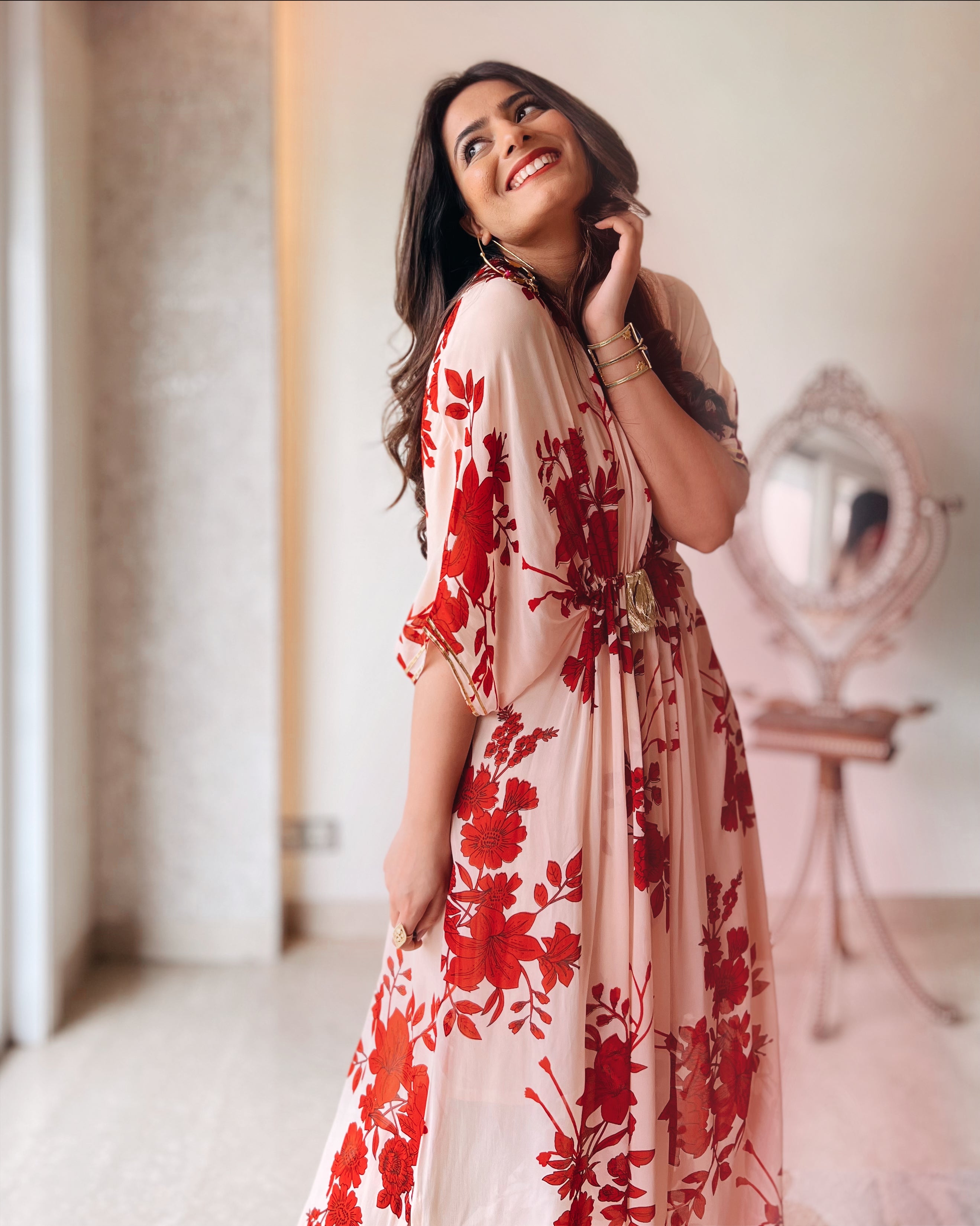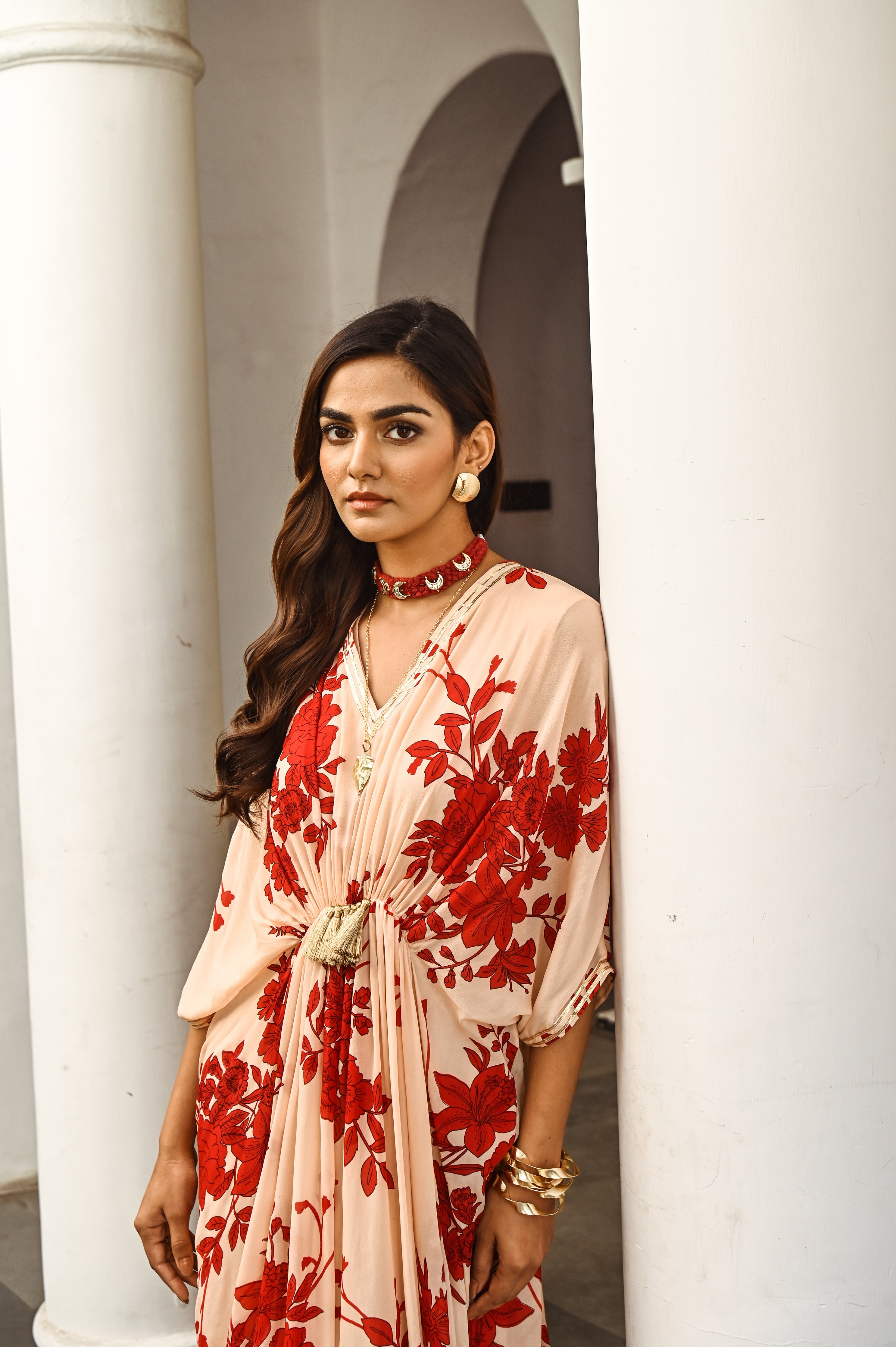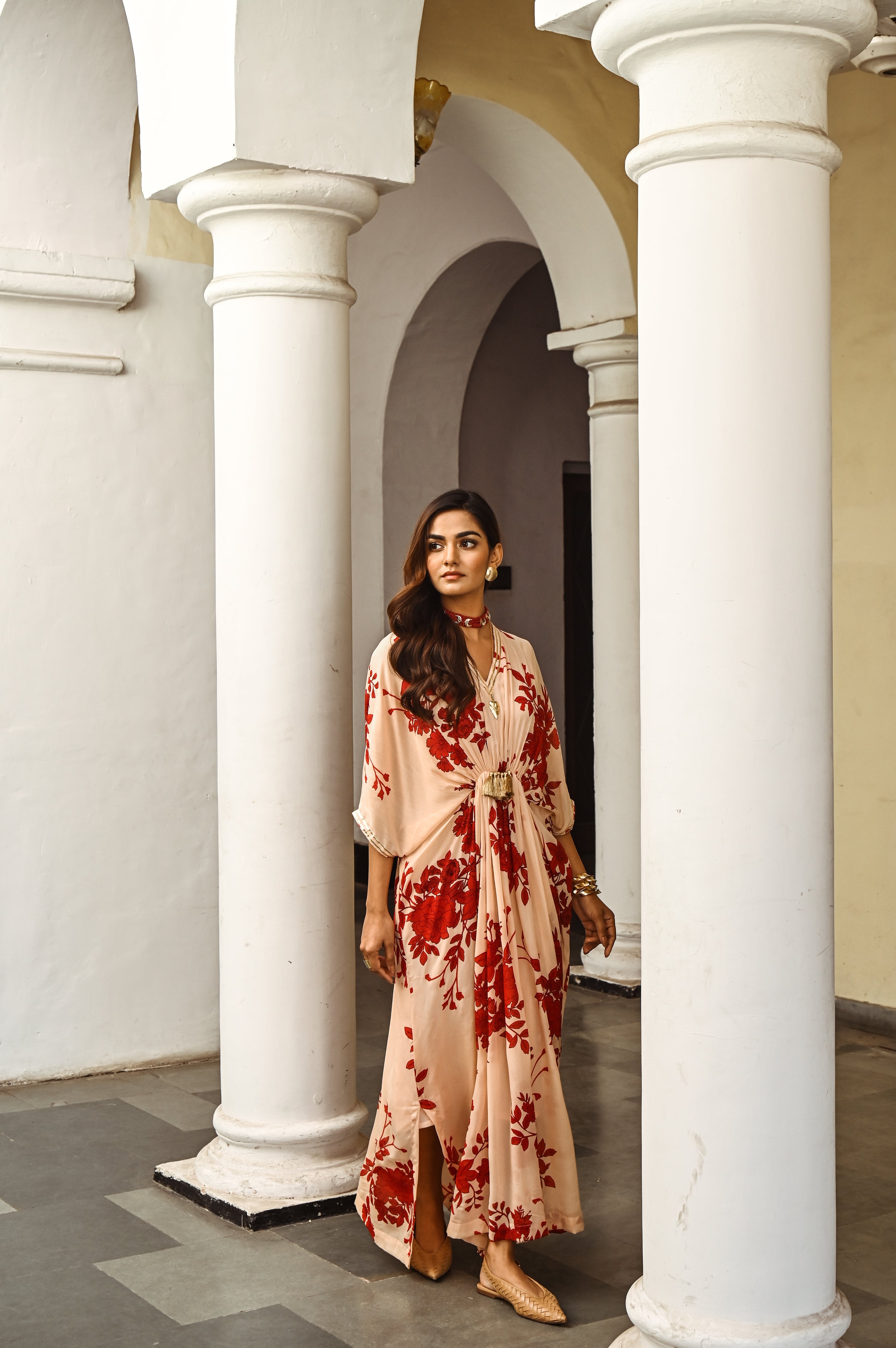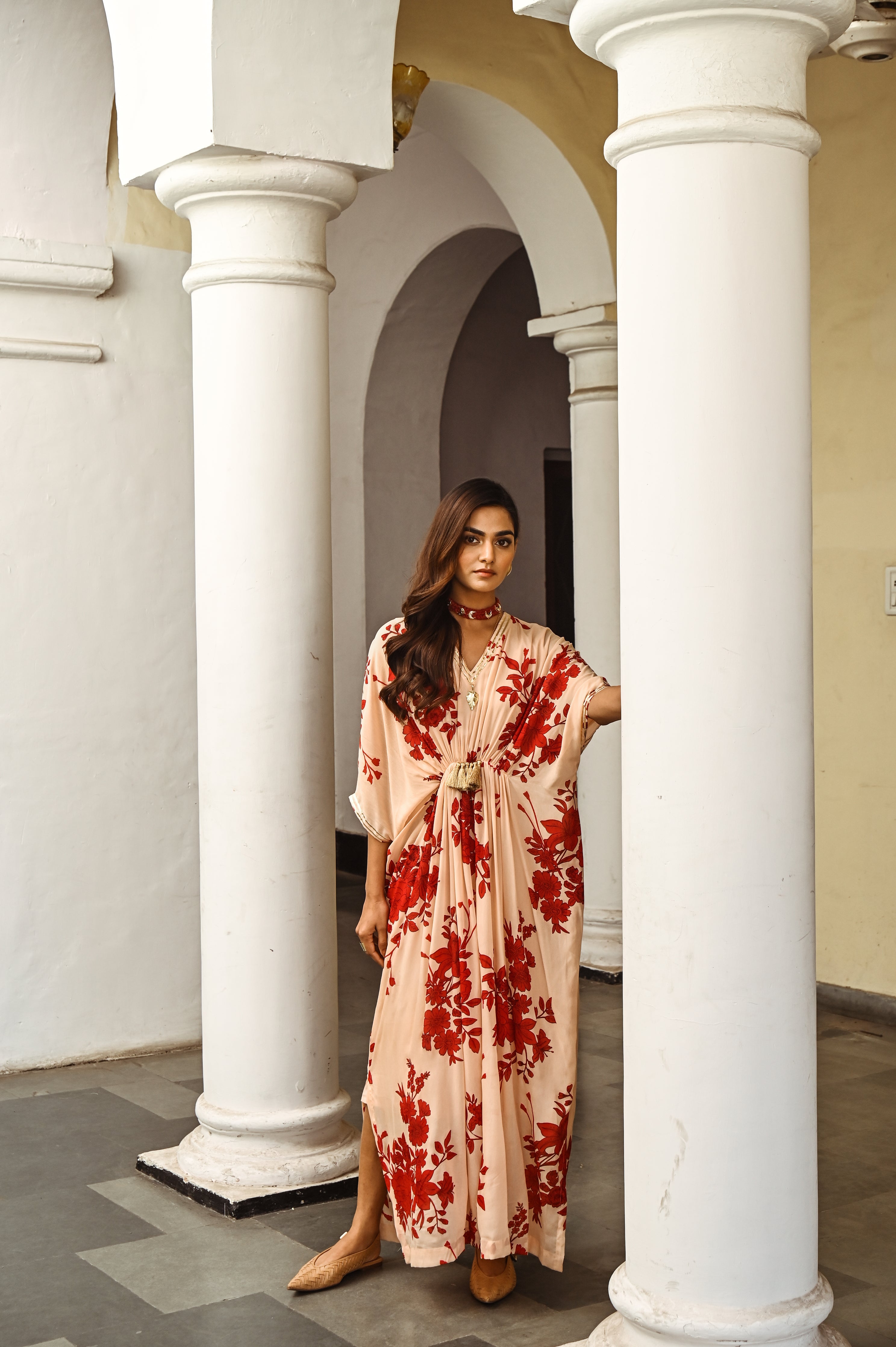 SAKSHI MEHRA I BEIGE & RED FLORAL MASHA KAFTAN