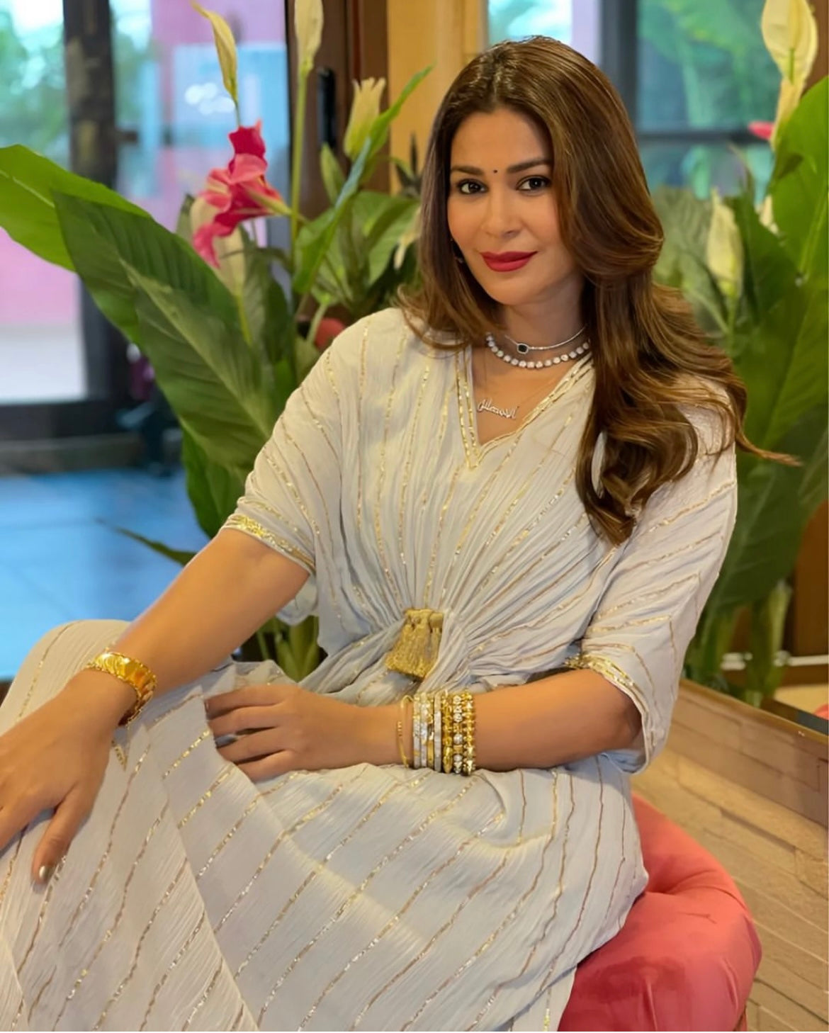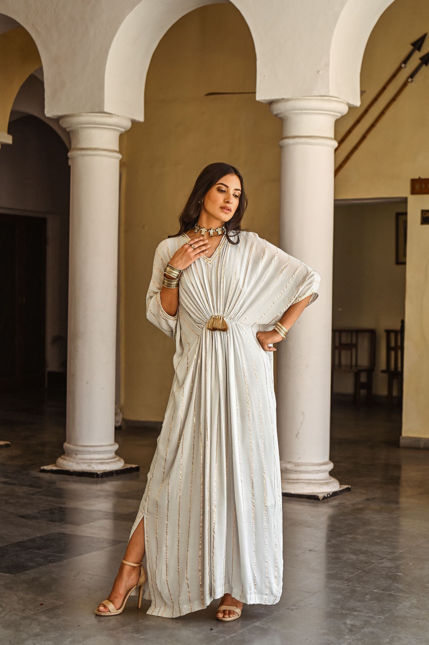 This vivacious Kaftan Dress is a sure shot head turner this festive season. Style it with polki jewelry and mojaris for a Mehndi celebration. Or wear it with statement gold hoops and gladiators for a beach soiree. A must have piece in your wardrobe. It come with a soft cotton slip
