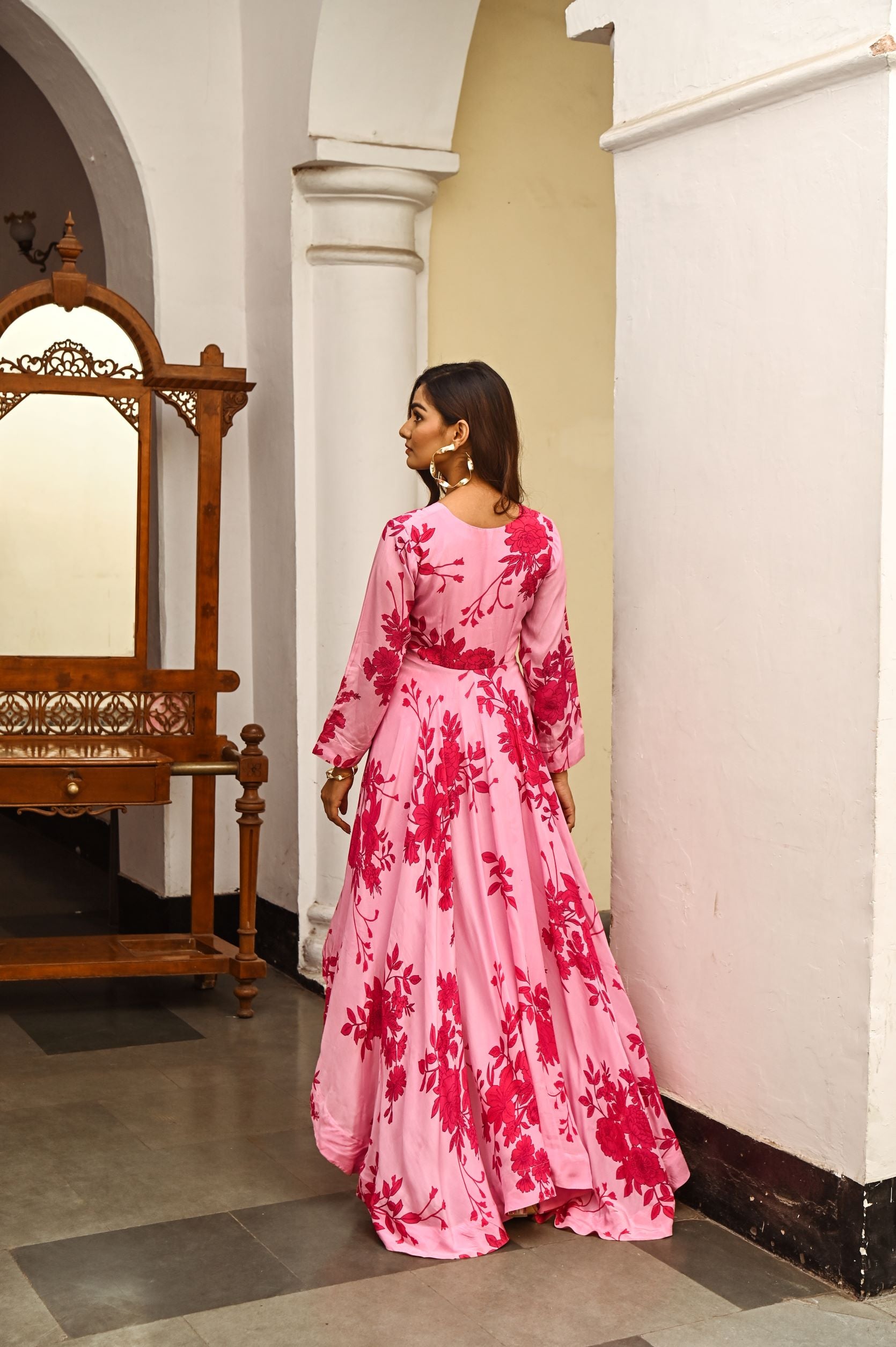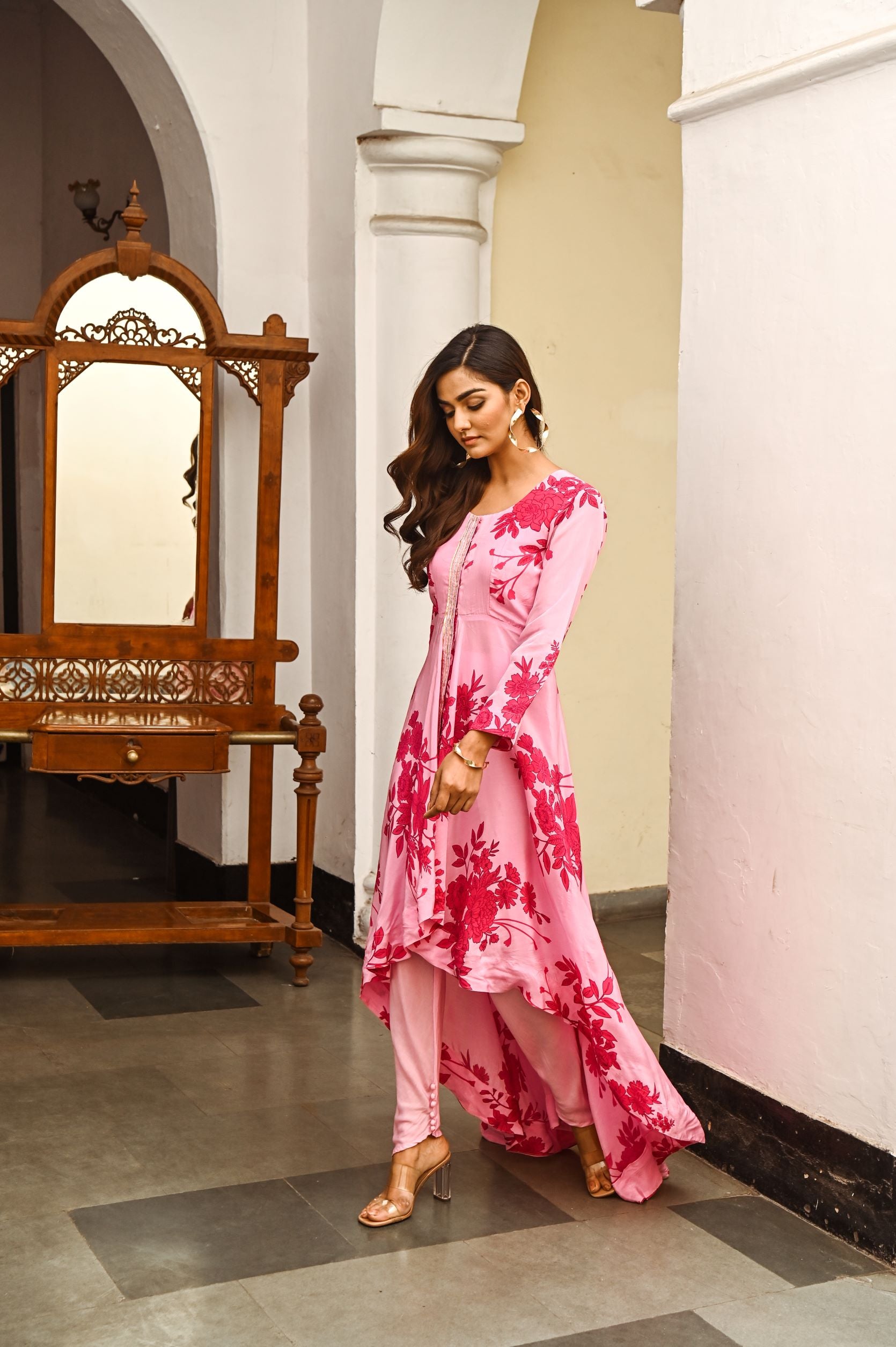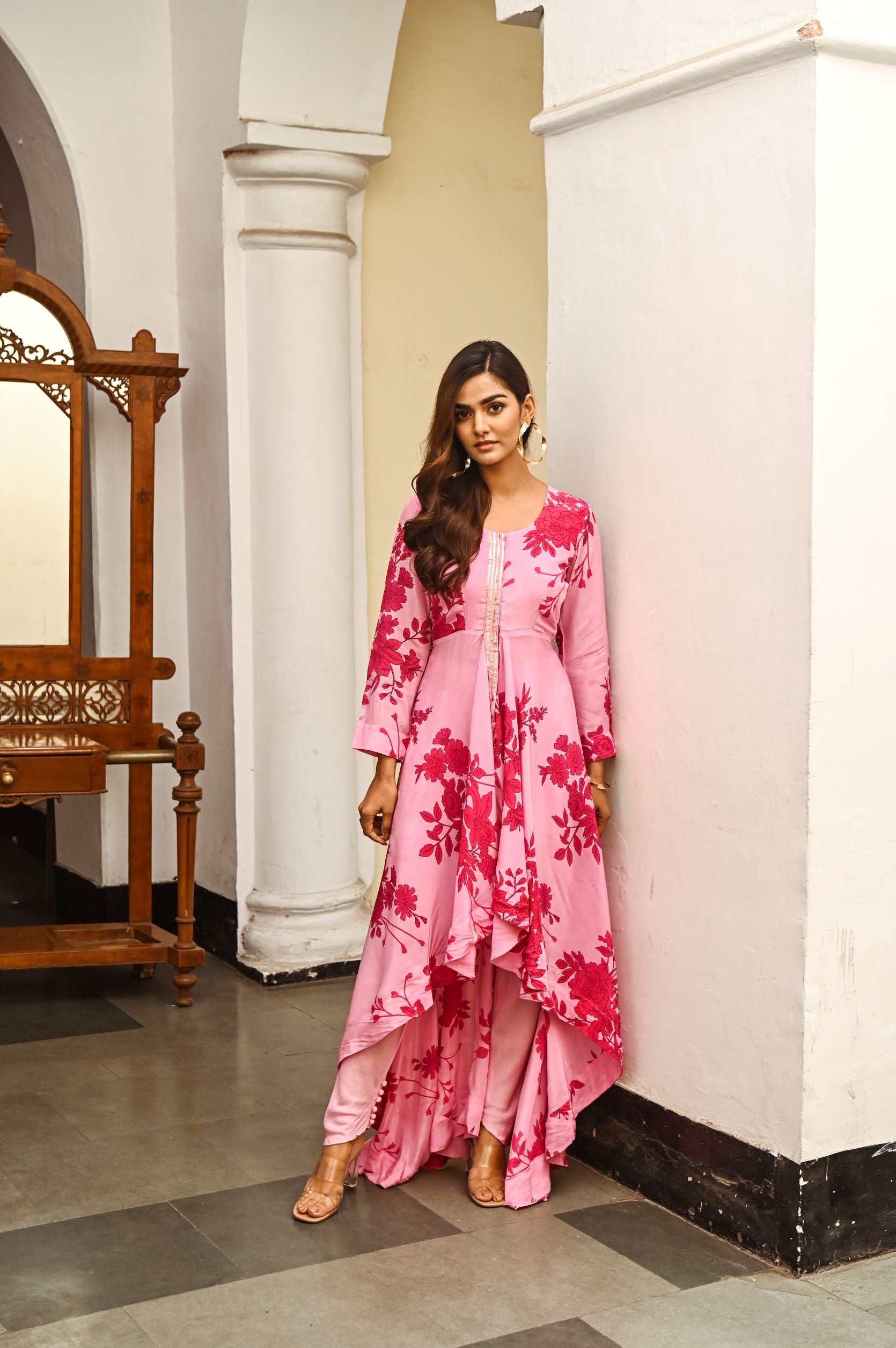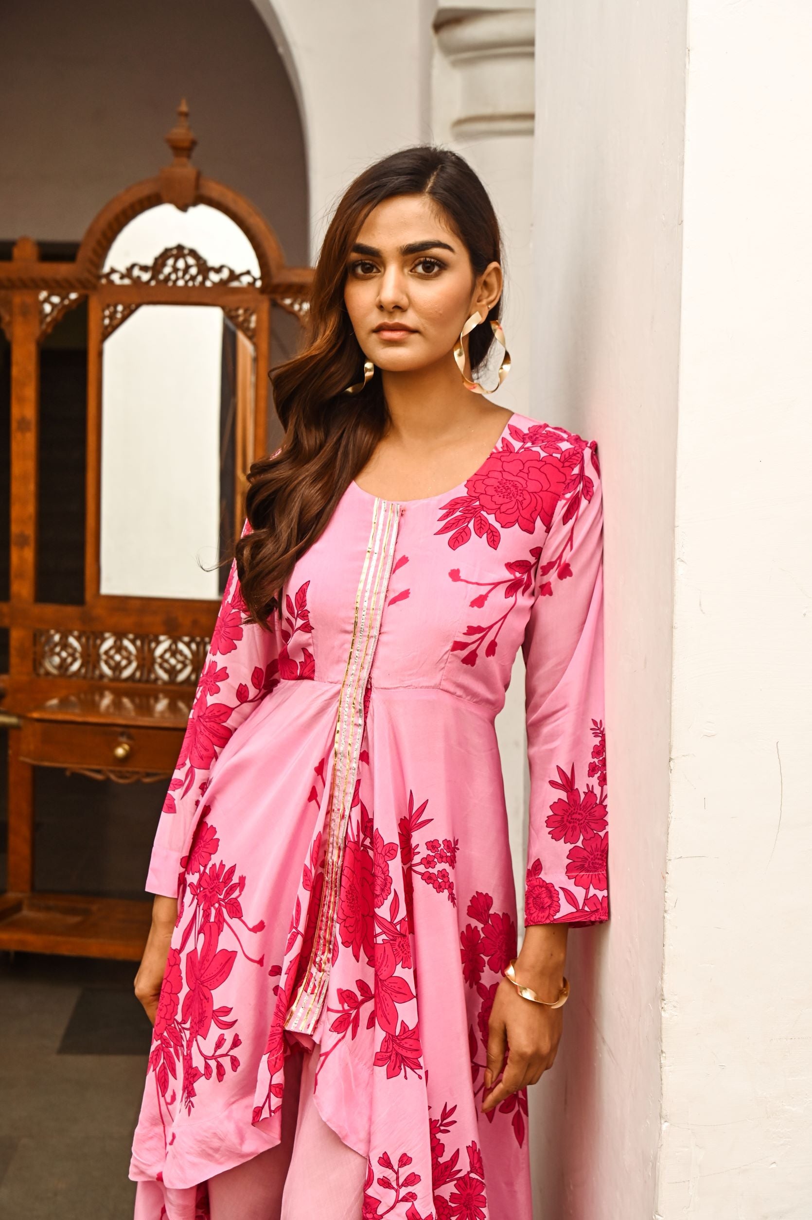 Make heads turn in this statement making piece. Soft crepe high low top with intricate block print. It comes with ivory cotton pants. Hand gota detailing accentuates this breezy set. Style this set with statement earrings and white pumps.