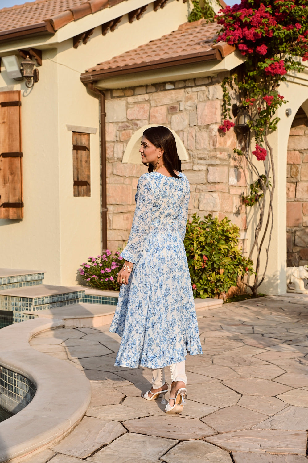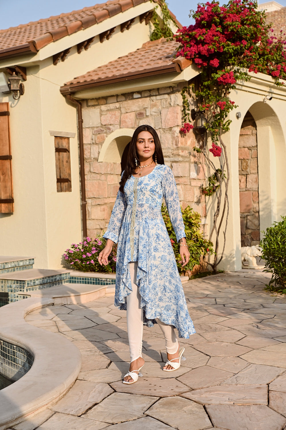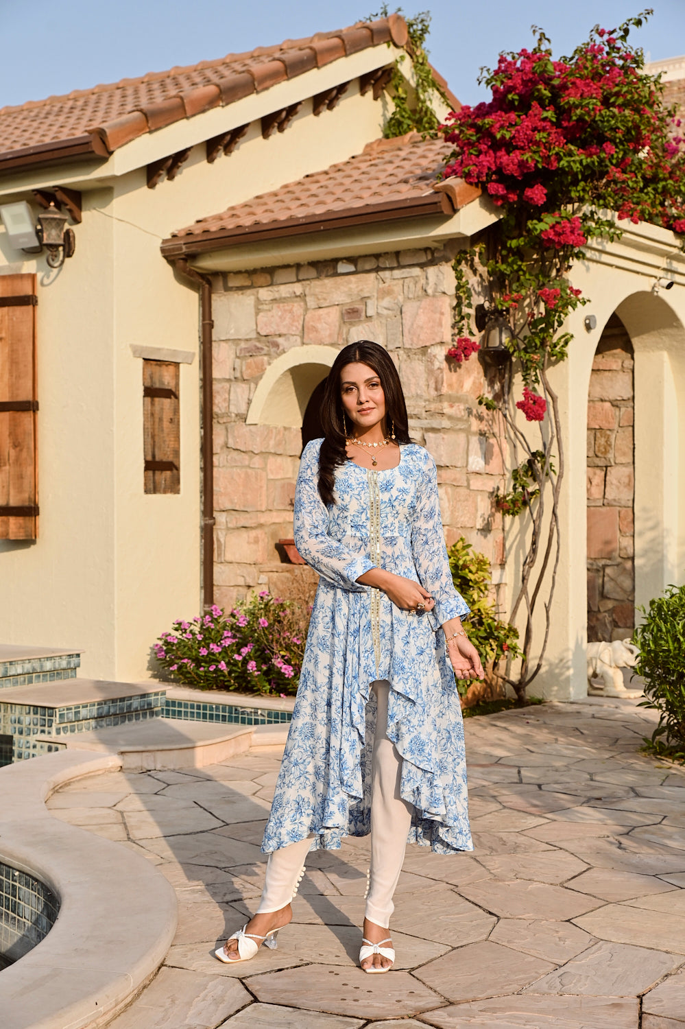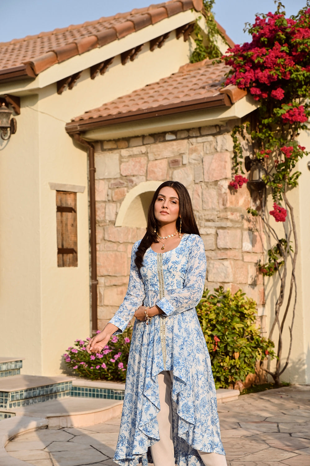 Make heads turn in this statement making piece. Soft crepe high low top with intricate floral print. It comes with ivory cotton pants. Hand gota detailing accentuates this breezy set. Style this set with statement earrings and white pumps.