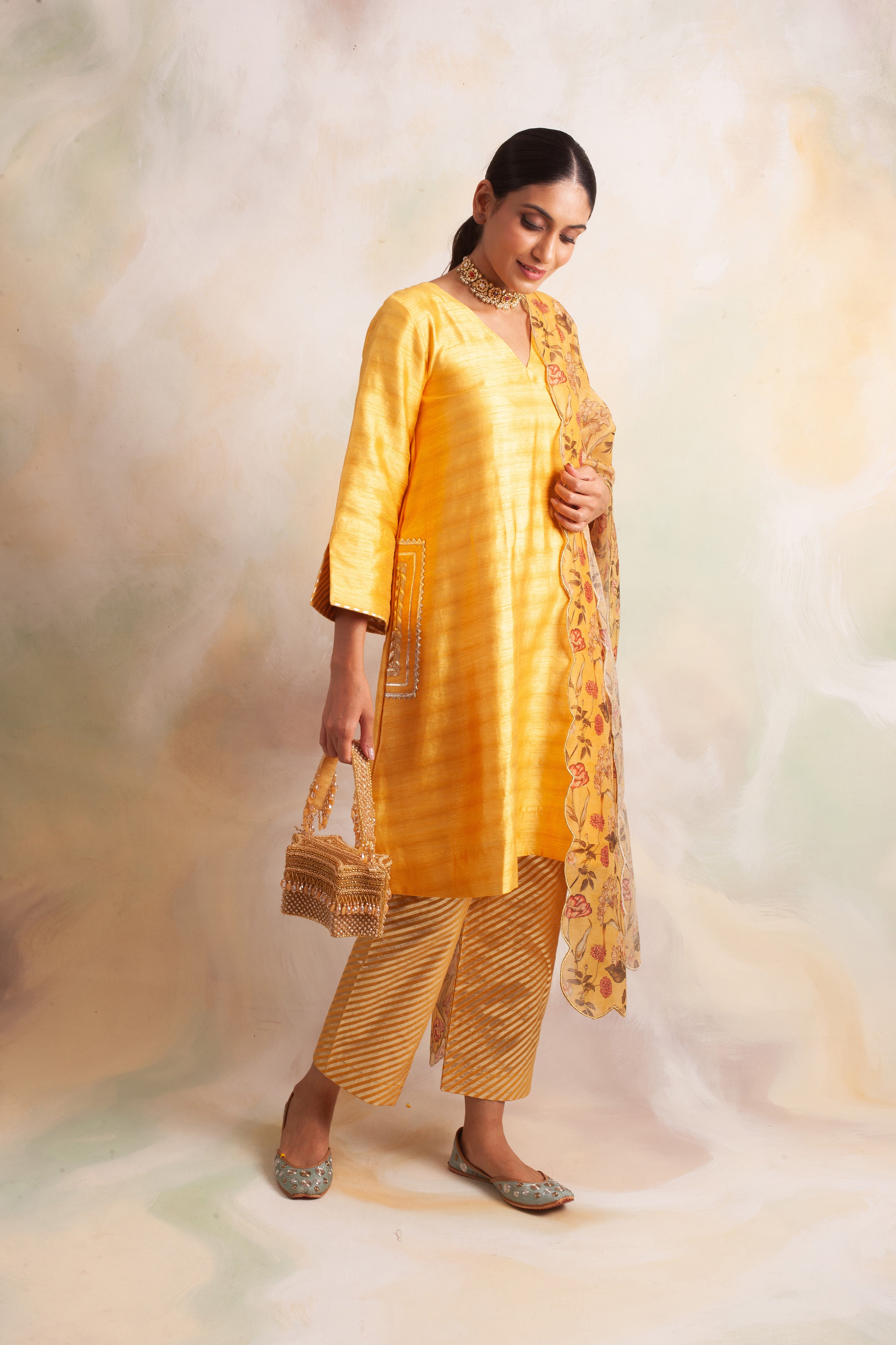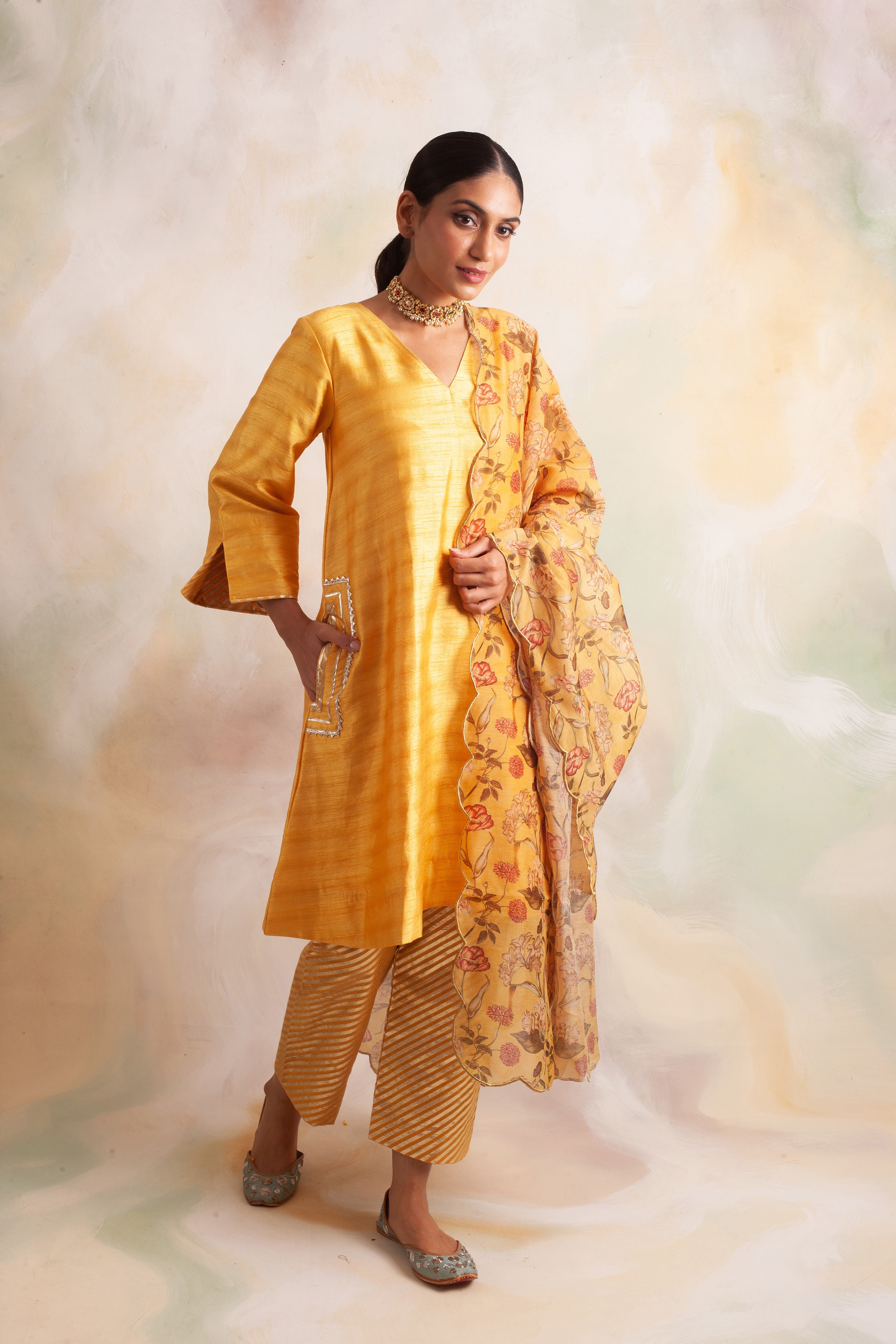 Details: V neck kurta with gota detail pockets, benarasi straight pants and Chandheri Odhani With Scalloped edges