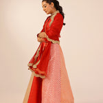 A dramatic benarasi kurta anarkali kurta with intricate dull gold gota details. Benarasi woven fabric kalis to give the Myra set a royal look.This kurta set comes with a net odhani & summer silk trousers.