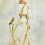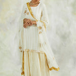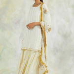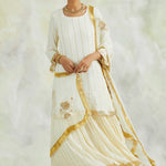 Kurta with attached crushed skirt in soft rayon crepe with gold lurex details , intricate zardozi and gota accents at the neckline, hem and sleeve ends. It has an attached lining in soft cotton voile. Chiffon odhani with intricate thread embroidery and antique gold details at the edge.