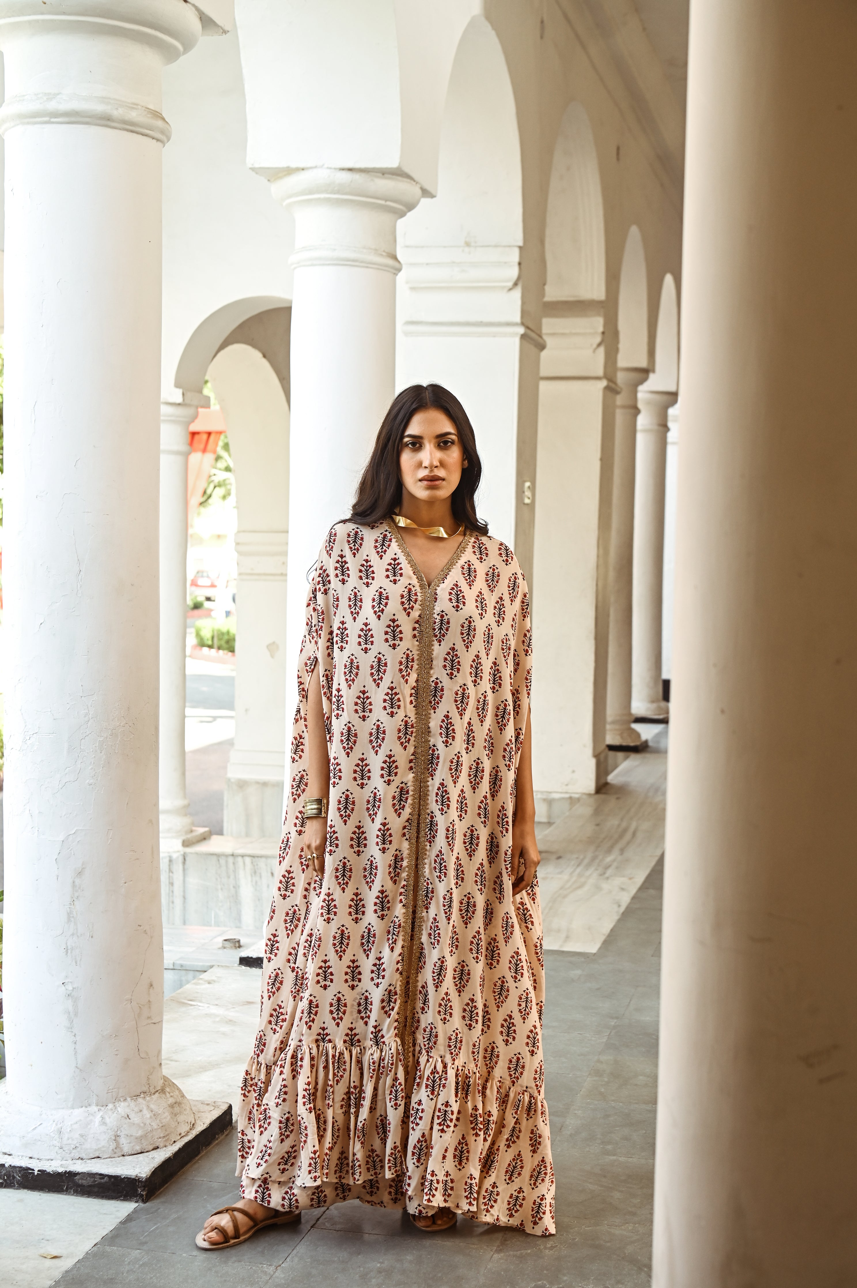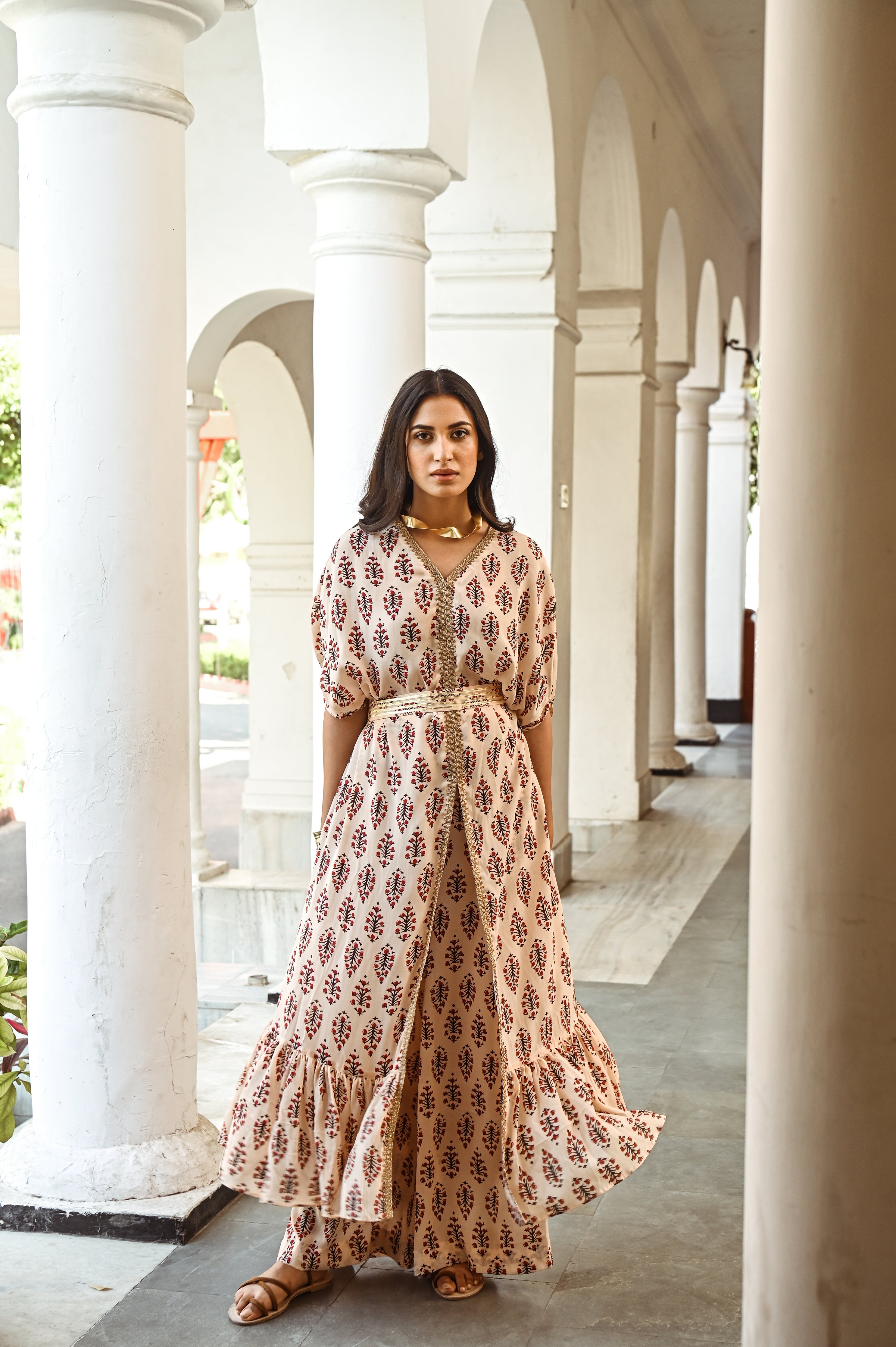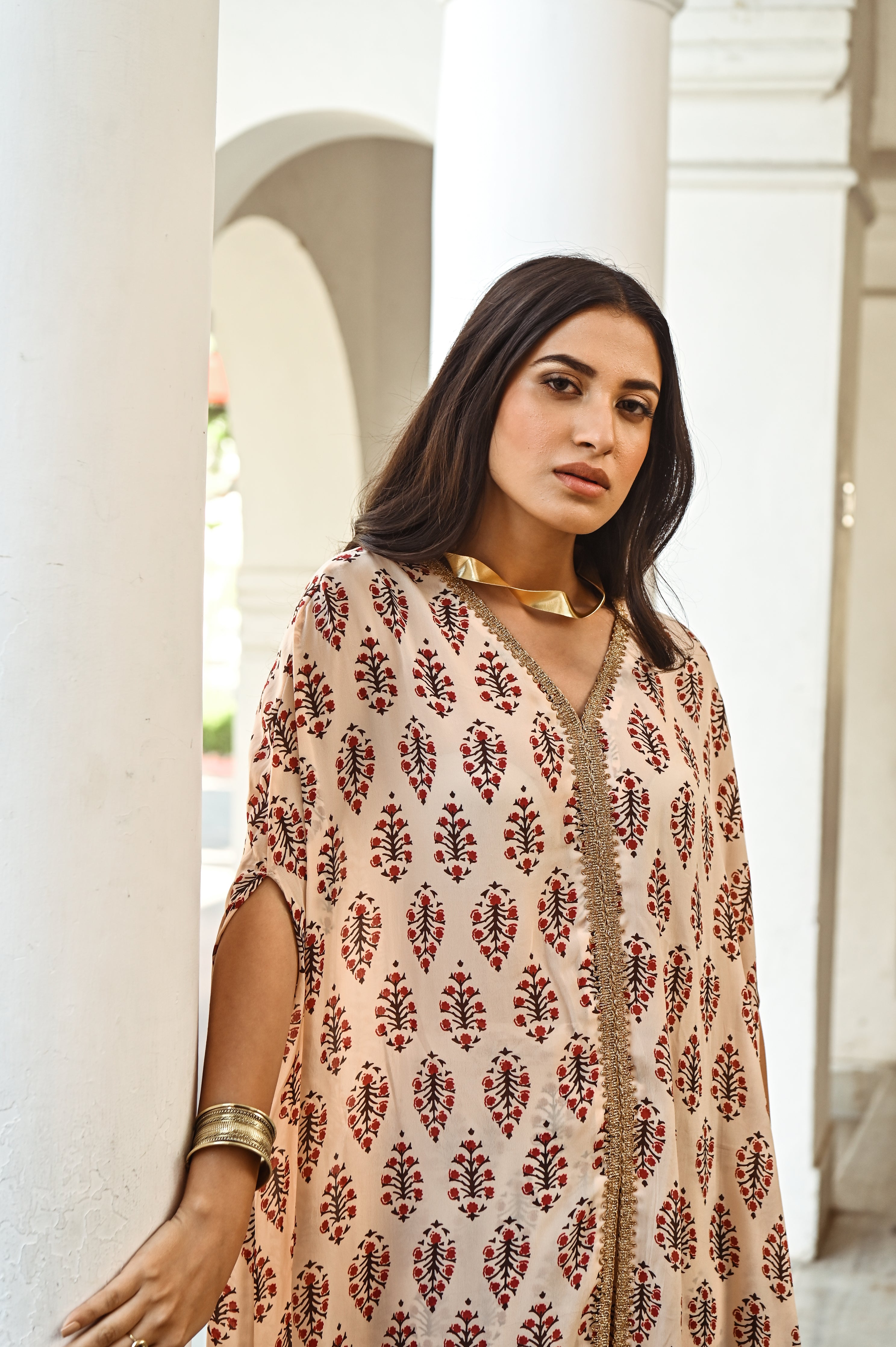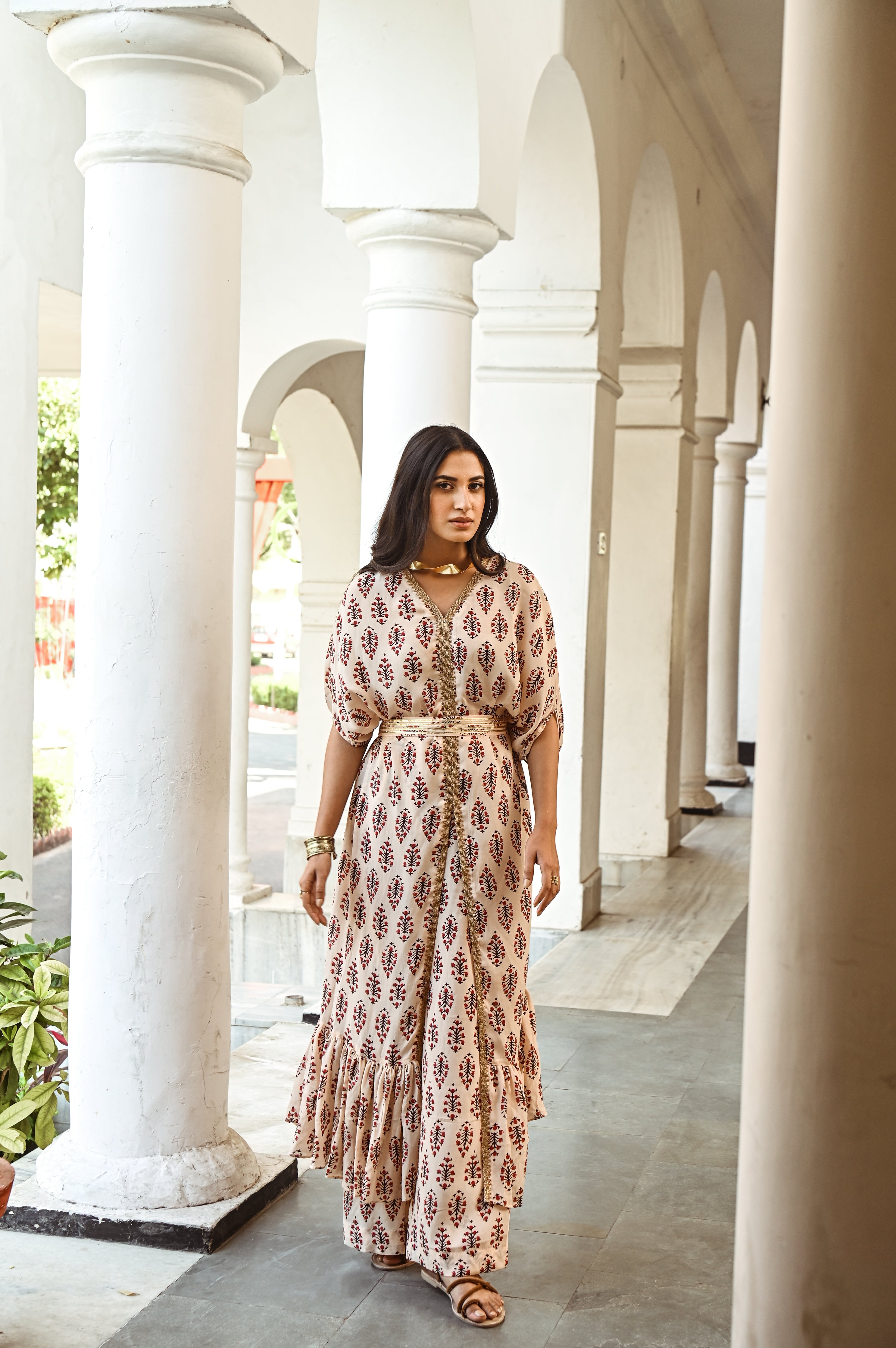 Pure printed crepe kaftan top with matching pants and an exquisite gota belt makes this piece a must have this festive season. Style it with mojaris for a mehndi celebration or sleek heels for an evening soiree.