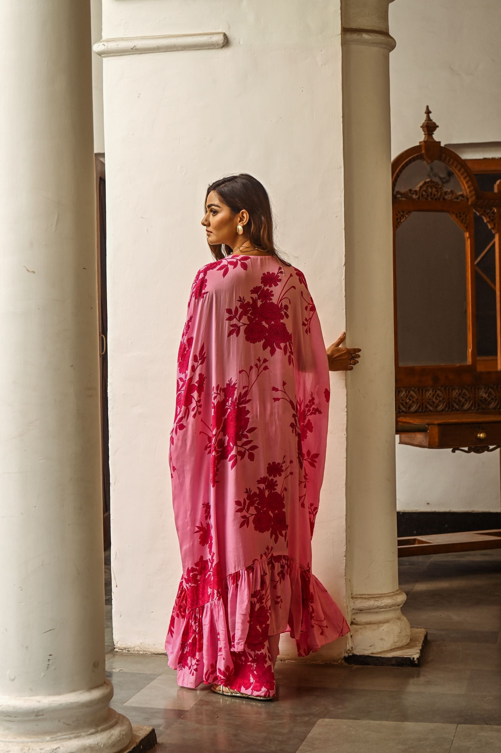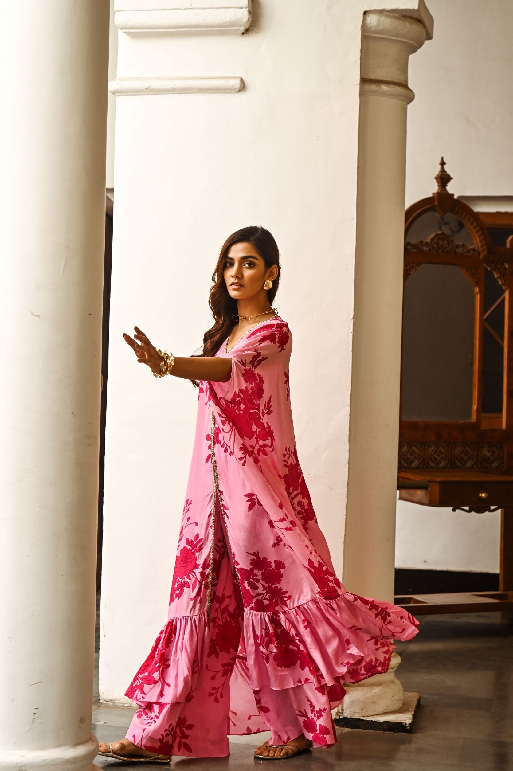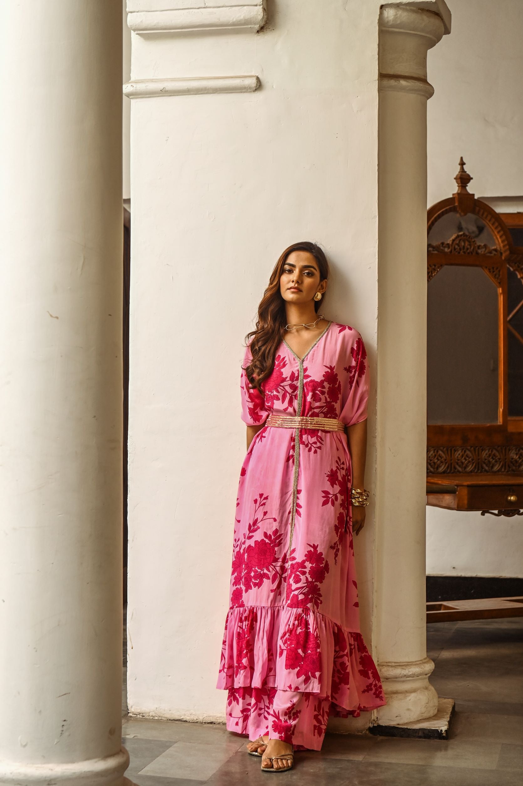 Pure printed crepe kaftan top with matching pants and an exquisite gota belt makes this piece a must have this festive season. A vibrant pink co ord set, thie soft crepe fabric falls beautifully.